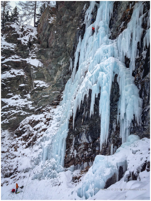 Die direkte Linie am rechten Rand ist härter geworden, da der Zapfen welcher mit dem Boden verbunden ist z.T. abgebrochen ist.. man muss sich nun über etwas dünnes fast leicht überhängendes Eis hochzittern. Nach ein paar Metern ist dann wieder besseres und mehr Eis - auch zum absichern.