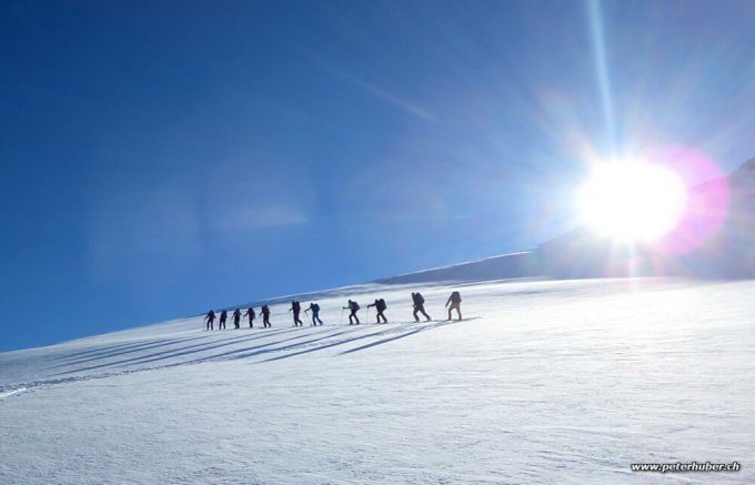 Am Morgen schönes Wetter und wenig Wind - entgegen der Wetterprognose. Auf dem Gipfel kam der Föhn auf. Am Mittag kehrte das Wetter sehr rasch. Gegen 14 Uhr kam dichter Nebel und Niederschlag auf. Schnee hat es am Start in Hüttenberg gerade noch knapp genug. Weiter oben gute Unterlage und zirka 10 cm pulveriger Neuschnee. Bei der Abfahrt tolle Verhältnisse bis auf 1200 m hinunter.
