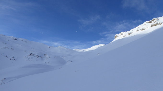 Schnee von Beginn weg perfekter Zustand, ca 10 bis 15cm frischer Neuschnee, perfekt zum Spuren und später dann für die Abfahrt. Alles super eingeschneit, auch in der "Gstrüpp-Region" Dibi, wo es je nach Winter manchmal mehr einer Safari als einer Skitour gleicht. Wir waren in diesem Zeitfenster die einzigen, welche die Abfahrt via Rotenbalm wählten - wir bereuten es nicht, im Gegenteil. Alles First Lines und keine Setzungsgeräusche. Erheblich über 1800m absolut korrekt, darunter mit Vorsicht (Abstände) ein Mässig.