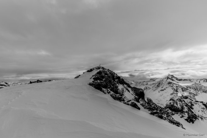Zum grossen Teil abgeblasen, Restspuren noch vorhanden, Blankeis haben wir jedoch kaum angetroffen. Letztes Stück zum Gipfel problemlos. Die Abfahrt teils mit Pulver, teils harsch ohne Bruch.