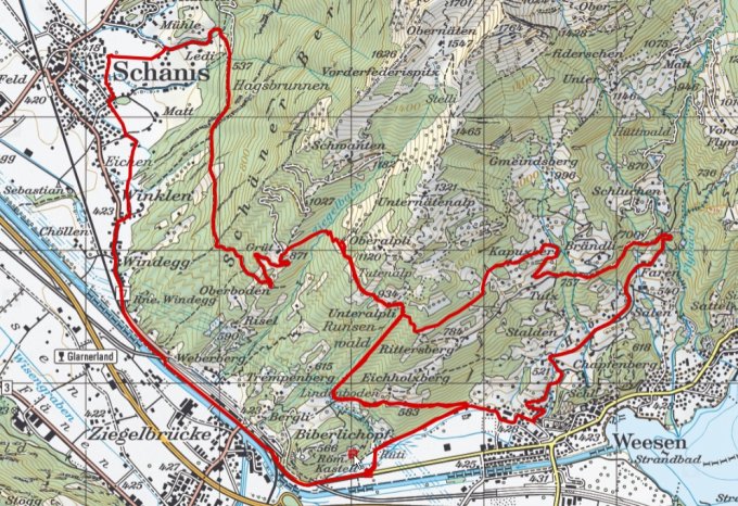 Ab Wesen Ab Weesen über Gufler, Kaputzberg zur Tutenalp. Abfahrt durch den Runsenwald, Eichholzwald zum Talboden. Am Bahnhof Ziegelbrücke vorbei nach Winkeln, Schänis, Schäner Berg nach Grüt. Nun auf dem Wanderweg zur Ziegelbachbrücke und zu Fuss zur Alpstrasse. Abfahrt durch den Runsenwald und durch den Eichholzwald zum Ausgangspunkt zurück.