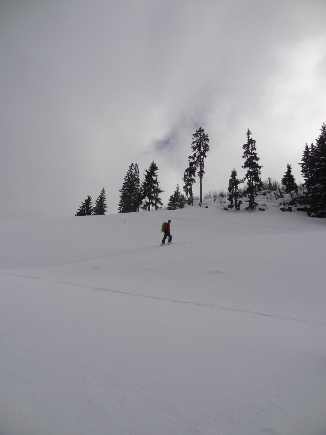 Beim Startpunkt in Zweisimmen sehr wenig bis gar kein Schnee. Da die vorhandenen wenigen Centimeter jedoch recht gut gefroren waren, konnten wir bei Pt. 950 (Stalde) die Skis abziehen. Wenn man mit Skis auch mal ein paar Meter über Gras oder apere Strassen läuft, muss man ab dann die Skis nicht mehr abziehen. Ab ca. 1200 m gute Verhältnisse mit genügend Schnee (man könnte mit dem Auto auch problemlos noch etwas hochfahren um den Schnee zu erreichen, die Strasse war heute quasi aper). Ab Hinder Chumi dann leider alles im stockdichten Nebel... Aber den Gipfel haben wir dann doch noch gefunden.