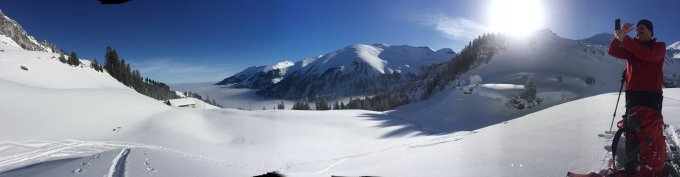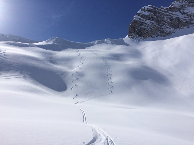 Top, Schnee ab PP Säge. Da so gut haben wir den Schlusshang gerade zweimal gemacht. Wind auf dem Grat.