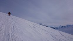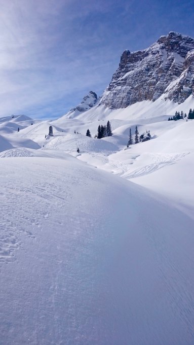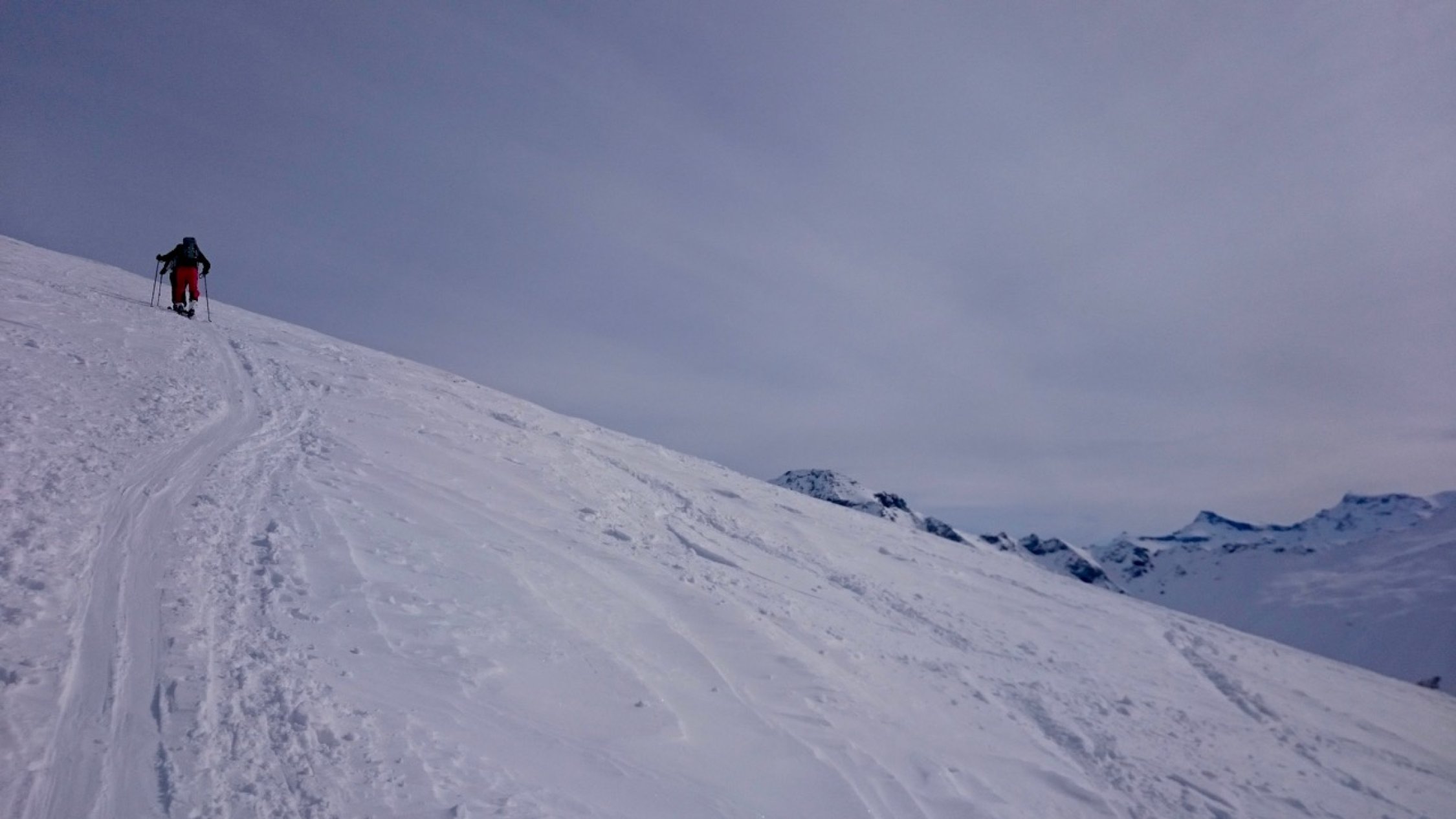 Der Südwesthang des Rauflihorn wurde etwas aufgeweicht, ab Grimmifurggi dann Pulver bist fast ganz unten. Ab 1500m merklich weniger Schnee, hart zu fahren und ein paar wenige Steine sichtbar.