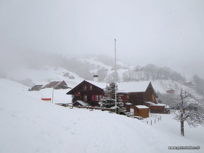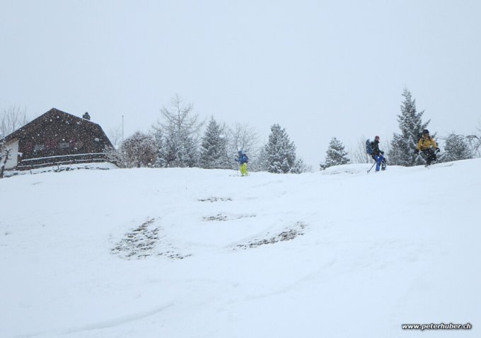 Anhaltender Schneefall, kühl, wenig Wind. Trotzdem war die Sicht recht gut. Auf der ganzen Route hat es eine gute Unterlage mit unten 5 cm, oben zirka 15 cm Neuschnee drauf. Bis auf den Rücken bei 2000 m keine Windverfrachtungen. Darüber ist der Rücken recht abgefegt.