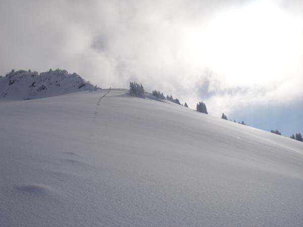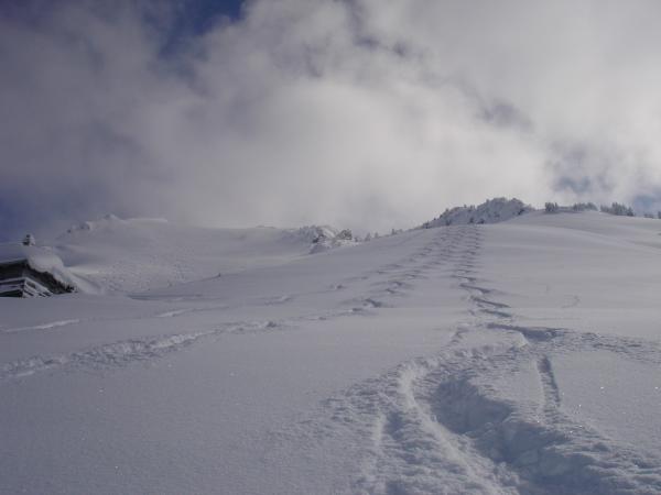 Soviel Schnee haben wir auf der Tagweid noch nie gesehen. (ca. 1.00m Neuschnee) Da der Hang unter 27 Grad Neigung hat, ist die Lawinengefahr gering.