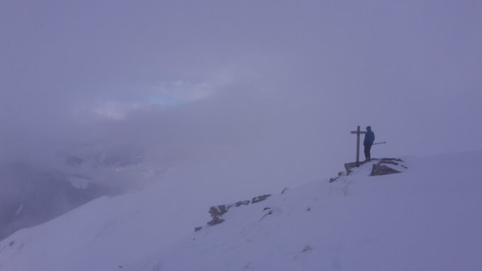 Just auf dem Gipfel angekommen, klarte auch die Sicht auf und wir konnten dann auf der anschliessenden Abfahrt einige schöne Pulverschwünge geniessen. Nordabfahrt und Tschipparälle haben wir ausgelassen.