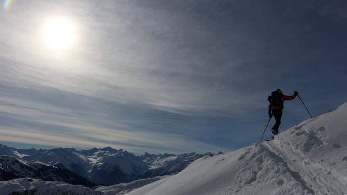 Abfahrt über die Nordflanke, dort eher wenig Schnee und ruppiger Untergund, teilweise auch Gras und/oder Steine.