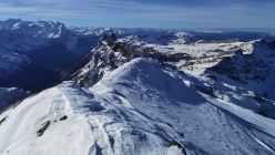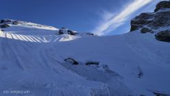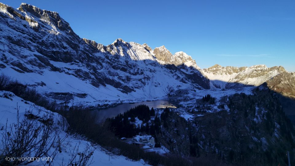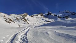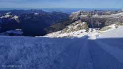 Im Abstieg über den Grat bis zur Spur des Pistenfahrzeugs richtung Kleintitlis, folgt man den Aufstiegsspuren. Der steile Abstieg in der Spur des Pistenfahrzeugs vom Kleintitlis hinunter zur Station Rotstöckli - Titlis Glacier Park auf 2’860m und weiter zur Talstation des Skilifts ist gut zu gehen mit Schneeschuhen. Der Abstieg zwischen Unter- und Ober Rotegg ist sehr steil und nicht einfach zu gehen mit Schneeschuhen in teils Bruchharsch, teils verblasenen Pulver. An der Seilbahnstation Stand 2’428m vorbei, hinunter bis Trübsee 1792m, der Aufstiegsspur folgend, wird der Schnee zunehmend nass. Ab Station Trübsee, rechts am See vorbei bis P1772 und weiter bis etwa 1’600m liegt Schnee, jedoch zuwenig für Schneeschuhe. Über Untertrübsee zurück nach Engelberg, ist der Weg schneefrei und trocken.