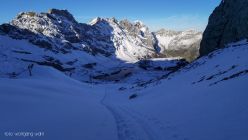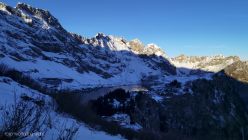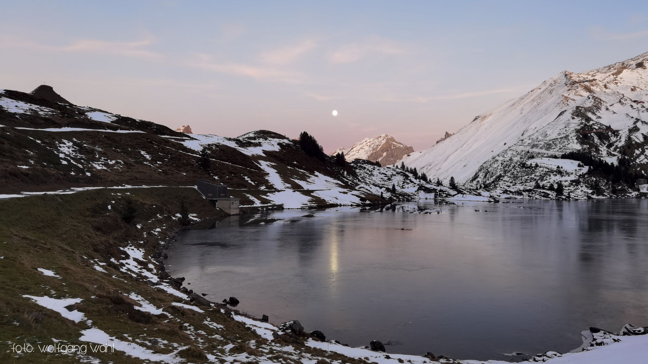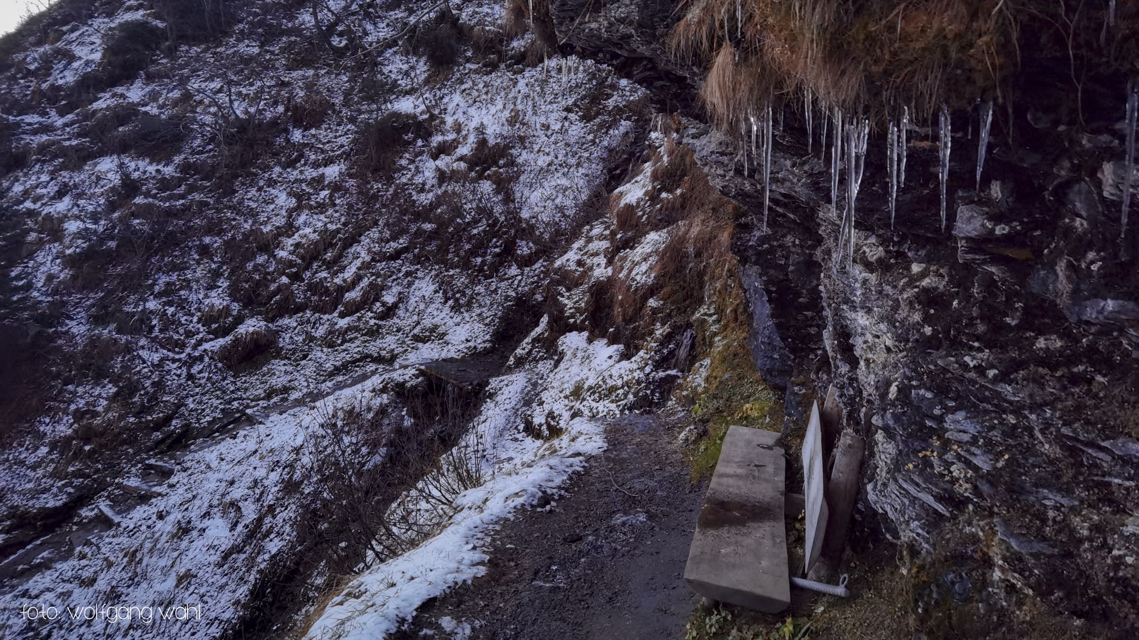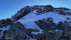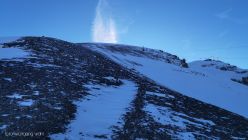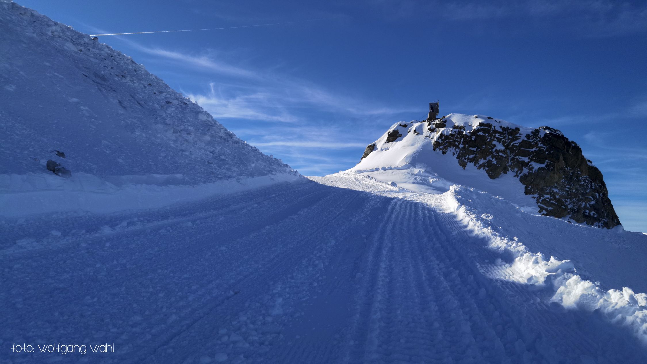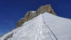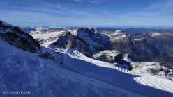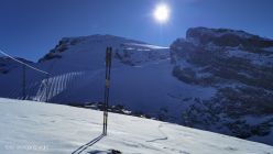 Vom kostenpflichtigen Parkplatz der Seilbahnstation Engelberg (10.-- / Tag) auf 997m, bis Seilbahnstation Trübsee 1’792m ist der Weg gut markiert und mehrheitlich trocken und gut zu gehen, die Wegfindung mit Stirnlampe ist einfach. Kurz vor Station Trübsee, ab 1’600m, liegt Schnee und der Weg ist teils gerforen und eisig. Ab Station Trübsee ist die Schneedecke durchgehend Pulver auf harter Unterlage, bis Bergstation Laubersgrat 2’455m. Die Schneeschuhe habe bereits in Trübsee montiert, musste sie jedoch nach der ersten Kurve auf 1’860m für rund 100m wieder ausziehen. Der Aufstieg über die Unter Rotegg ist anfangs schneefrei und gute Pfadspuren sind zu erkennen, weiter weisen blaue Pfeilmarkierungen den Weg über den schneebedeckten Grat hoch zu P2751, die weiss-blau-weissen Markierungsstangen sind nicht mehr vorhanden. Die Rotegg, von der Bergstation Laubersgrat bis zur Talstation des Skilifts kann nicht mit Schneeschuhen gegangen werden. Die Leiter über die Südrampe und die neu angebrachten Stahlseile daneben im Abstieg zum Gletscher sind schneefrei und trocken. Zur Bergstation des Skiliftsauf 2’950m und anschliessend an der Stotzig Egg vorbei richtung Kleintitlis steigt man am besten in der Spur des Pistenfahrzeugs hoch. Der Schnee am Grat hoch zum Gipfel des Titlis ist meist hart und gut tragend, auf der Nordseite aber teils knietiefer verblasener Pulver. Etwa 100m vor dem Gipfel müssen die Schneeschuhe deponiert werden, der Weg führt über Felsen und vor dem Gipfel nordseitig steil durch teils hüfttiefen Schnee. Am Gipfelaufbau sind ebenfalls neue Stahlseile montiert.