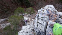 Die Route war bis auf wenige Ausnahmen heute Morgen schon wieder trocken. Nach einigen Seillängen zeigte sich die Sonne, die linke Südwand der obersten Seillänge (6a+) konnte man im t-shirt Klettern. Der Abstieg im schattigen Wald ist mässig steil und eher rutschig, es liegt viel Laub. Das Bächlein war heute zu einem kleinen Bach angeschwollen, das uns noch leichte Abstiegskletterei in feuchtem Fels bescherte (2x 5m).