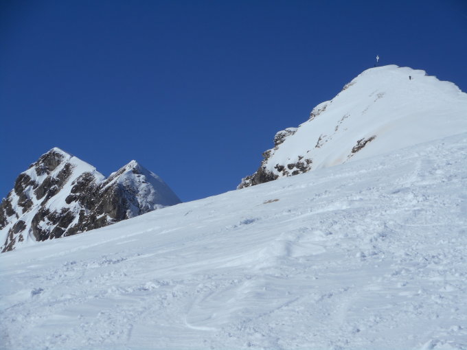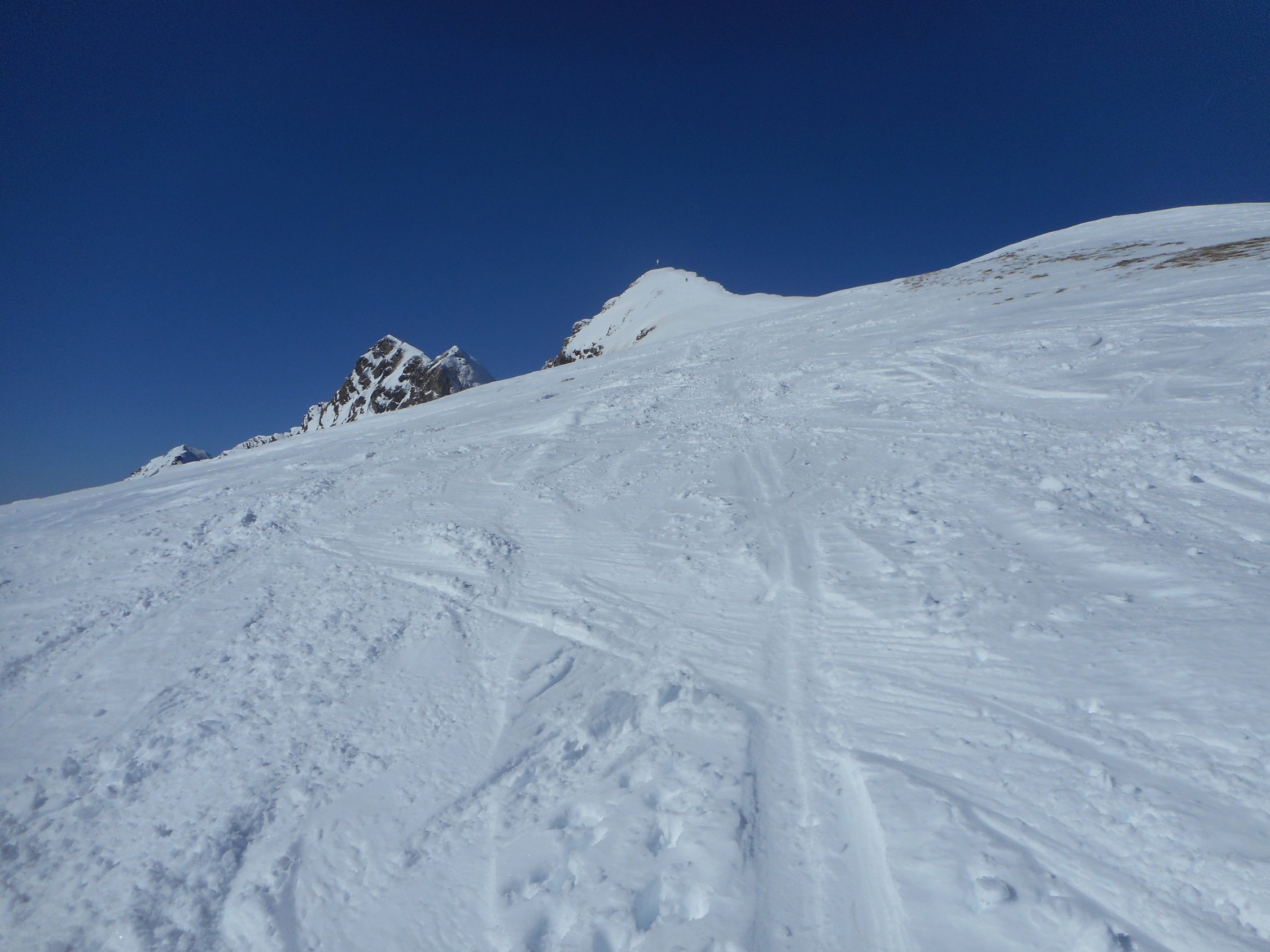 Aufstieg: Bestens angelegte Aufstiegsspur. Ein danke schön an die Suisse Romands. Der Aufstieg vom Col de Seron 2153m auf den Gipfel im teilweise tragenden Sulzschnee.