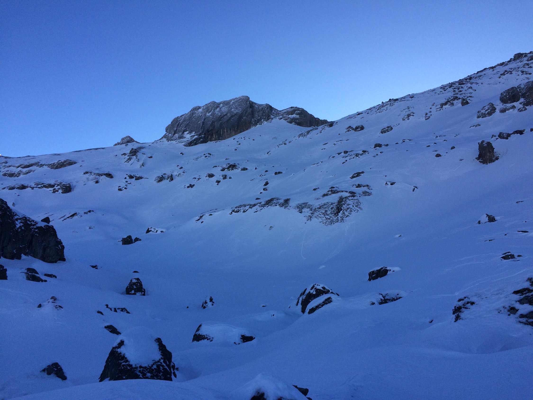 In der Nacht auf Sonntag hat es wohl bis auf 1800müM hochgeregnet. Der Schnee war auf dieser Höhe jedenfalls stark glasiert und gedeckelt. Der Wind war auch im Spiel und hat das ganze noch abgerundet. Aufstieg von der Engstligenalp bis zum Chindbettipass somit mehr oder weniger gedeckelt. Gerade noch ohne Harrscheisen möglich.