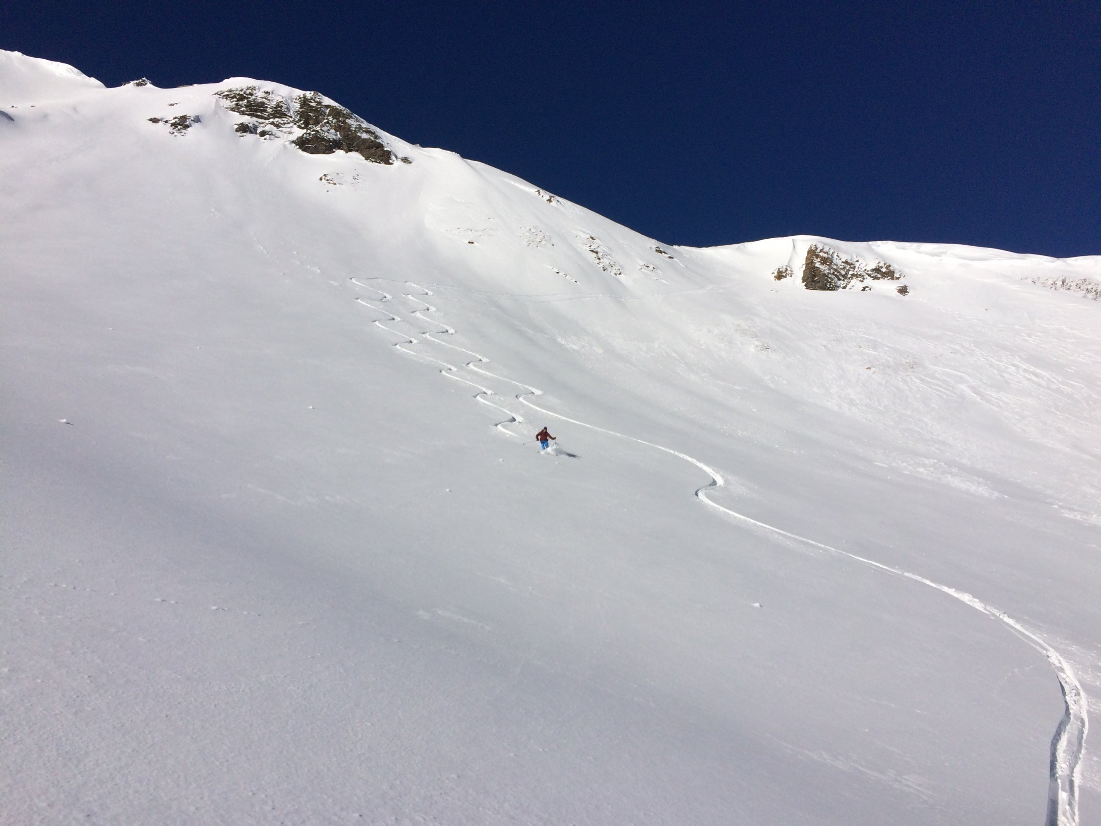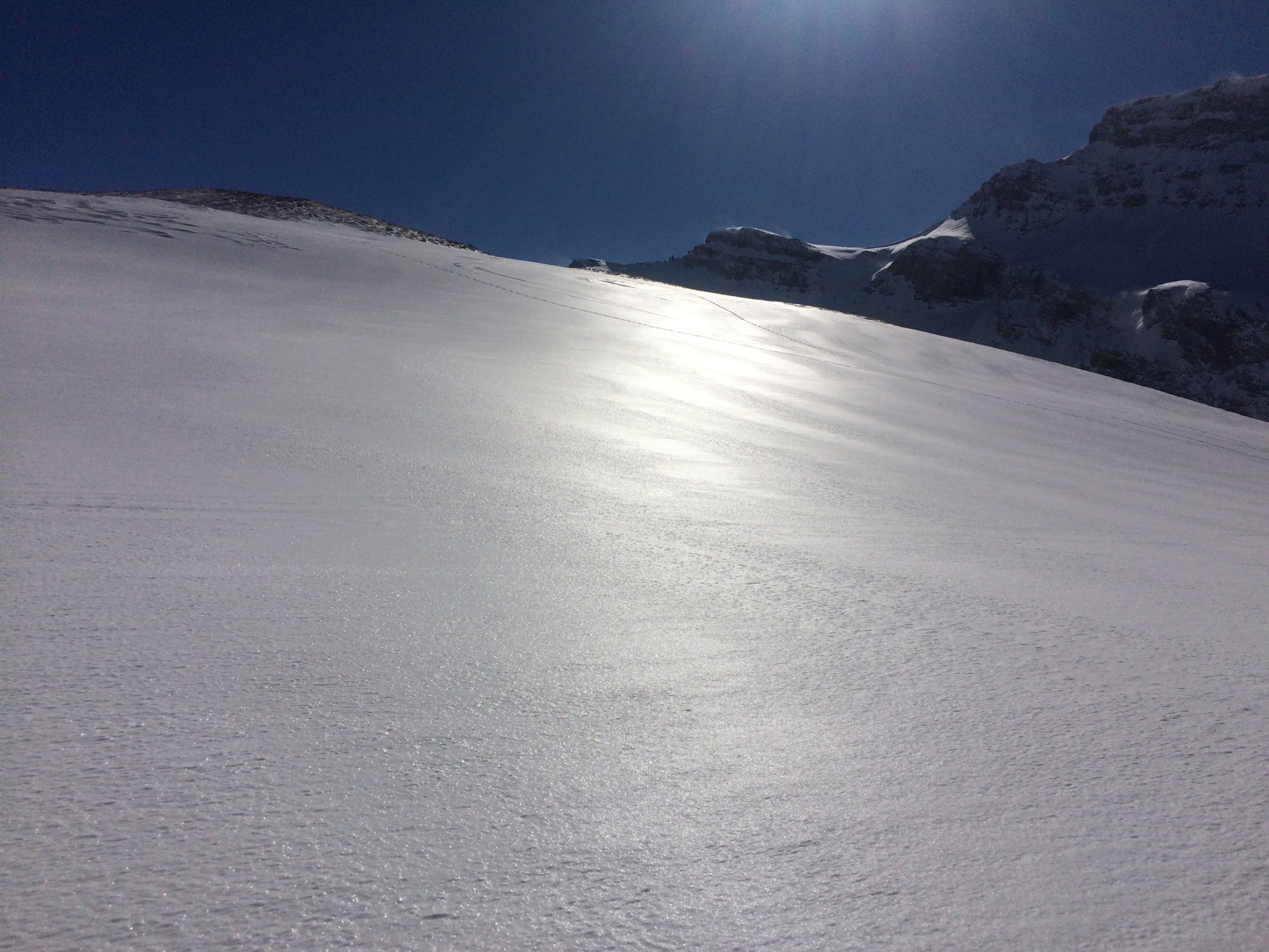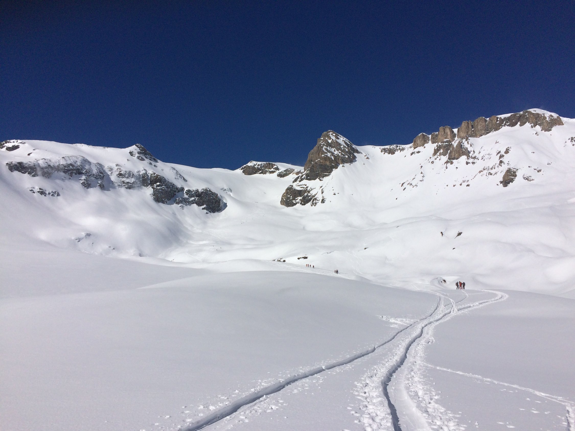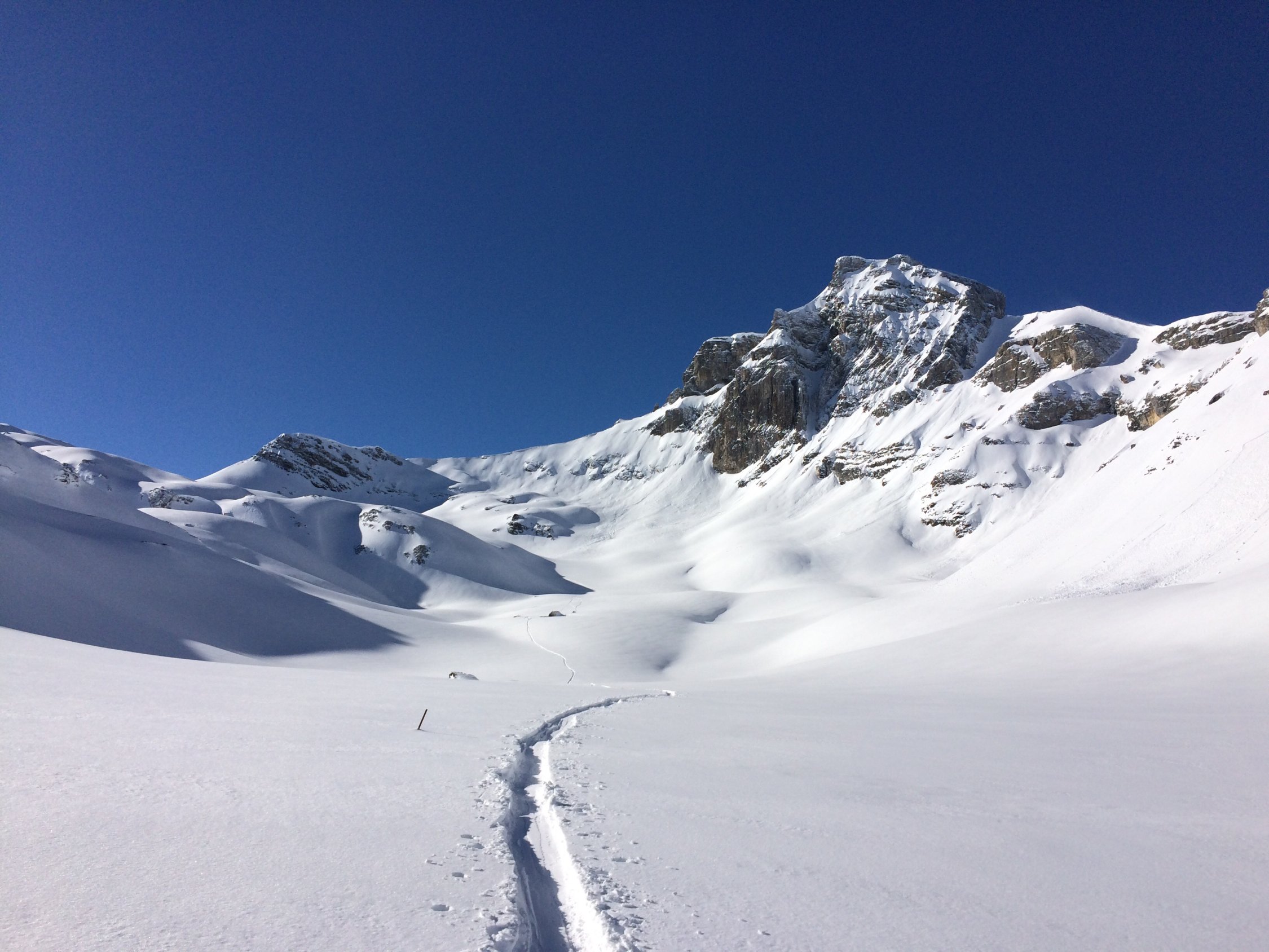 Abfahrt ins Tälli durch gepressten Pullverschnee. Die Sonne hat dem Schnee in diesem Hang heute bestimmt noch einen schönen Deckel verpasst. Aufstieg zur Roten Totz Lücke in herrlicher Umgebung. Wira waren ganz alleine unterwegs.