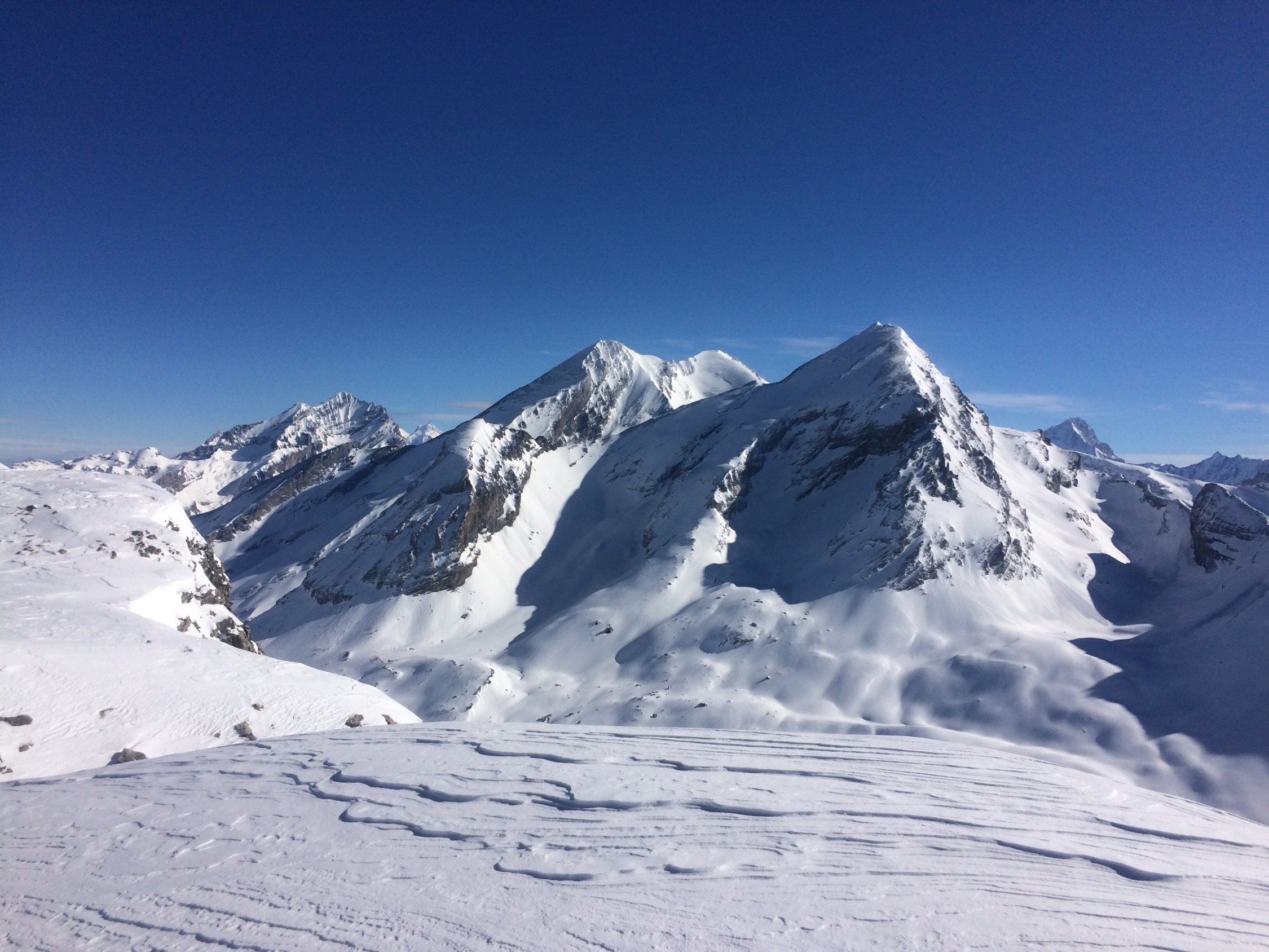 Überquerung vom Mittelgipfel zum Grossstrubel mit Orkanböen. Alles stark abgeblasen und pickelhart.