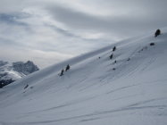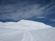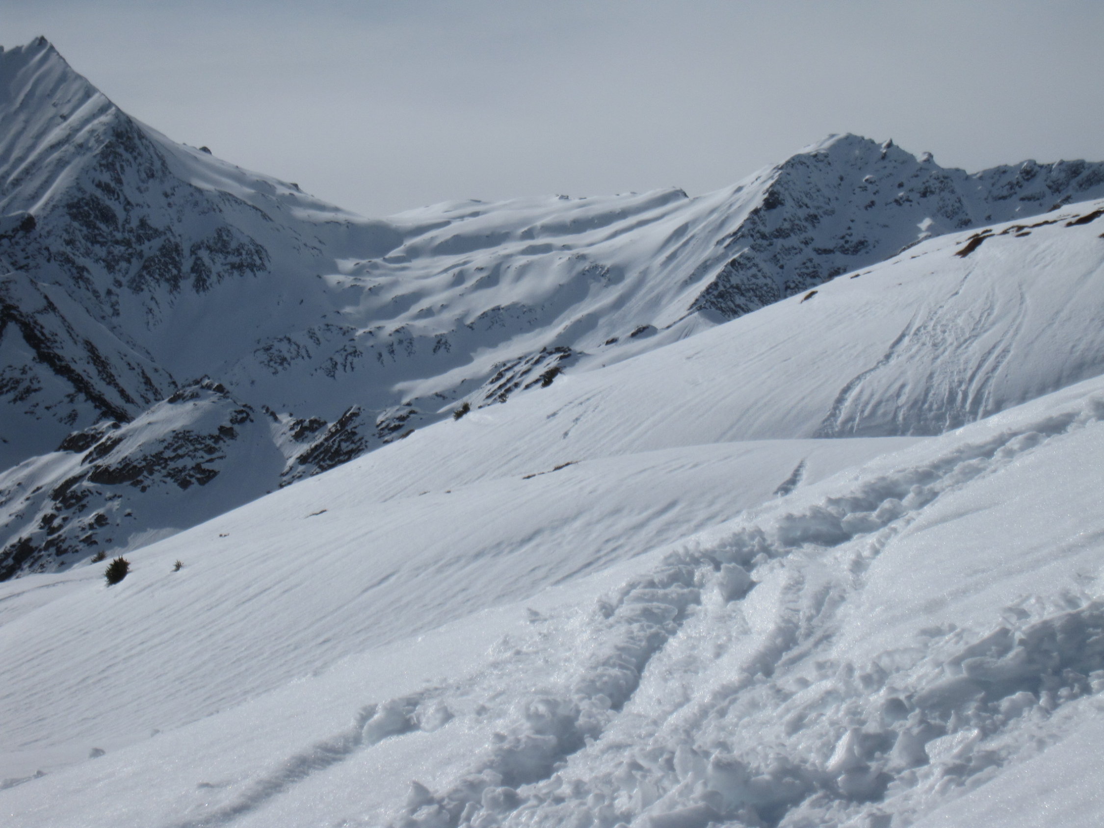 Bei Start Schnee noch harstig und tragend; bei Abstieg sulzig bis pflotschig, unten sogar mit Schneeschuhen noch anstrengend. Immer noch relativ wenig Schnee für diese Jahreszeit.
