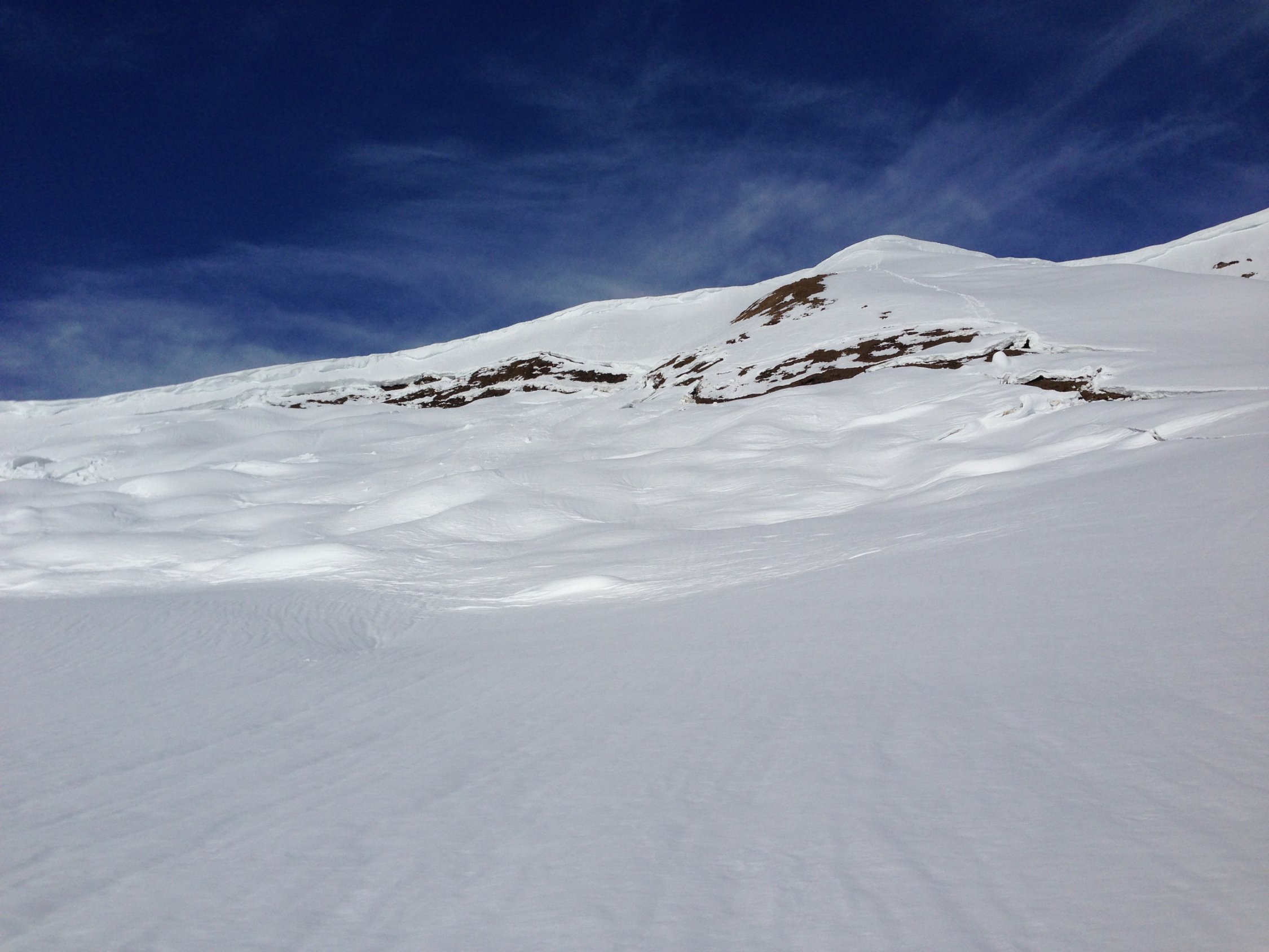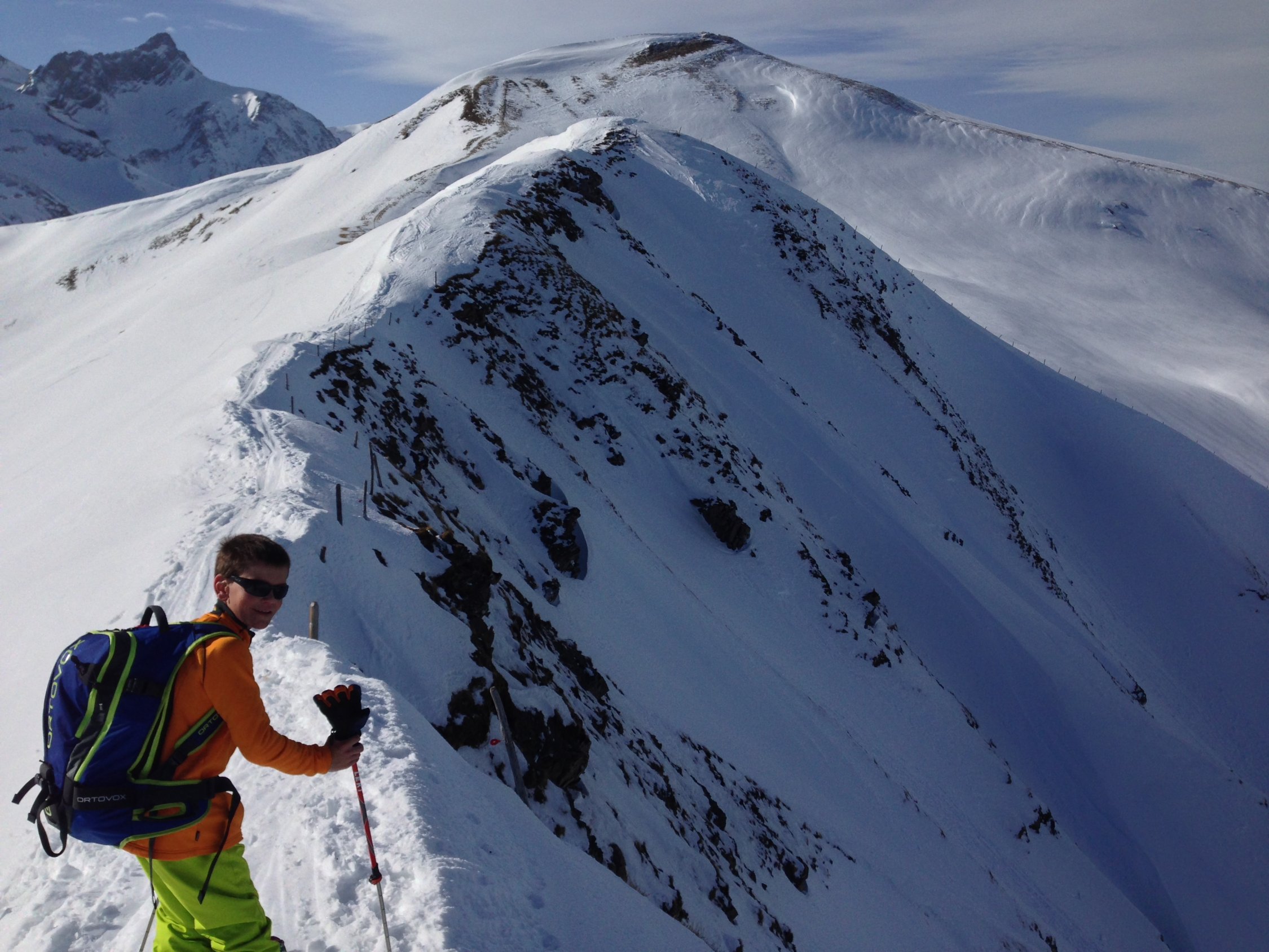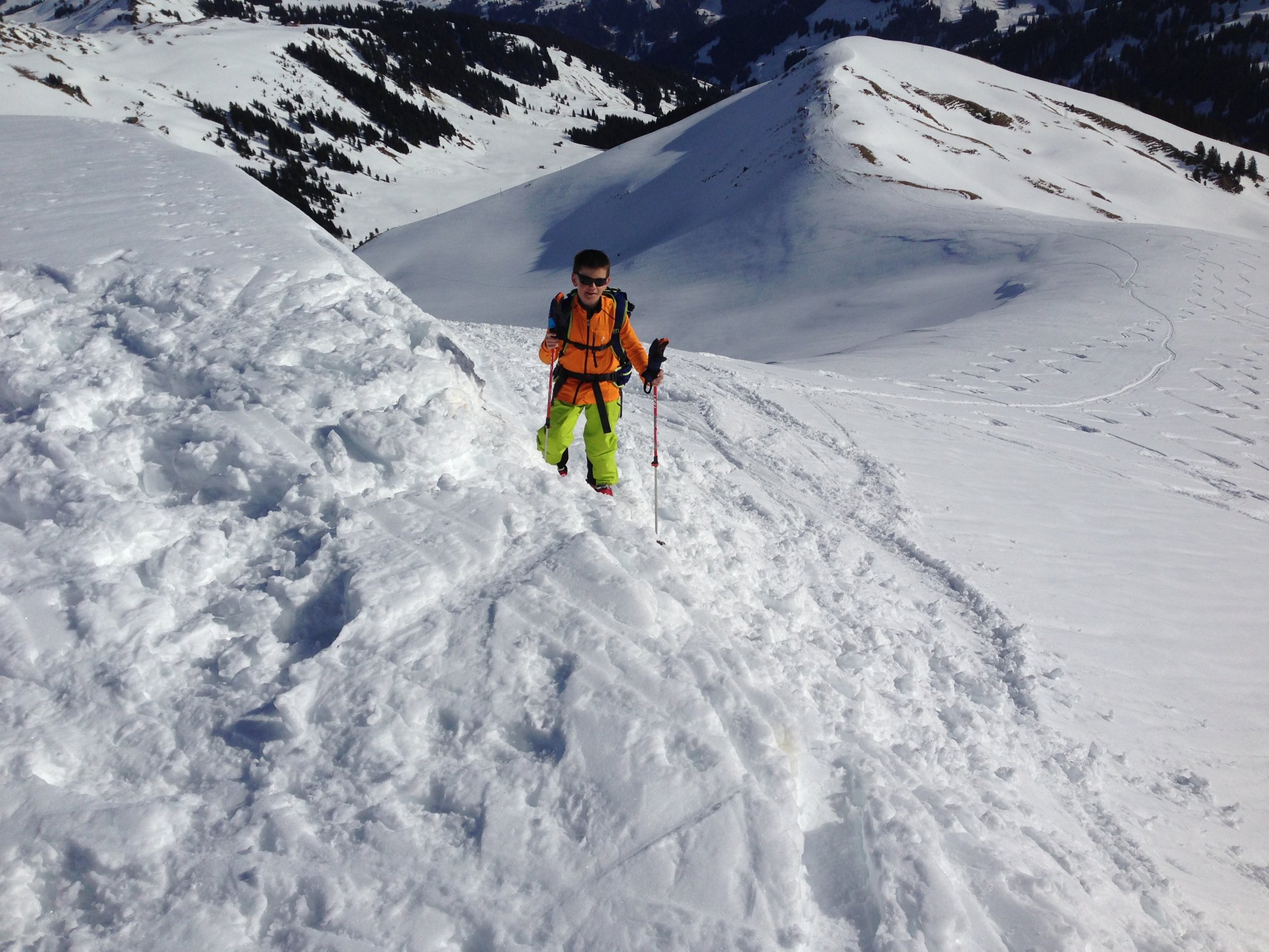 Am Morgen rund Null Grad und schönes Wetter d.h. blauer Himmel mit etwas Wind. Bei der Stübleni ist ein grösserer Leintuchrutsch heruntergekommen, d.h. die ganze Seite hat sich leintuchartig als Nassschneerutsch in Bewegung gesetzt. Dank den tiefen Temperaturen war heute Morgen die Flanke jedoch stabil. Trotzdem sind wir der Aufstiegsspur von Westen auf die Stübleni aufgestiegen und dann über den Grat zum Rothorn transferiert. Der Gipfel des Rothorns war abgeblasen. Auf dem Gipfel hat es noch grosse Schneeverwehungen und Wächten. Darum haben wir uns dazu entschieden über die apere Seite zu Fuss auf den Gipfel zu steigen. Die Abfahrt war, dank dem tragenden Deckel mit einer Sulzschicht, sehr gut zu fahren. Der Gegenaufstieg auf den Pörisgrat war gut gespurt. Die Abfahrt nach Pöris wurde der Schnee immer wie schwerer. Trotzdem hat es noch gut Schnee bis ins Pöschenried. Dank dem Schlittelshuttel-Bus für Schlittler vom Betelberg kommt man kostengünstig zurück an die Lenk.