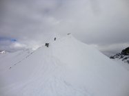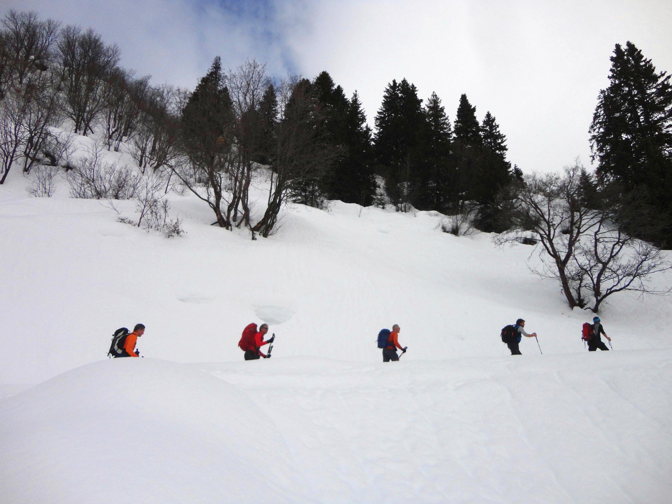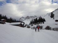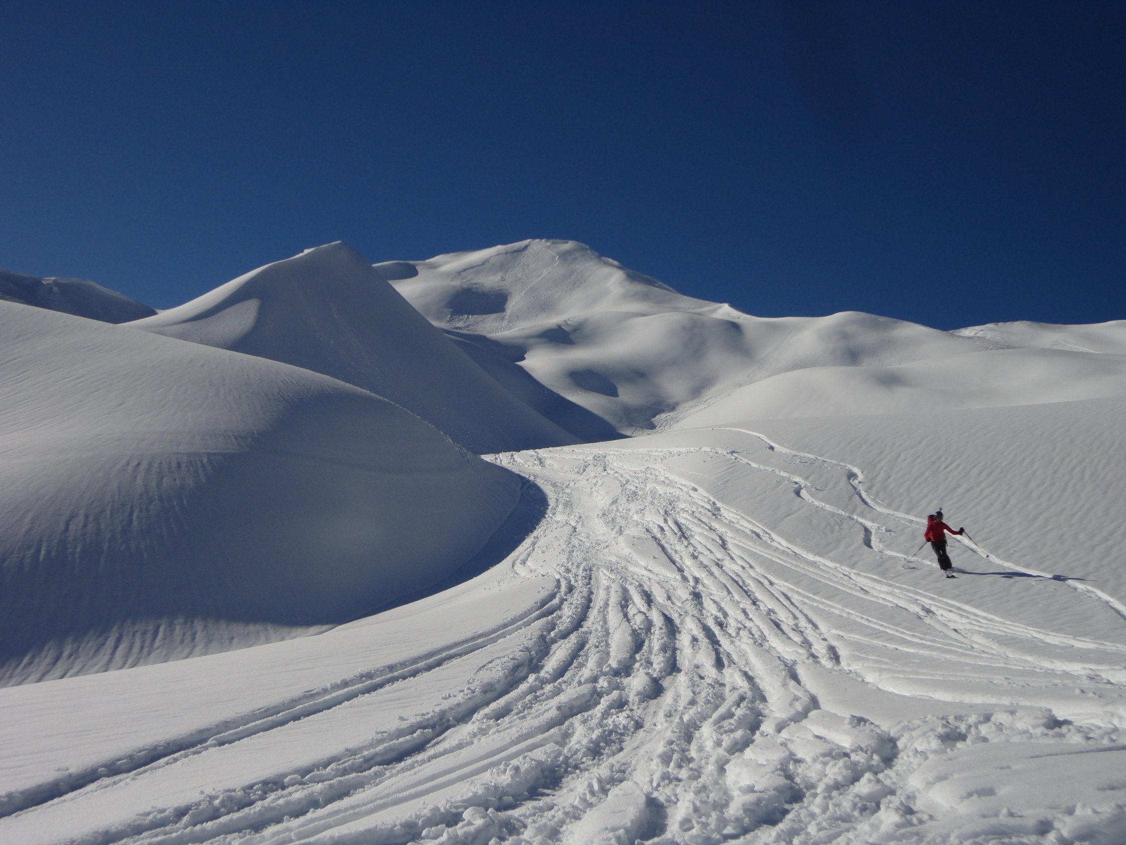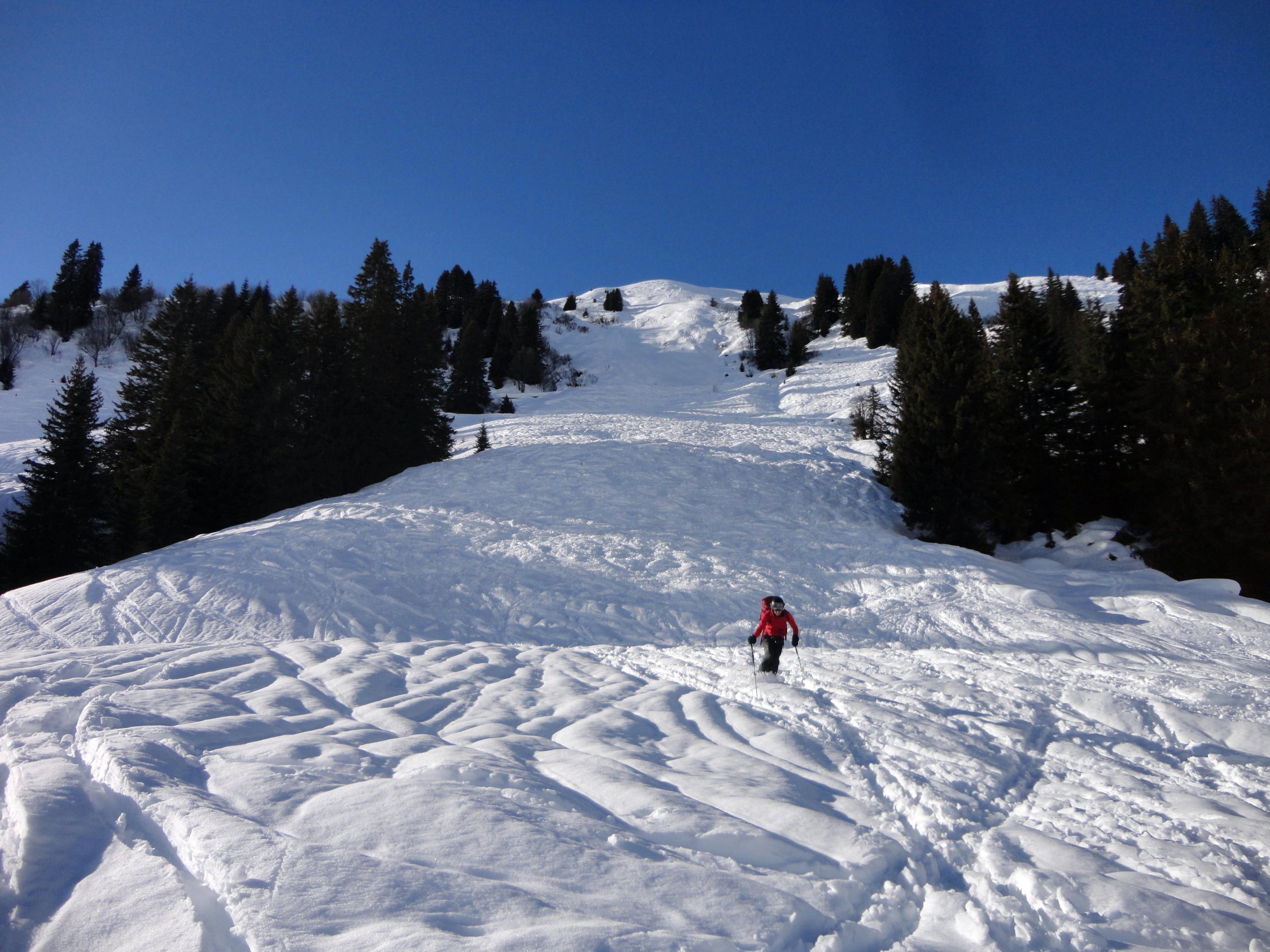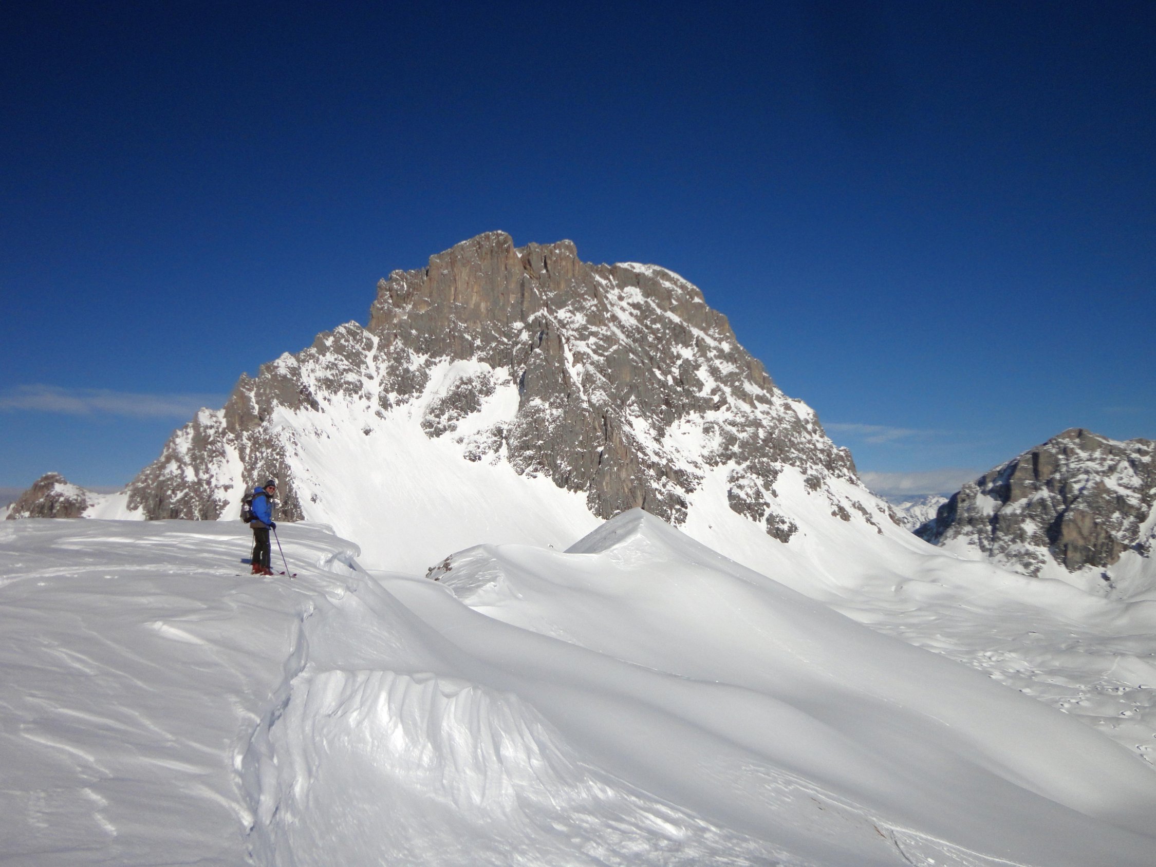 Wir sind dann abgefahren bis kurz vor Obersäss und nach Wetterbesserung noch Richtung Schafberg bis zur Verflachung am Ostkamm aufgestiegen (etwa 2.300 m). Am Schafberg grosses Schneebrett in der Südflanke, ging vermutlich schon in den Tagen vorher ab. Ostgrat im oberen Teil sehr eingeweht; kurz bevor wir zum Kamm kamen, wurde etwas unterhalb des Gipfels von Tourengehern ein Schneebrett ausgelöst, welches vom Grat weg in beide Richtungen rutschte und glücklicherweise nur Materialverlust zur Folge hatte.