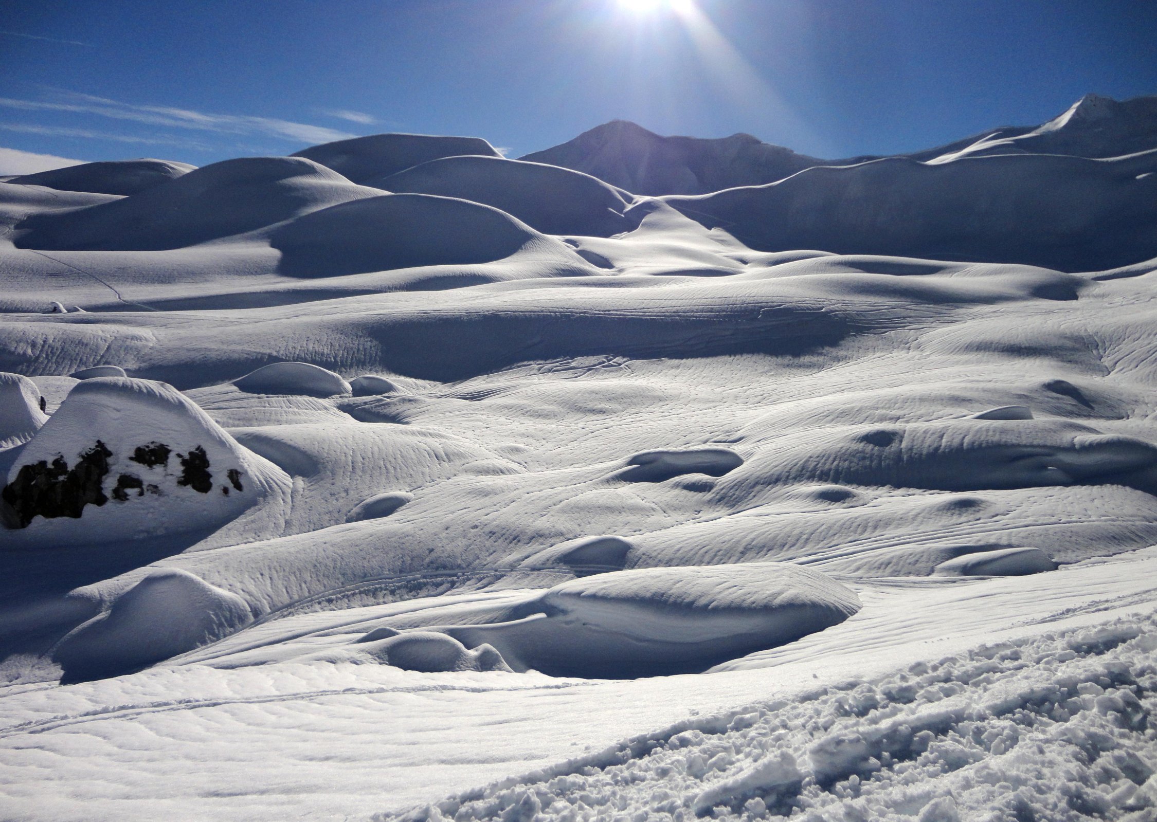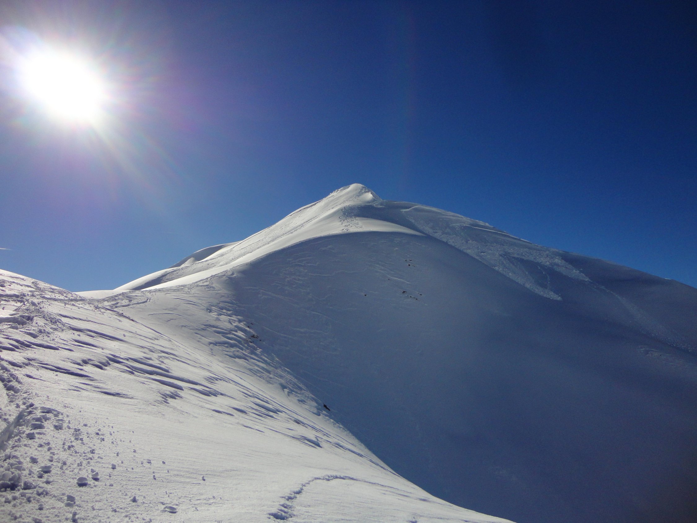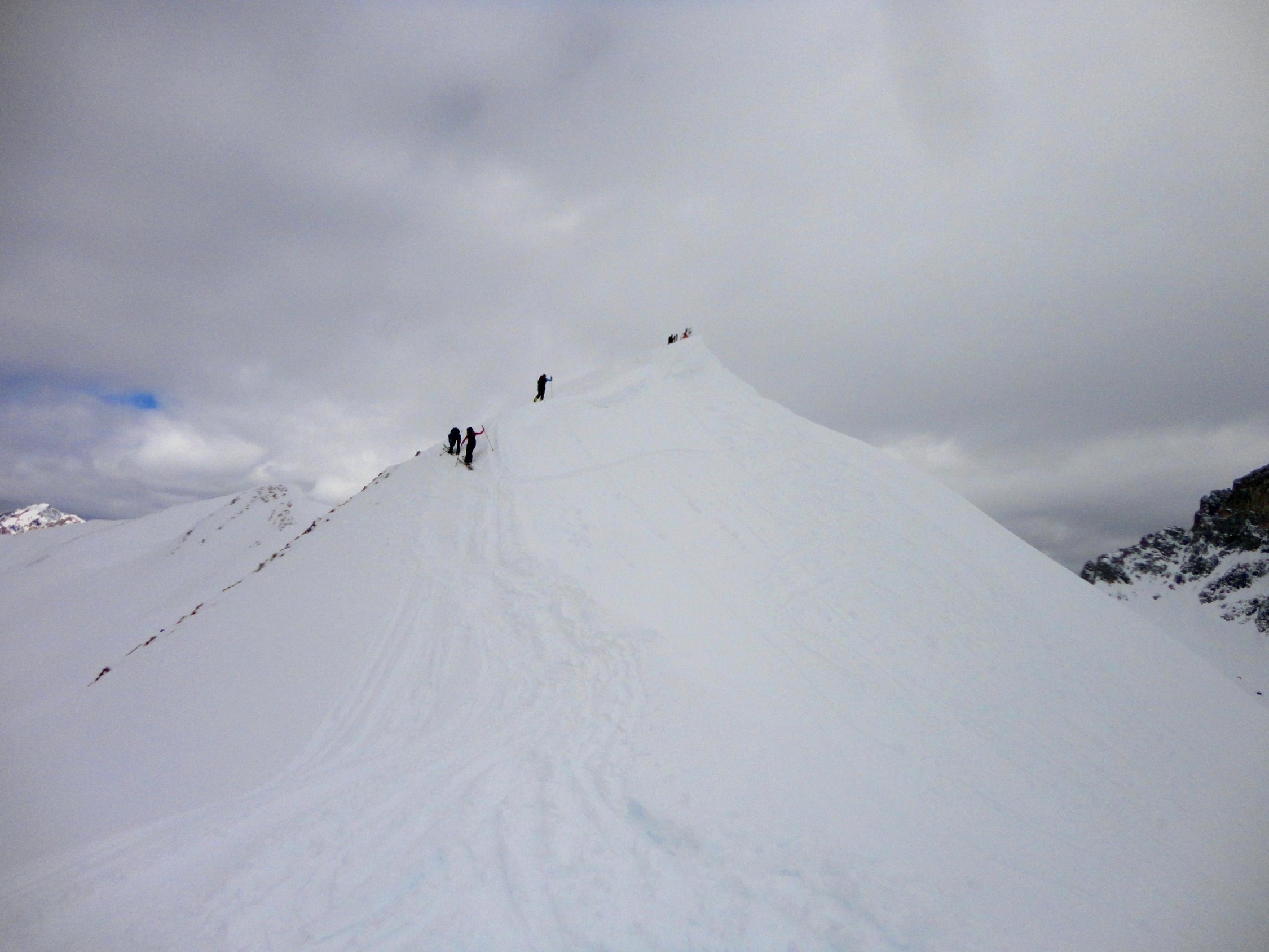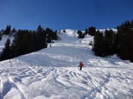Abfahrt im nassen Schnee zwar alles andere als genussvoll, aber doch nicht ganz so schlimm wie erwartet. Der Wetterwechsel innerhalb von 10 Minuten von grau, trüb und diffus zu Sonne, blauem Himmel und fast wolkenlos war faszinierend. Entgegen den angekündigten Orkanböen schon morgens fast kein Wind.