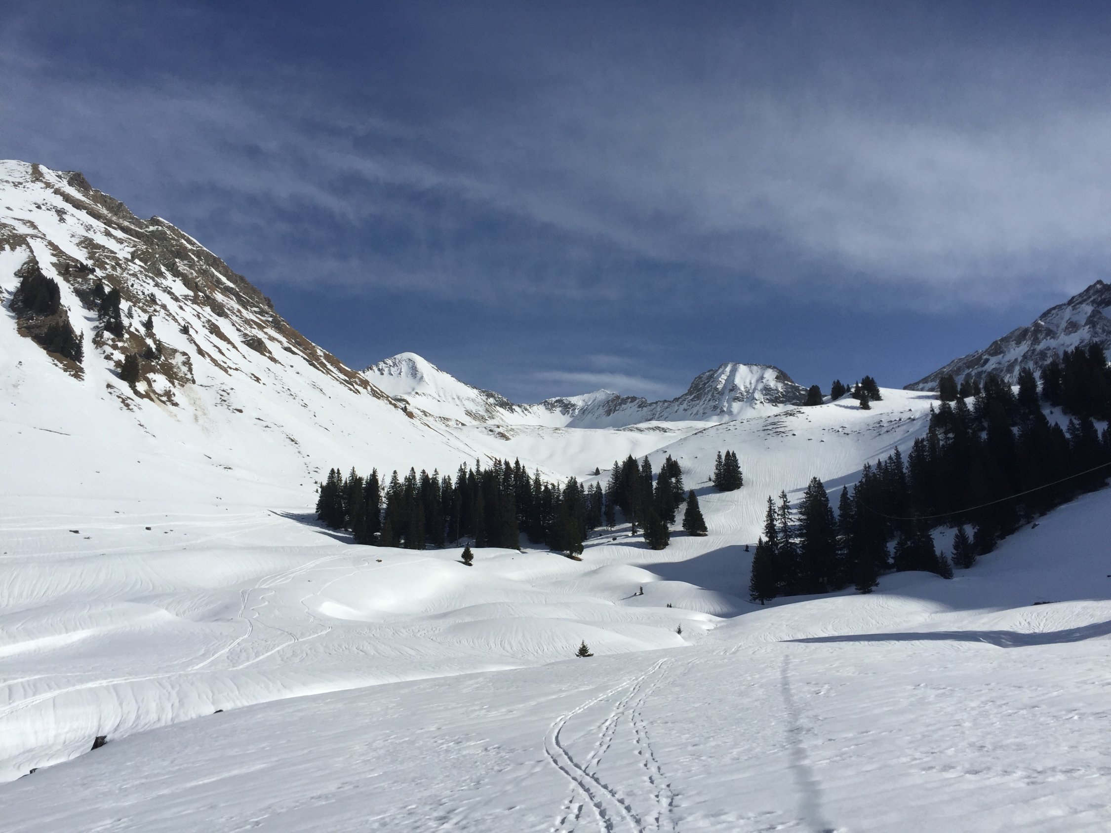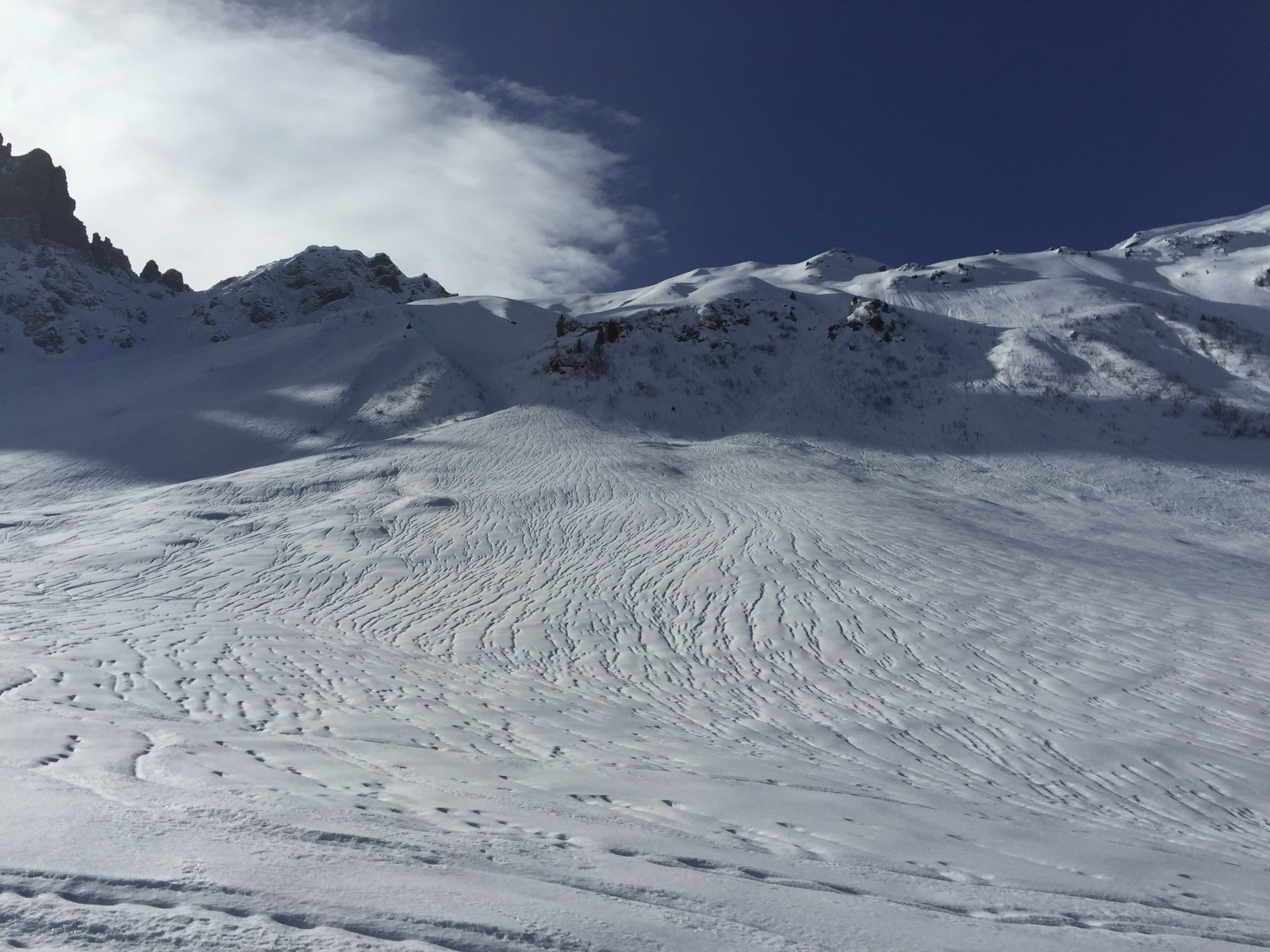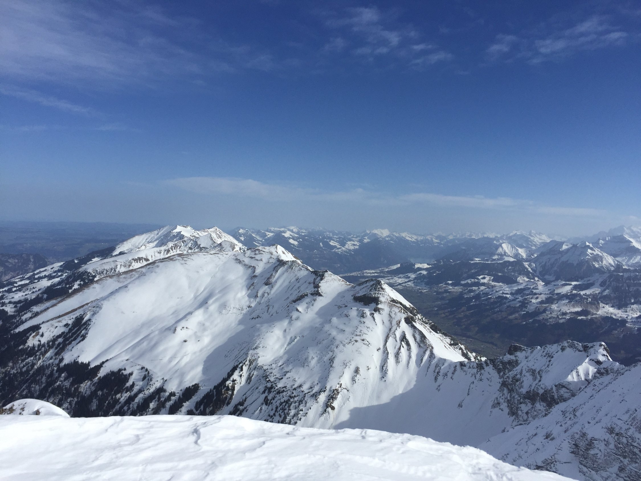 Trotz des warmen Wetters recht gute Verhältnisse. Gute Aufstiegs-Spur bis auf den Gipfel. Direktabfahrt vom Gipfel recht ordentlich. Auf dem Gipfel starker Wind aus SW.