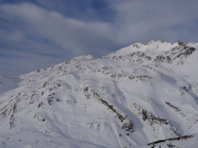 Glasige Aufstiegsspur, die sich durch den teils lichten Schnee schlängelt. Von Pulver keine Spur,bei der Abfahrt kam es zum einen und anderen Steinkontakt.