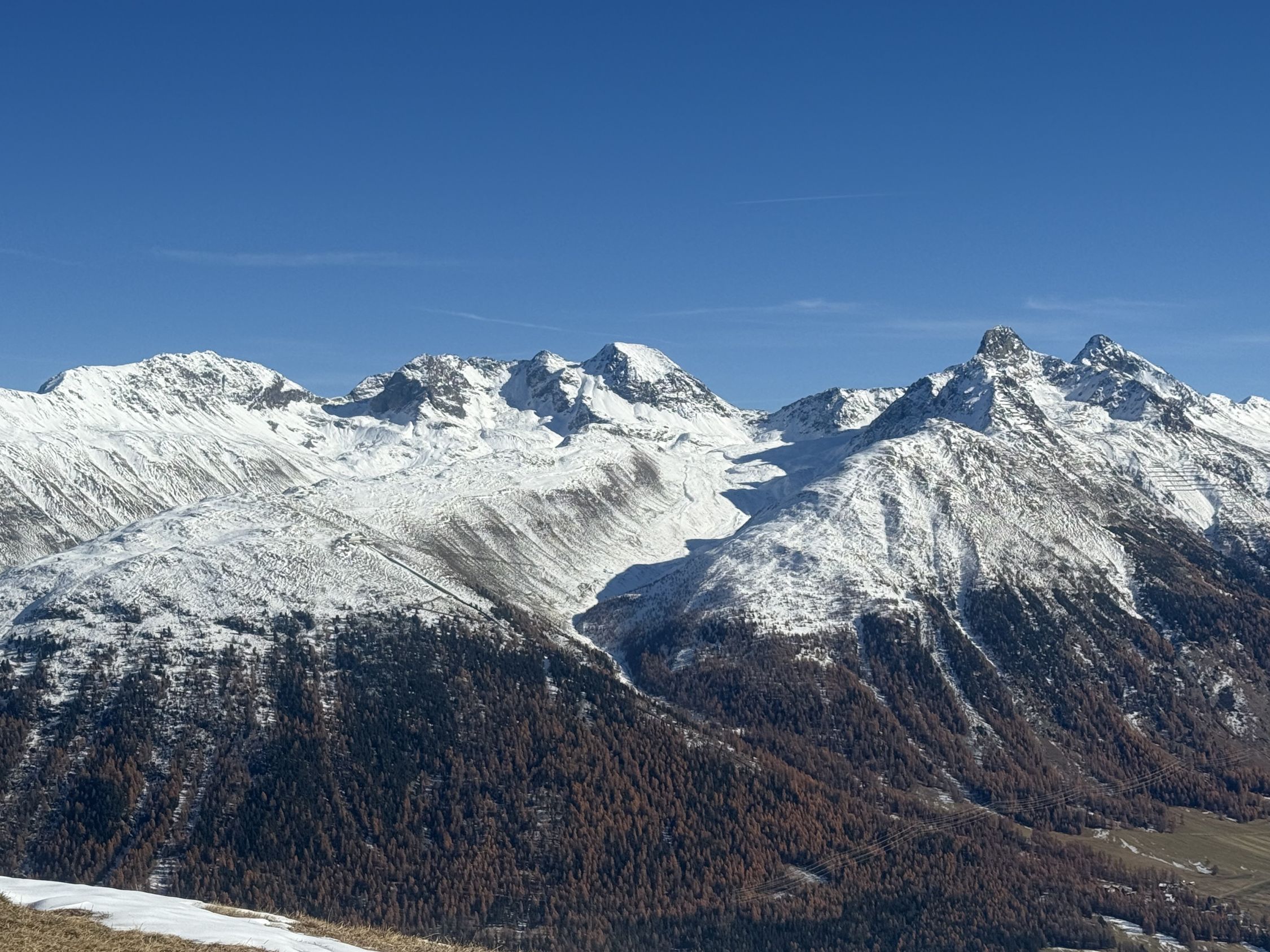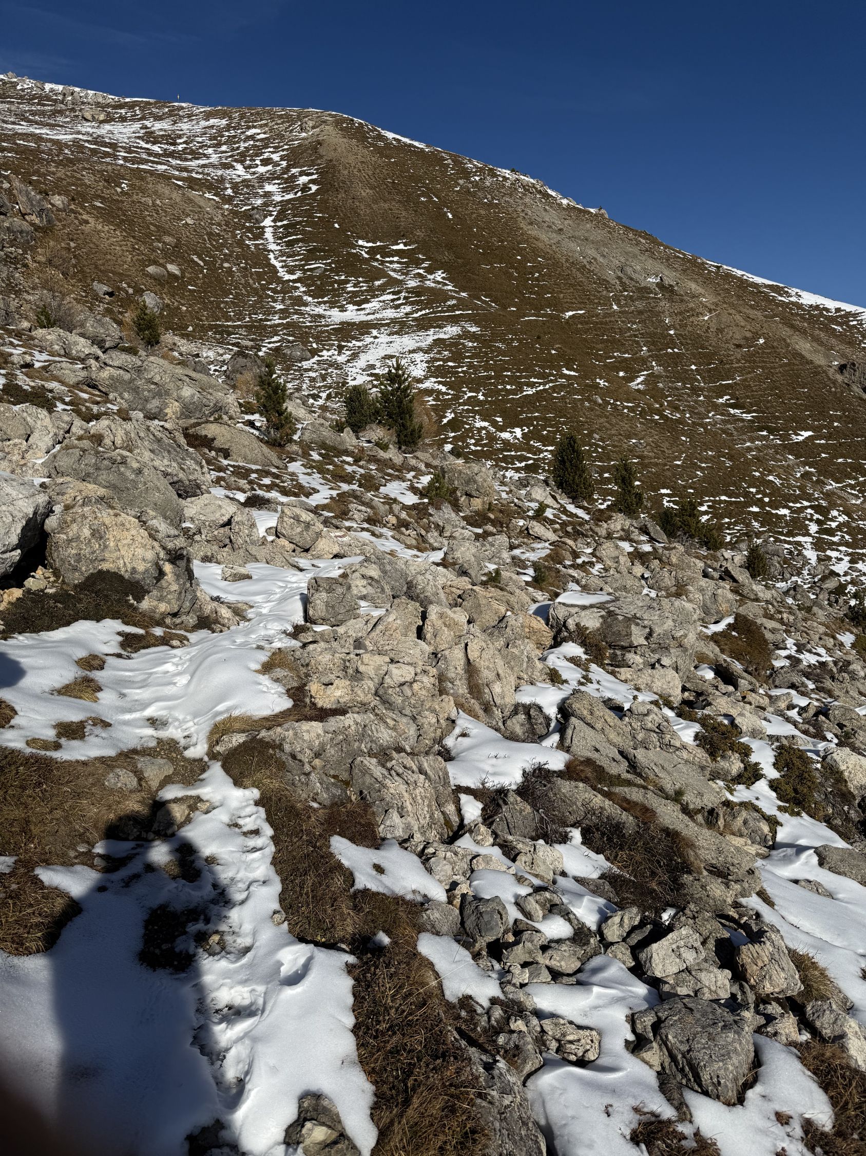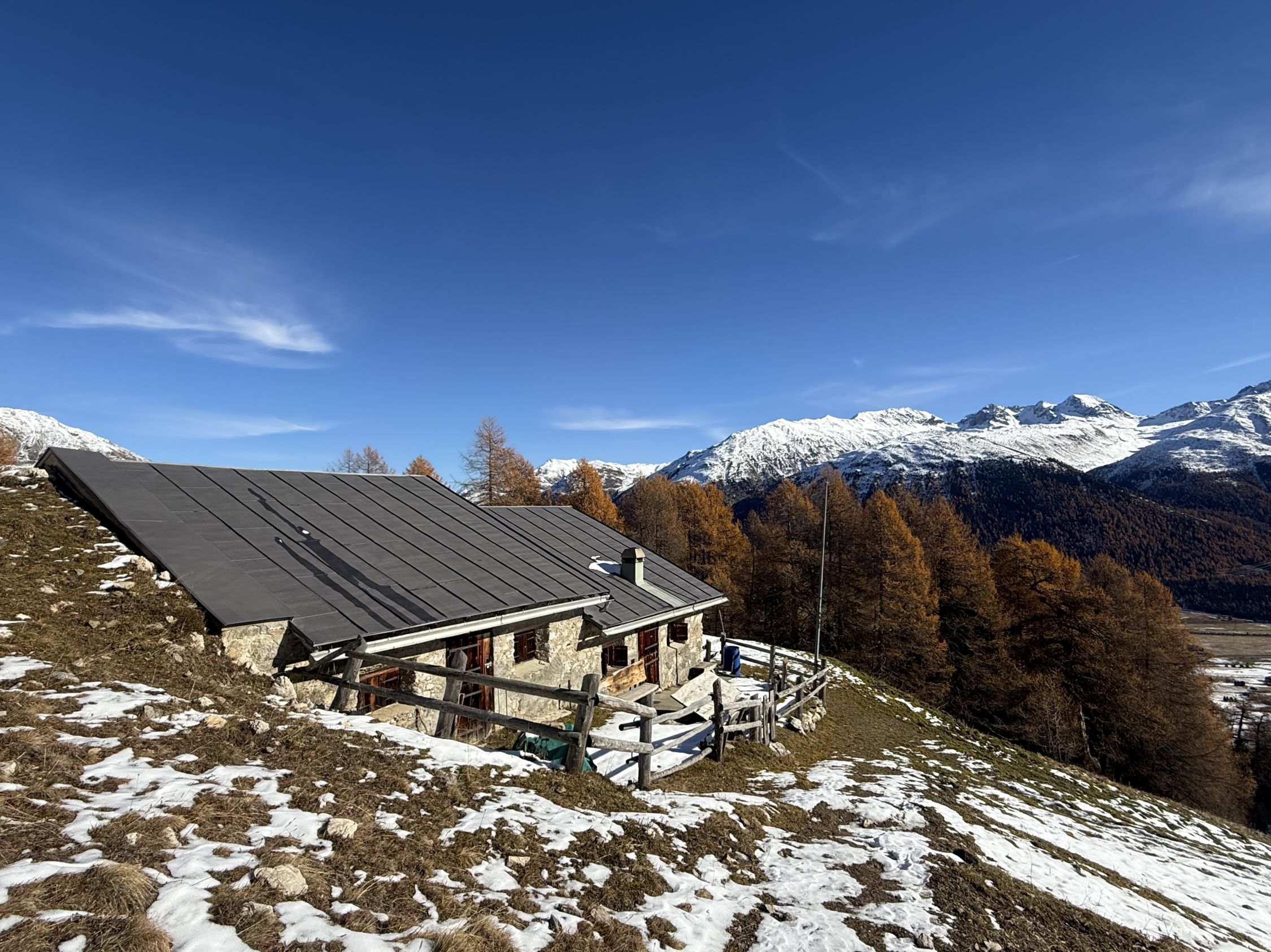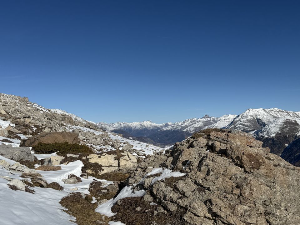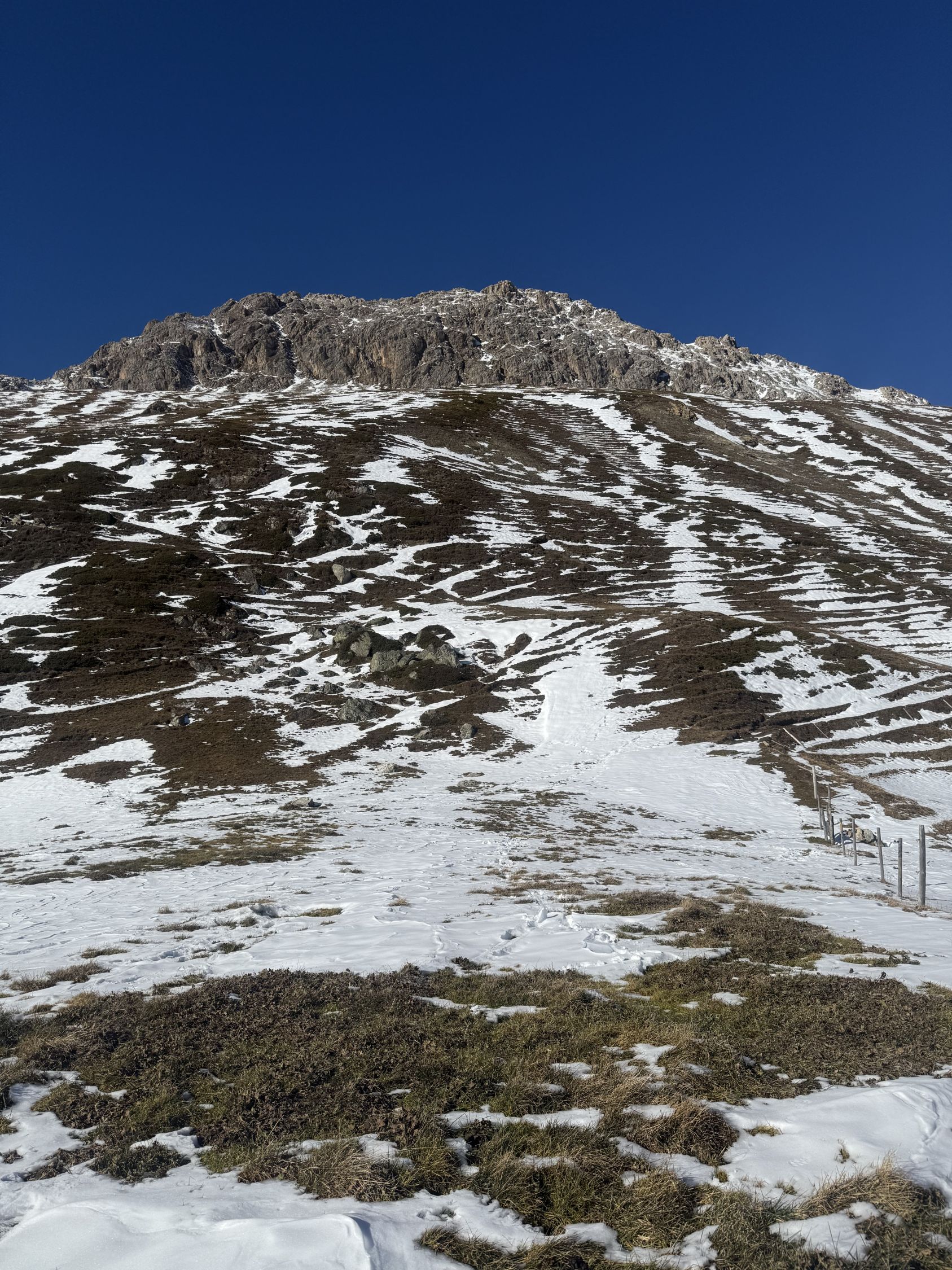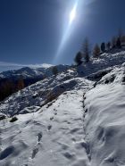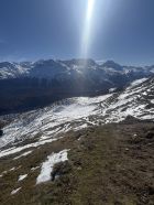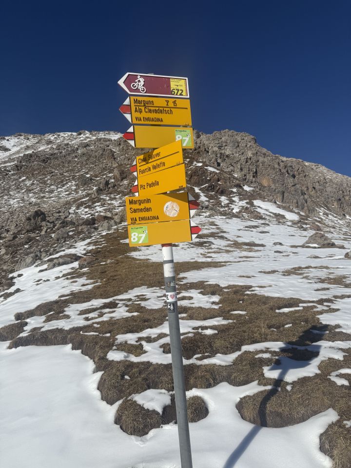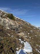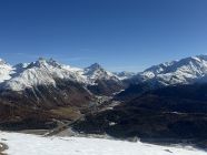 Winterliche Rundtour unterhalb Südostflanke Piz Padella oberhalb Alp Clavadatsch, T4-. Start 9.15 Uhr Skilift Samedan Survih, 0 Grad, Prachtswetter, windstill. Bis Cristolais schneefrei, bis Alphütte Clavadatsch teilweise Schnee, ab Hütte meistens schneebedeckt, Der steile weglose Hang bis Höhe 2500 schneefrei. Abstieg via Wanderweg Val Zuondra schneebedeckt, habe Grödel montiert. Auf dem Gipfel milde Temperatur und schöne Fernsicht.