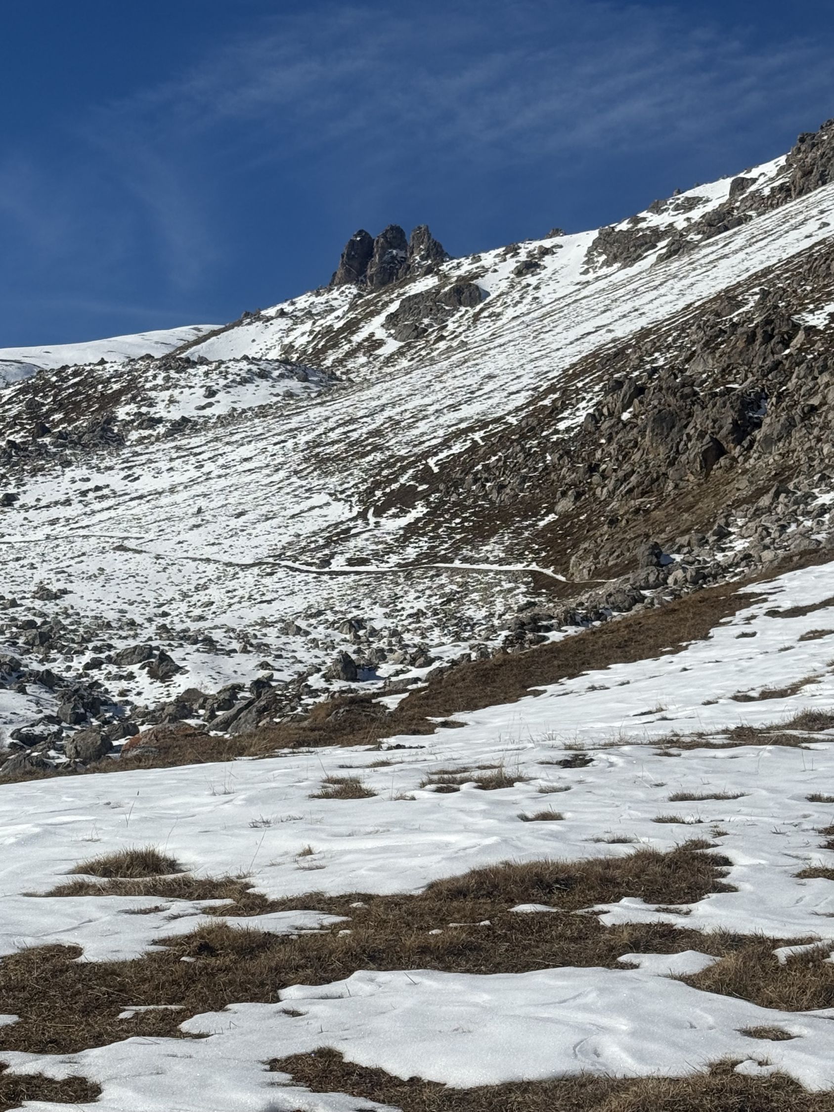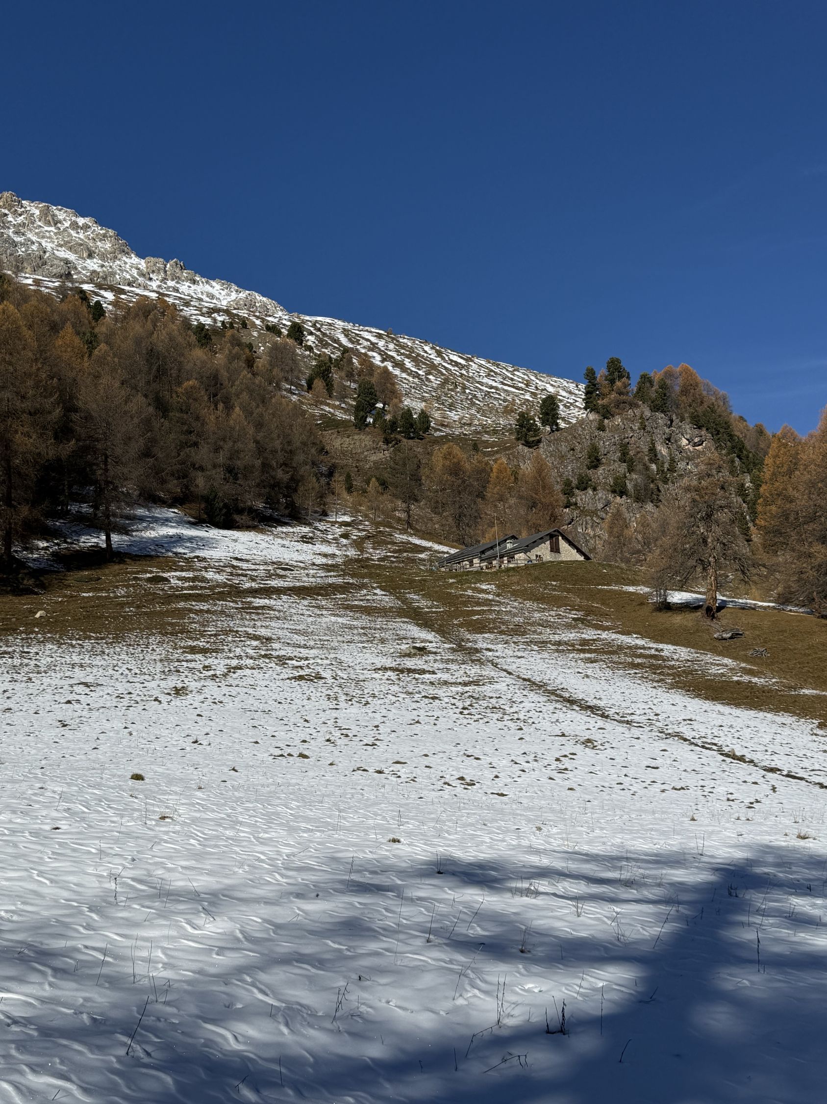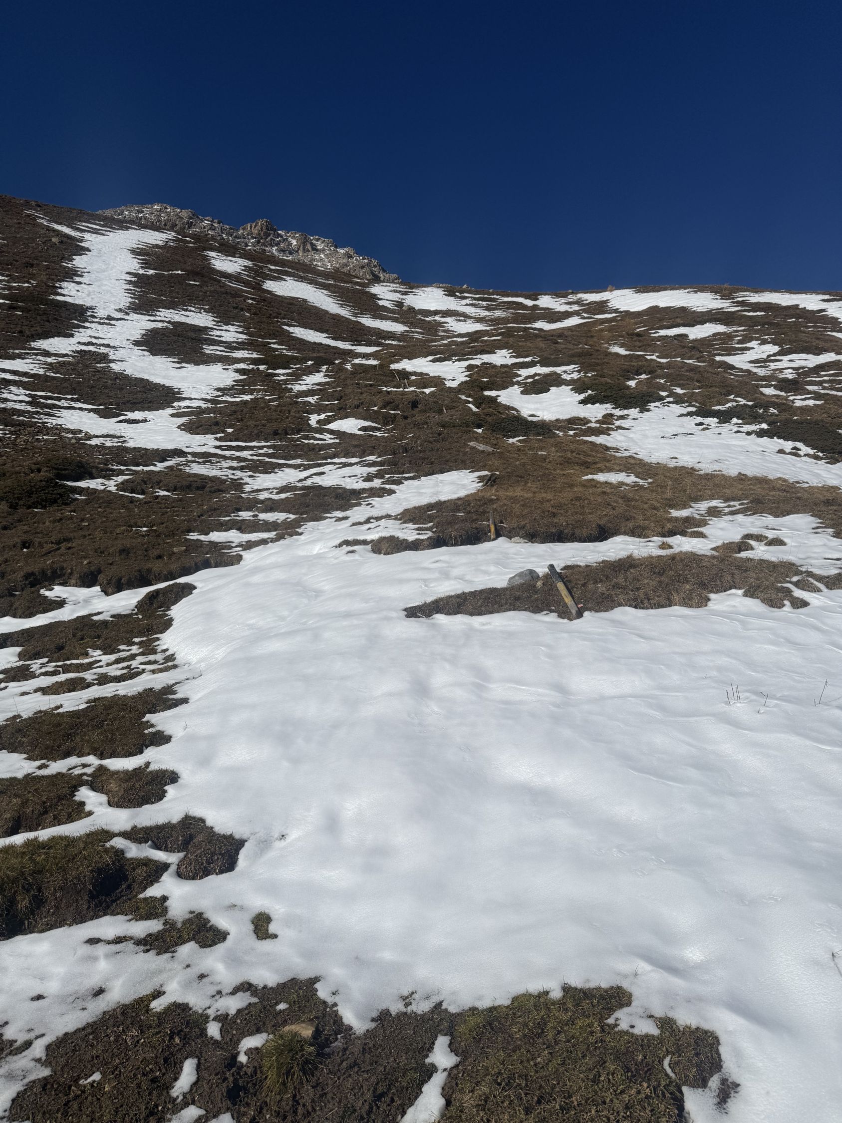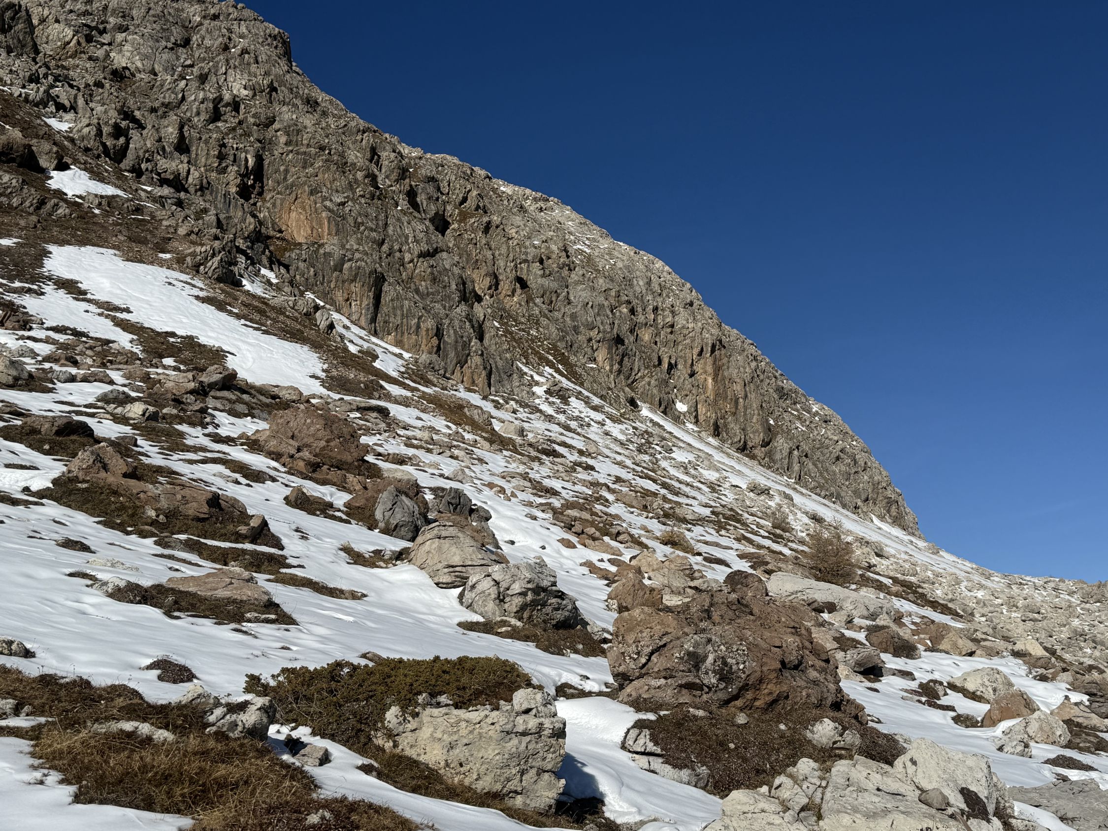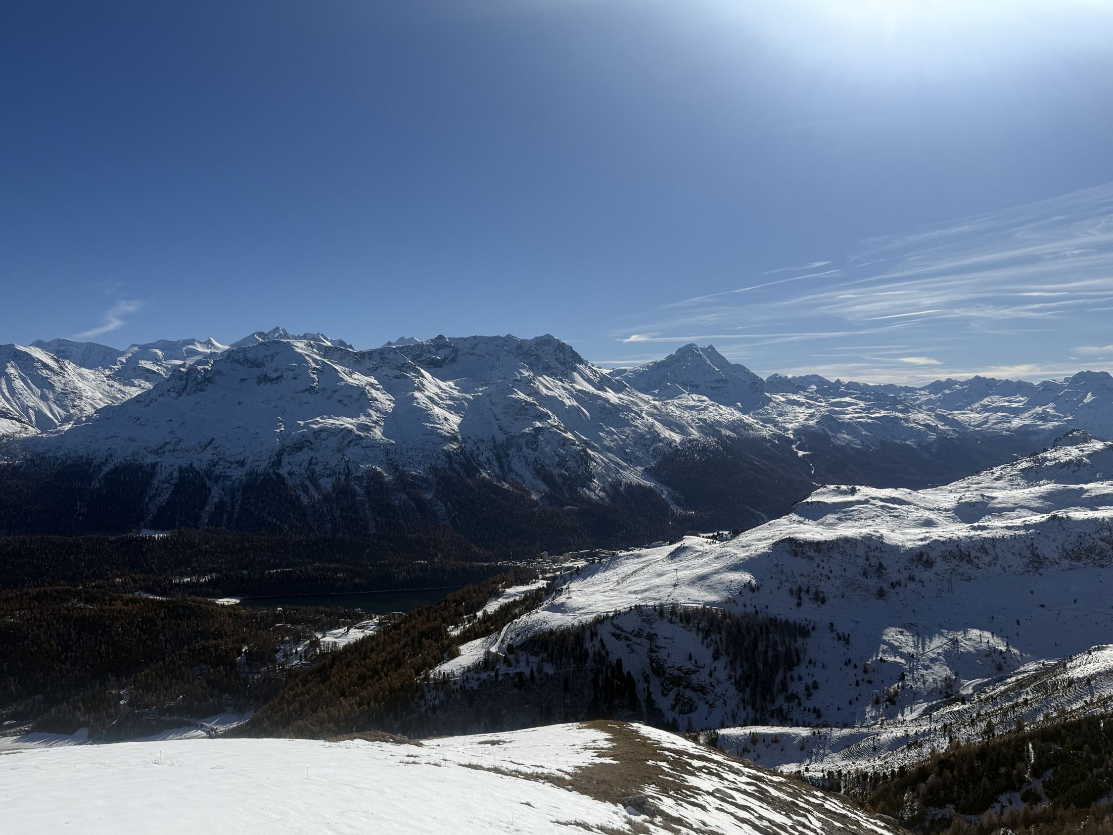 Winterliche Rundtour unterhalb Südostflanke Piz Padella oberhalb Alp Clavadatsch, T4-. Start 9.15 Uhr Skilift Samedan Survih, 0 Grad, Prachtswetter, windstill. Bis Cristolais schneefrei, bis Alphütte Clavadatsch teilweise Schnee, ab Hütte meistens schneebedeckt, Der steile weglose Hang bis Höhe 2500 schneefrei. Abstieg via Wanderweg Val Zuondra schneebedeckt, habe Grödel montiert. Auf dem Gipfel milde Temperatur und schöne Fernsicht.