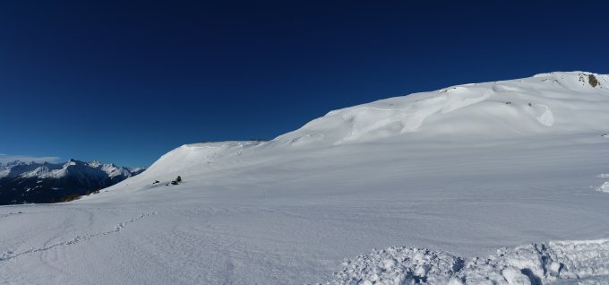 Durch den Anstieg der Schneefallgrenze über Nacht auf Sonntag hat sich ein nichtragender Deckel gebildet, was natürlich äusserst mühsam zum Fahren ist. Am Sonntag hat dann ein starker Westwind geweht, welcher den wenigen Neuschnee zusätzlich verfrachtet hat.