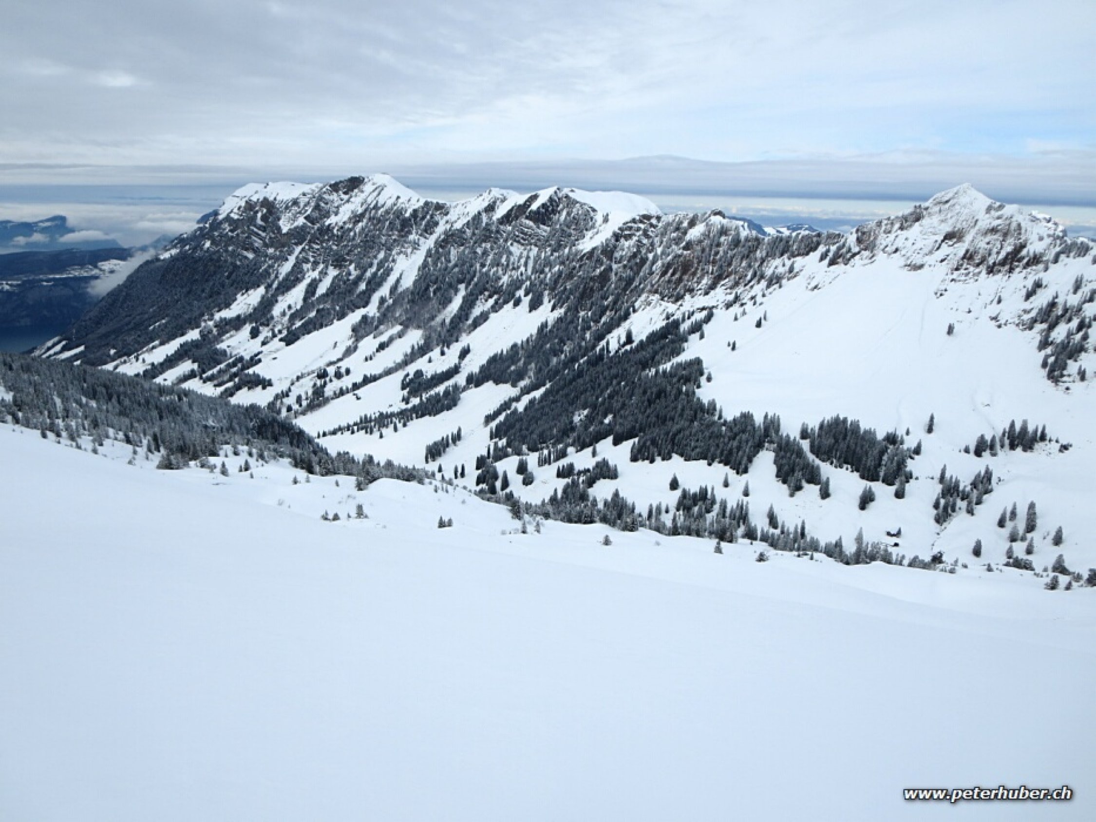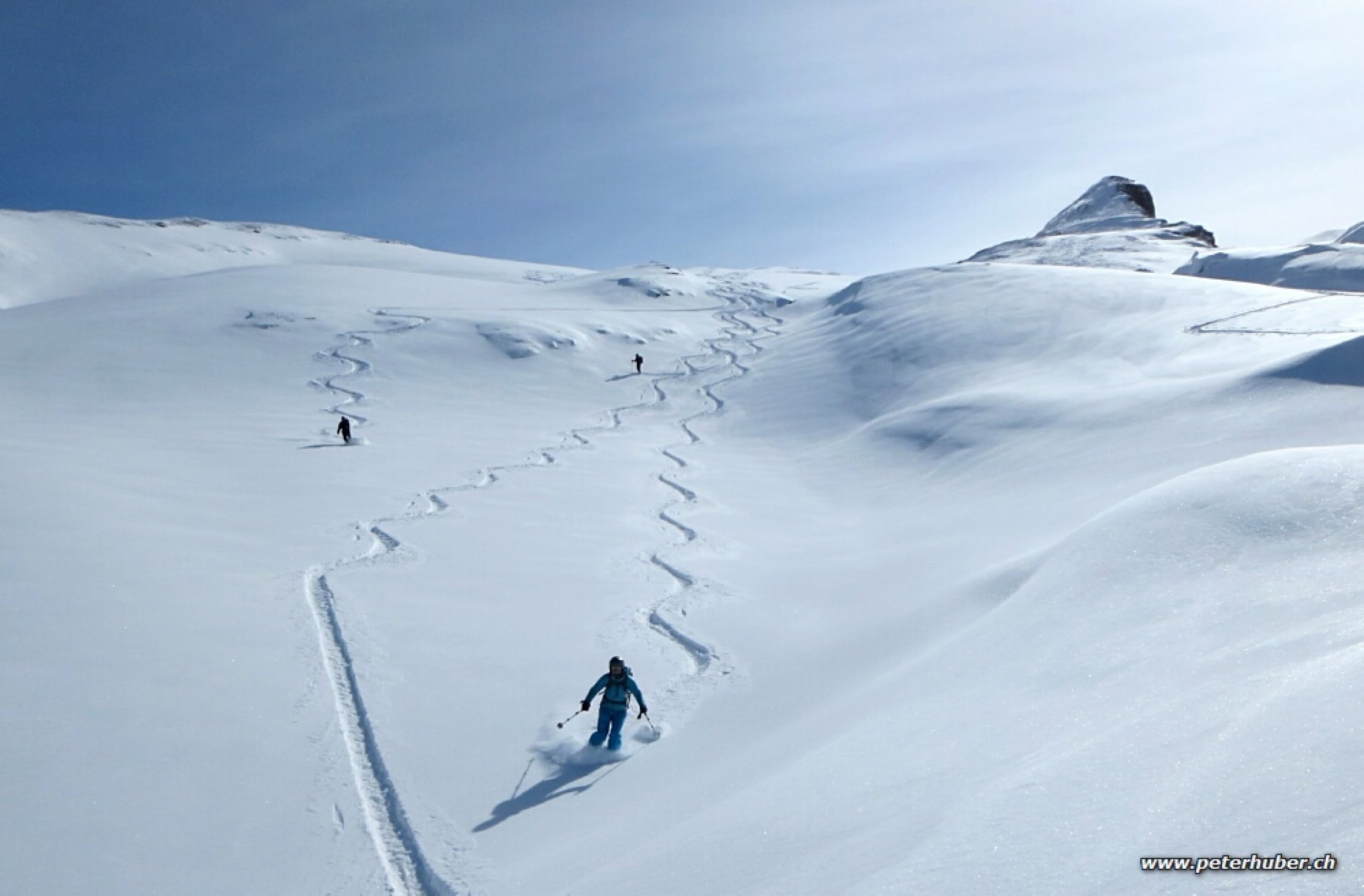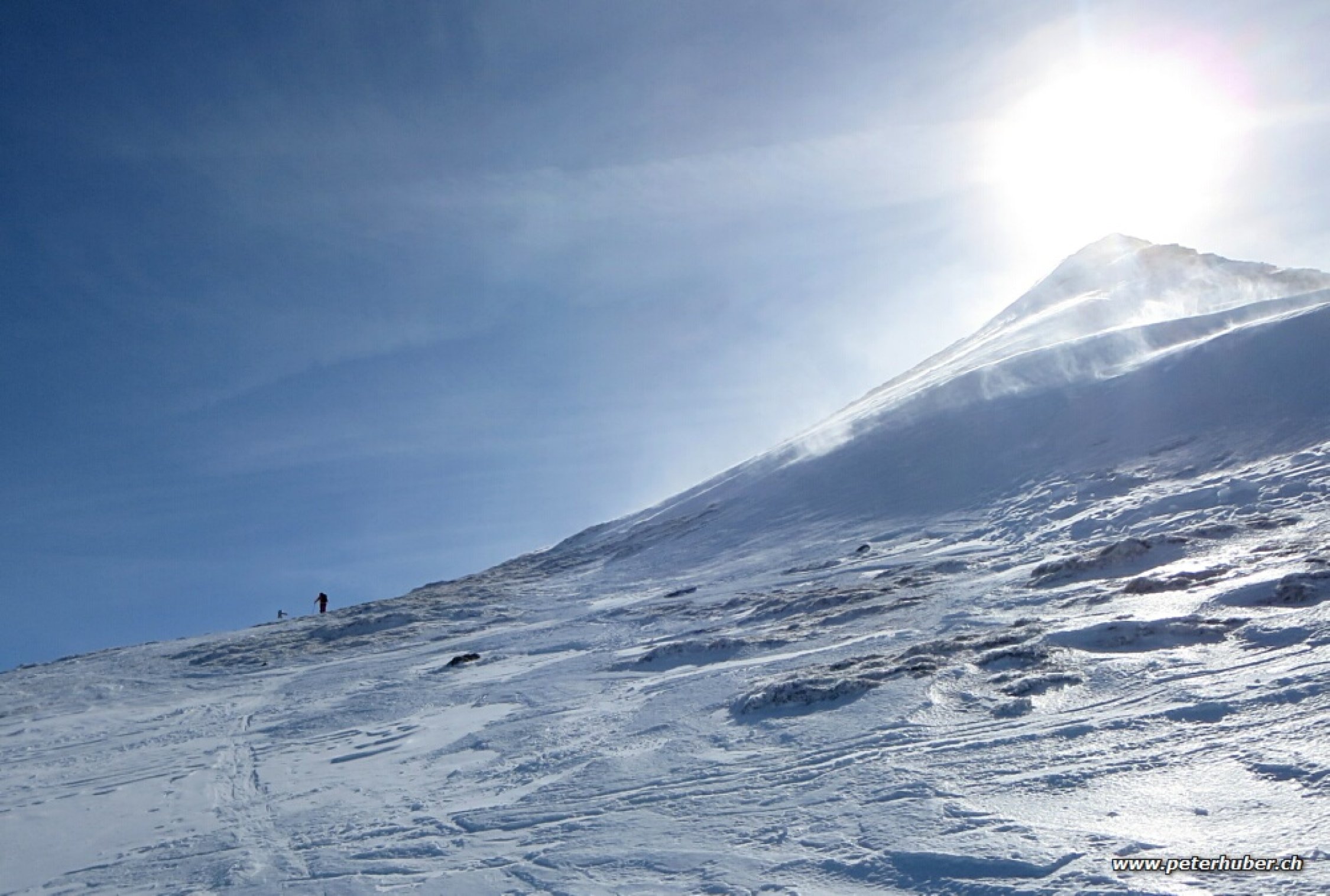 Bis am Mittag strahlend schön. Dann hohe Wolkenfelder, welche die Sonne bei der Abfahrt etwas dämpften, aber immer noch gute Sicht. Am Gipfel kalter Wind.