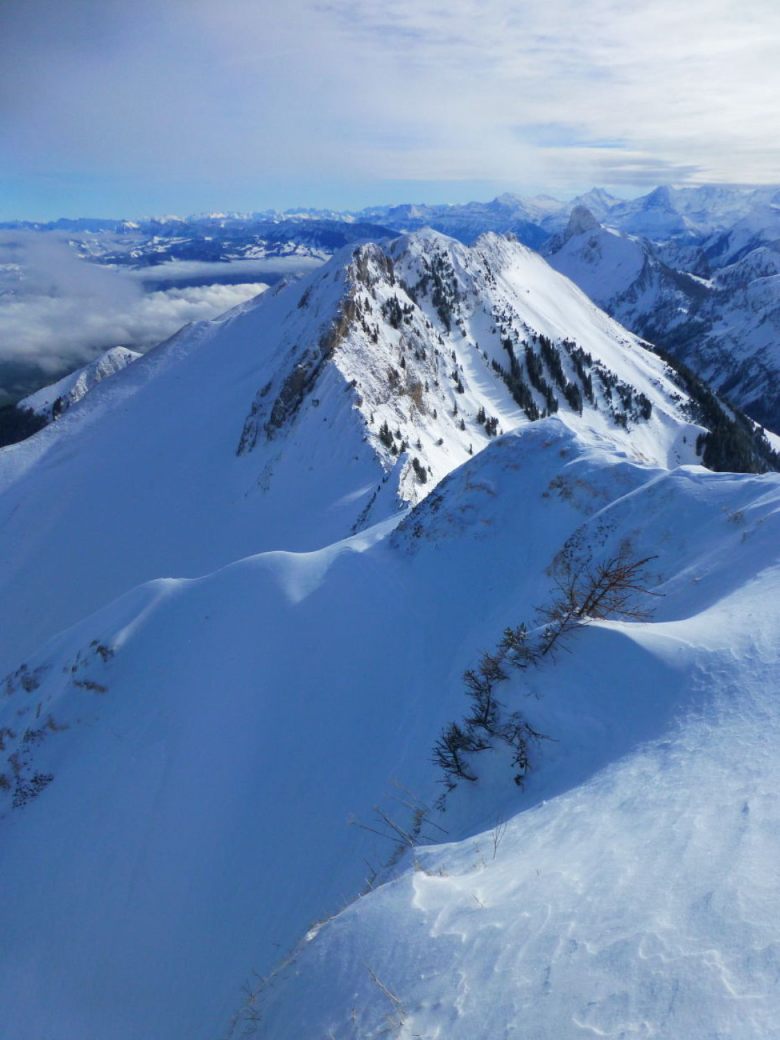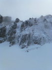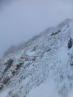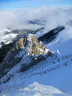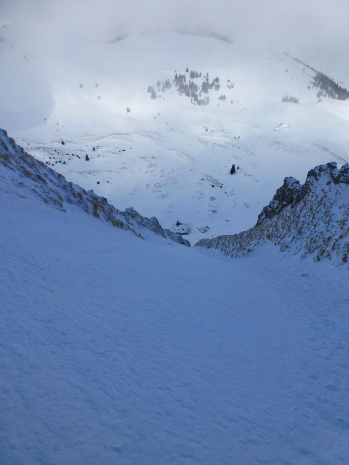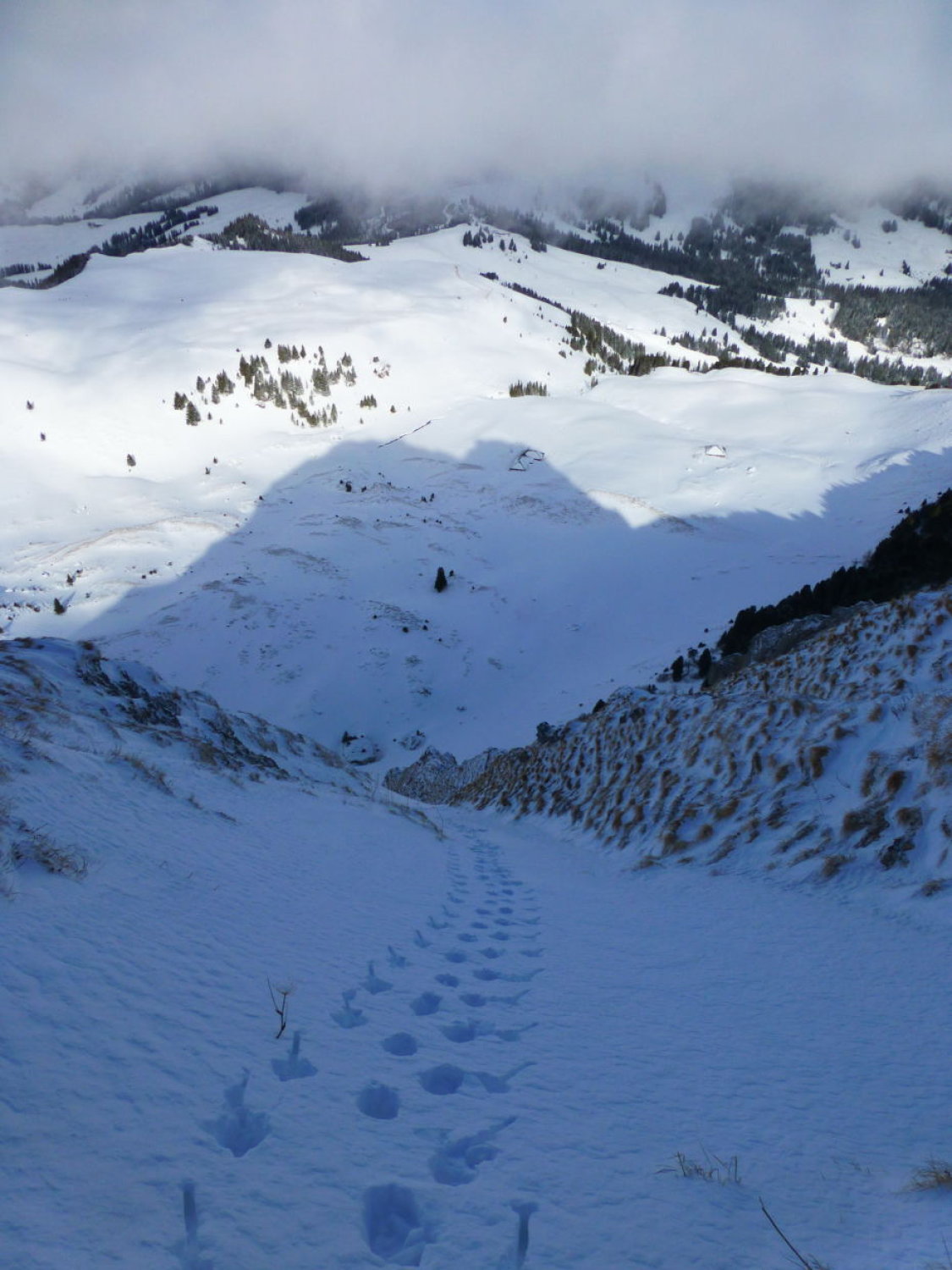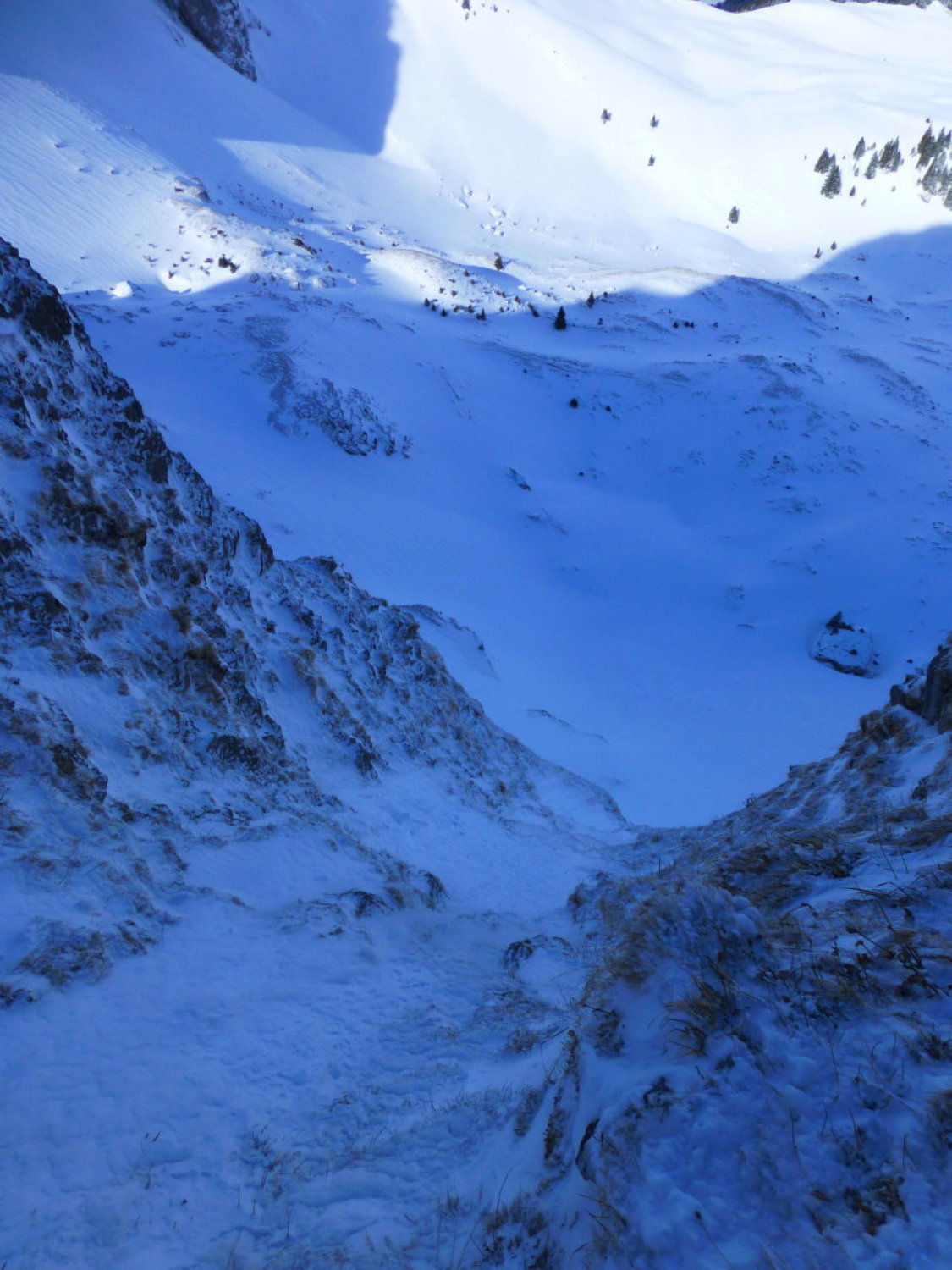 Am Morgen Nebelmeer bei ca. 700m, darüber sonnig und kalt. Böiger W-Wind und Spindrifts durch die Couloirs. Gegen Mittag von W aufziehende Wolken und Nebel. Unten ca. 20cm Pulver auf guter Unterlage. Im Aufstiegscouloir Trittschnee, im Abfahrtscouloir schöner Pulver auf griffiger Unterlage (oben kleine Triebschneerutsche).