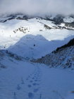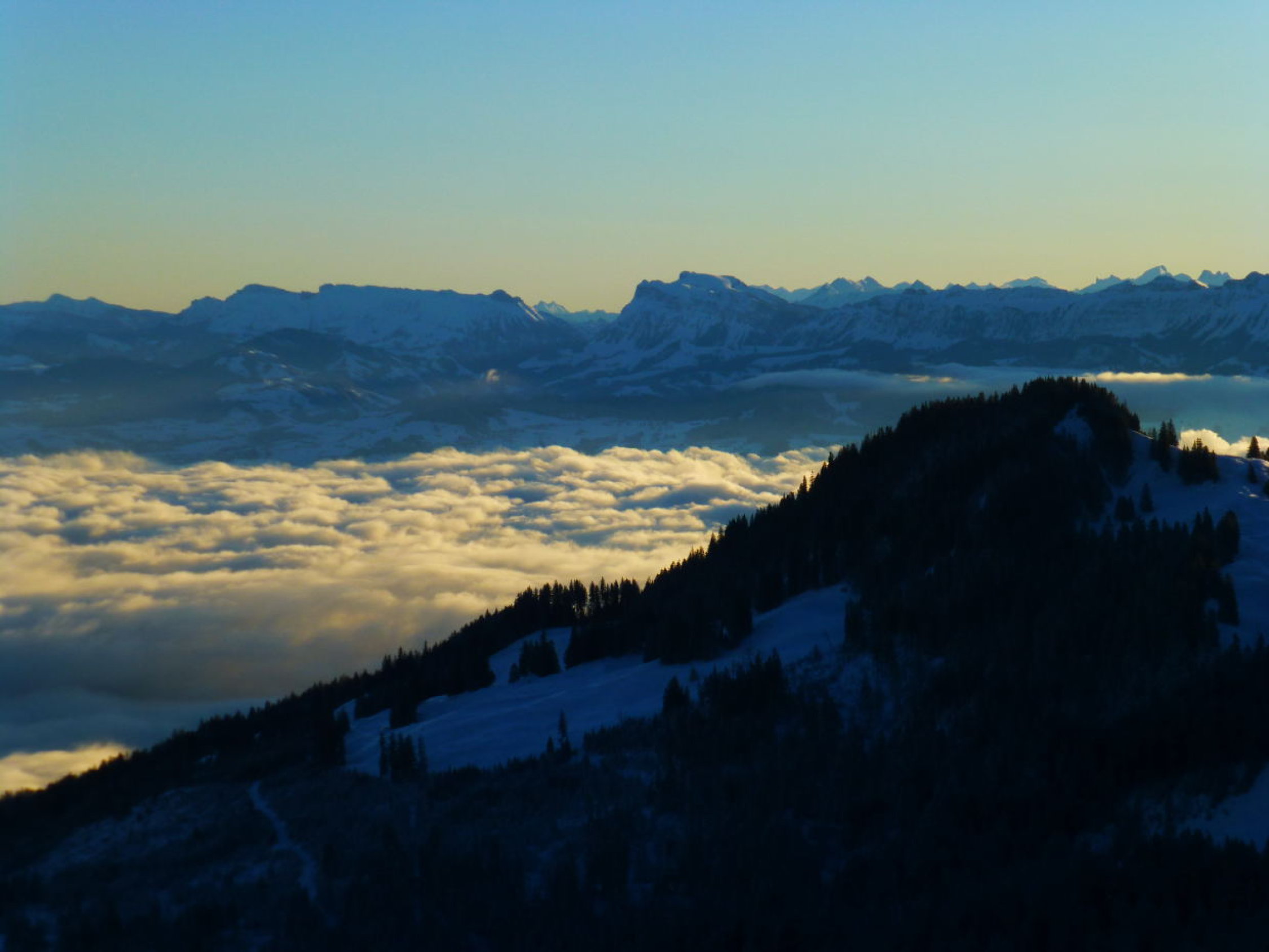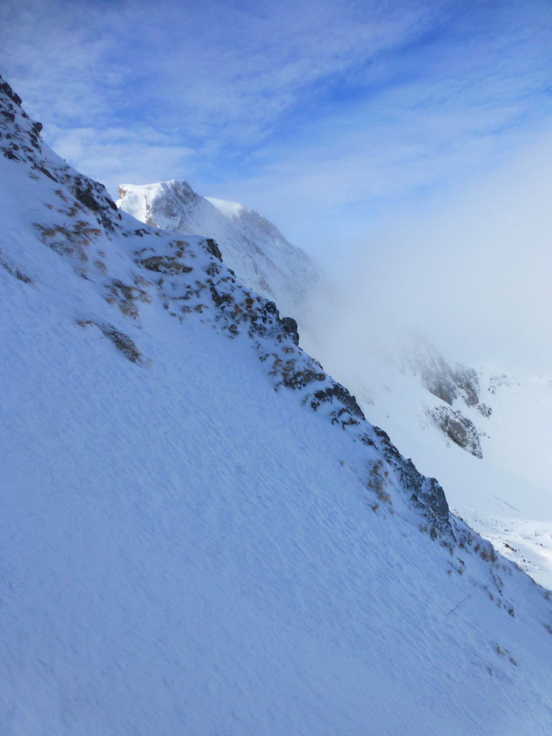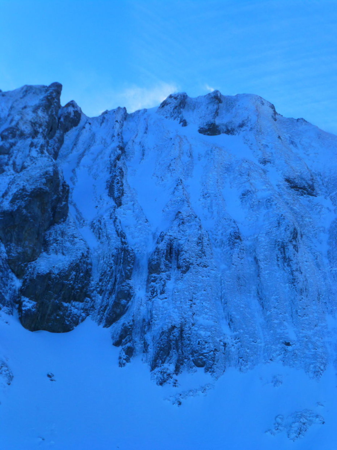 Am Morgen Nebelmeer bei ca. 700m, darüber sonnig und kalt. Böiger W-Wind und Spindrifts durch die Couloirs. Gegen Mittag von W aufziehende Wolken und Nebel. Unten ca. 20cm Pulver auf guter Unterlage. Im Aufstiegscouloir Trittschnee, im Abfahrtscouloir schöner Pulver auf griffiger Unterlage (oben kleine Triebschneerutsche).