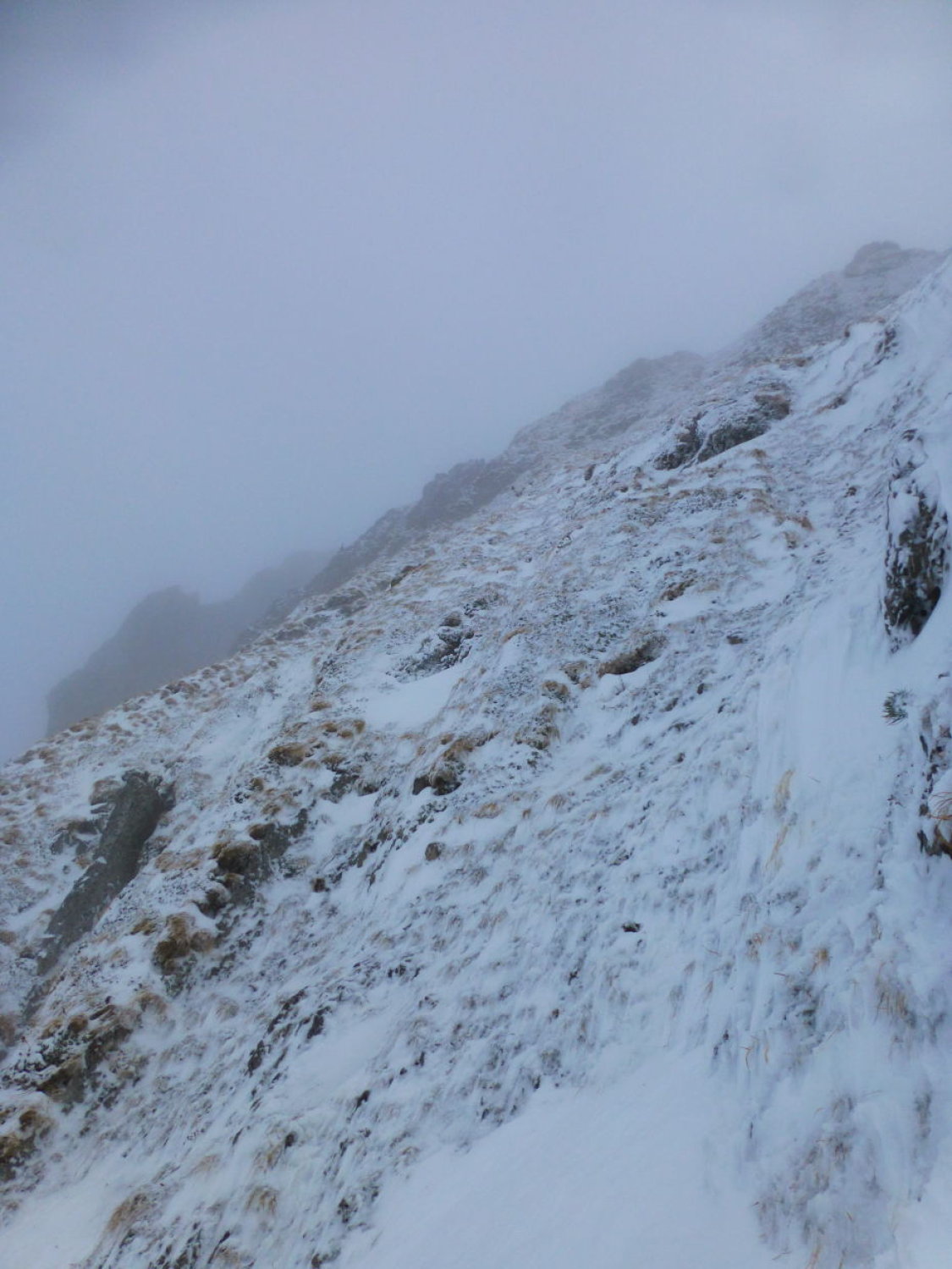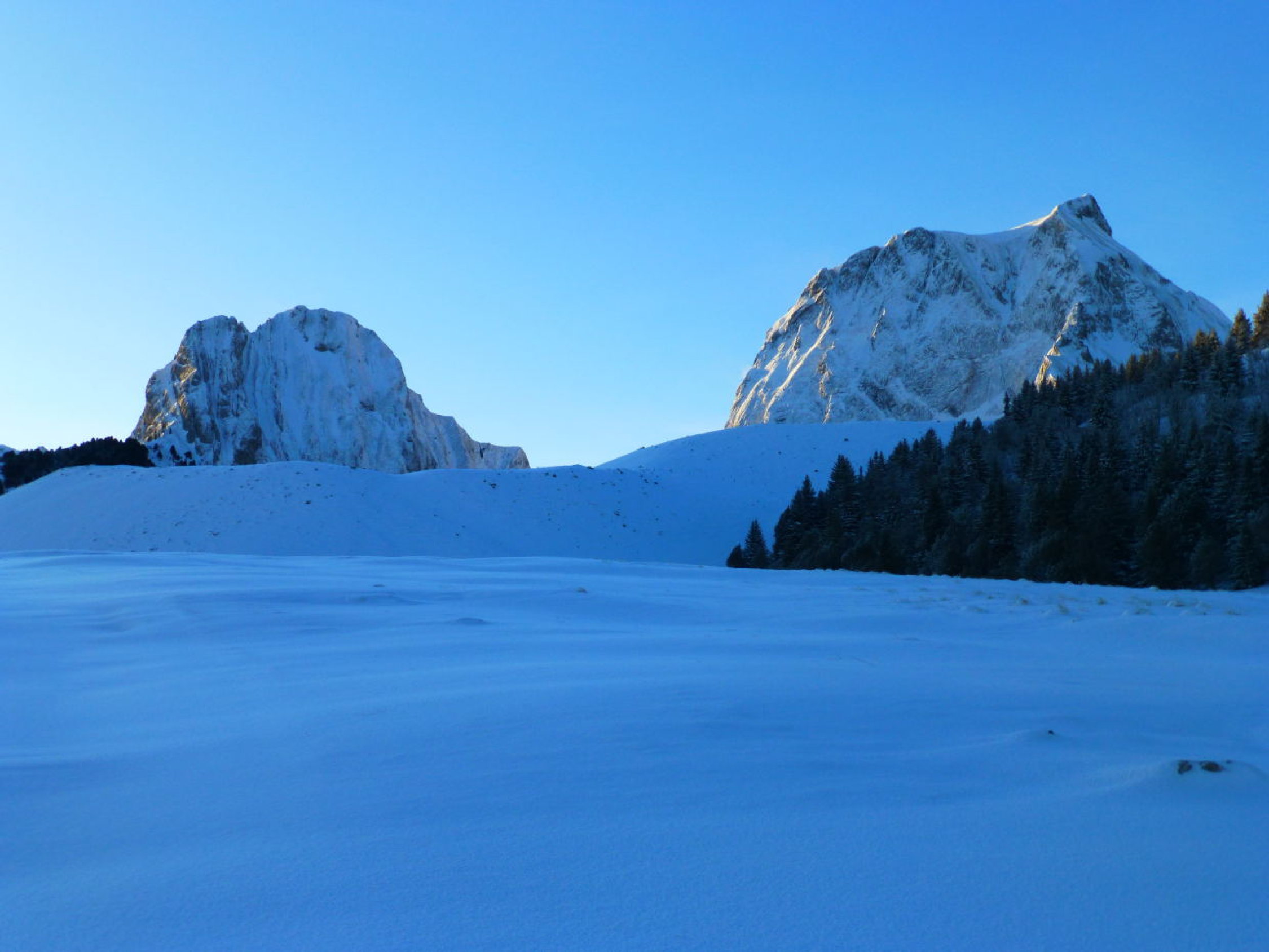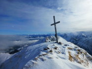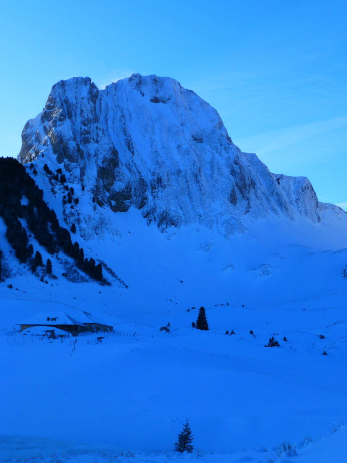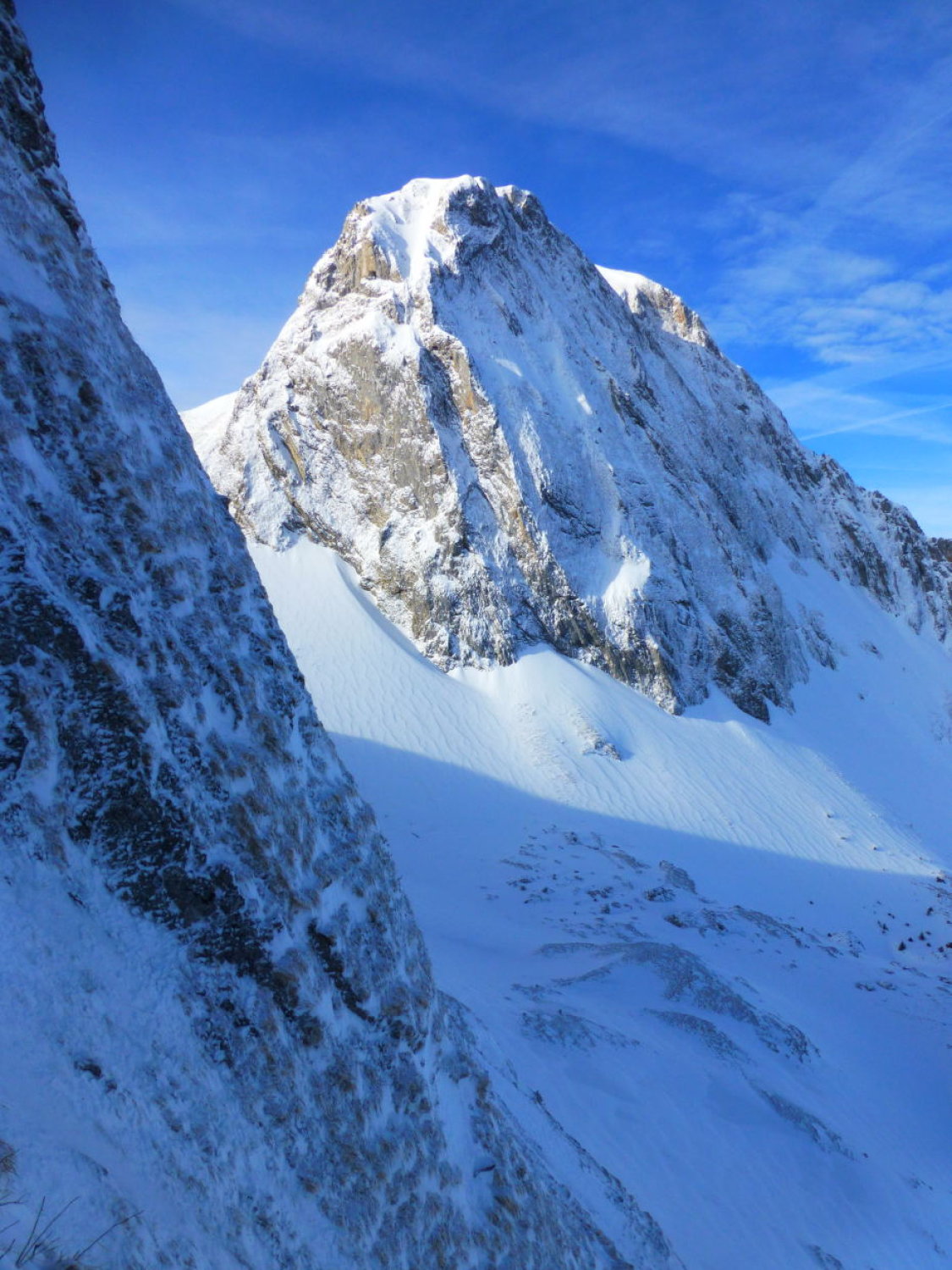 Am Morgen Nebelmeer bei ca. 700m, darüber sonnig und kalt. Böiger W-Wind und Spindrifts durch die Couloirs. Gegen Mittag von W aufziehende Wolken und Nebel. Unten ca. 20cm Pulver auf guter Unterlage. Im Aufstiegscouloir Trittschnee, im Abfahrtscouloir schöner Pulver auf griffiger Unterlage (oben kleine Triebschneerutsche).