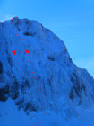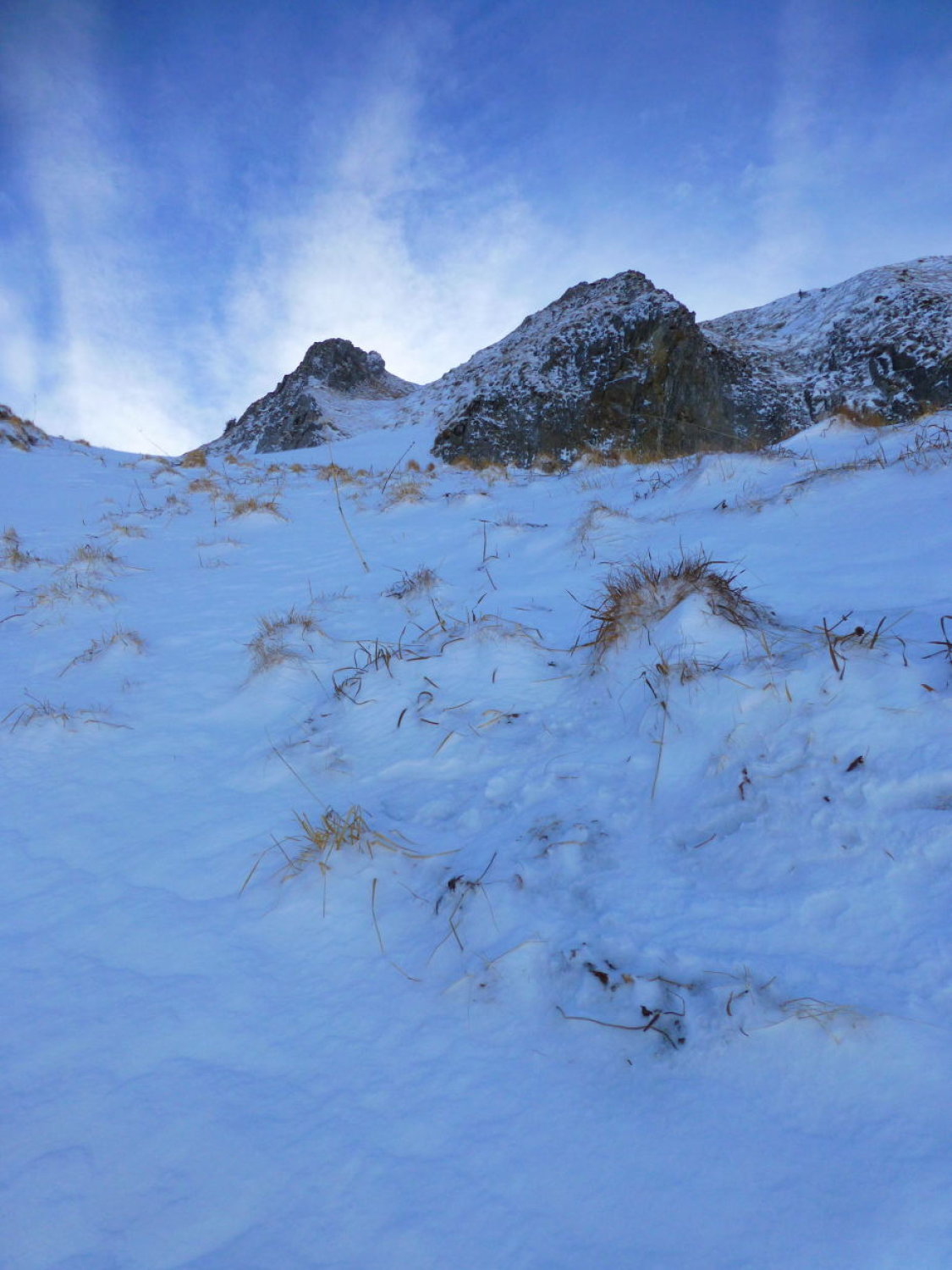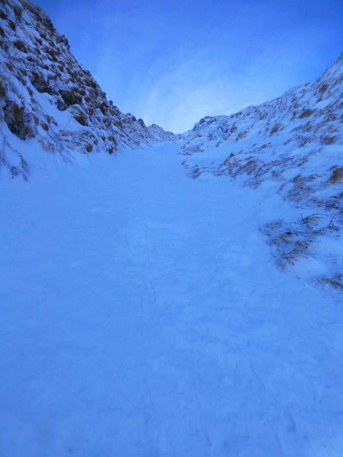 Bemerkung: die Hauptschwierigkeiten liegen z.Z. im nicht zu unterschätzenden untersten Steilgras- und Schrofendrittel, über das auch abgeklettert werden muss. Es ist deshalb besser - sichere Lawinen- und griffige Schneeverhältnisse vorausgesetzt -, Aufstieg und Abfahrt nur dann zu unternehmen, wenn die NW-Couloirs bis unten durchgängig eingeschneit sind.