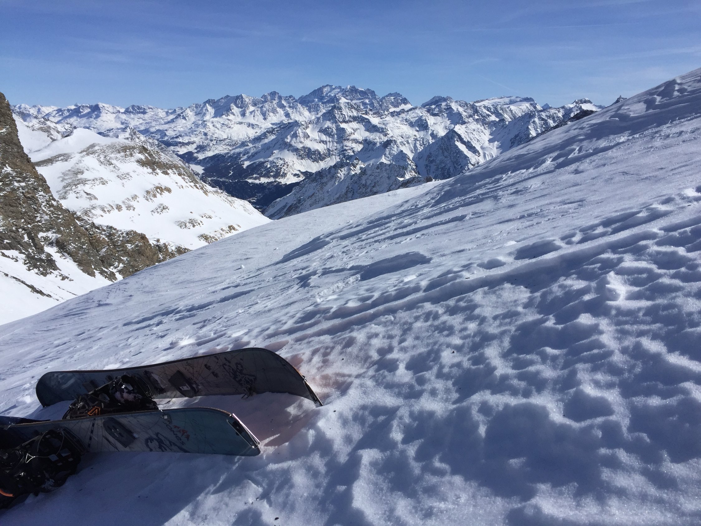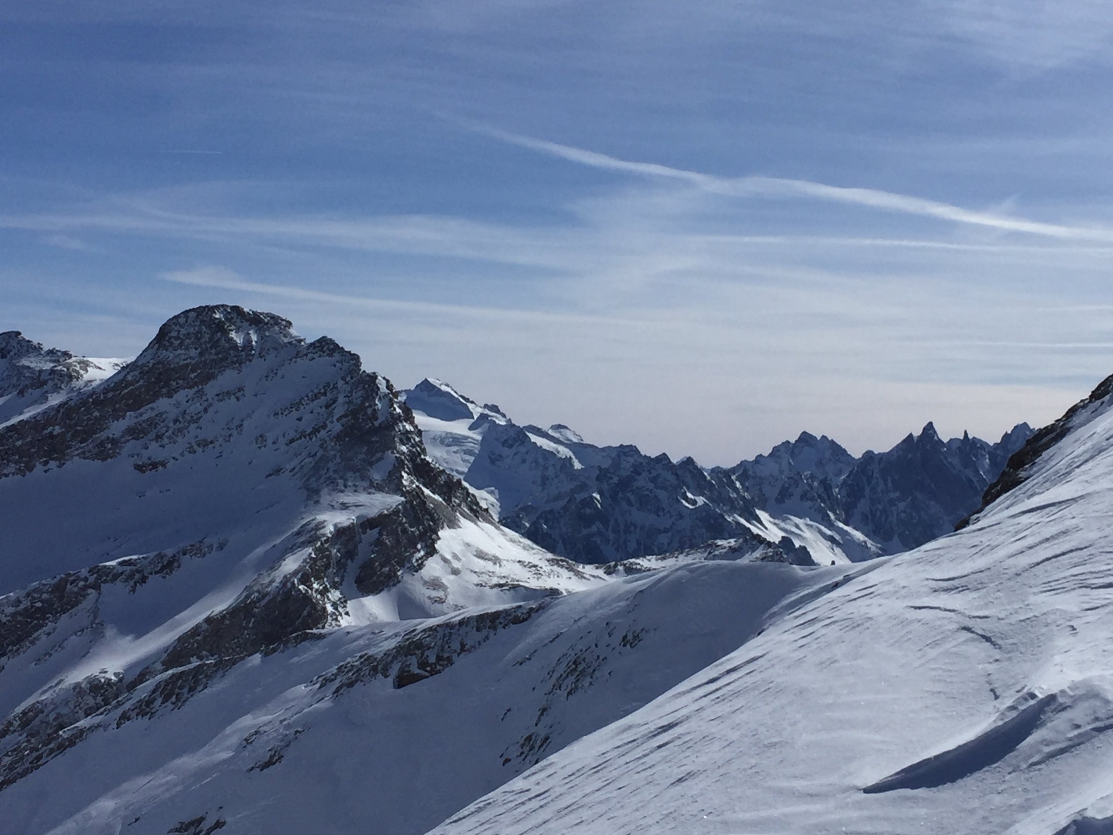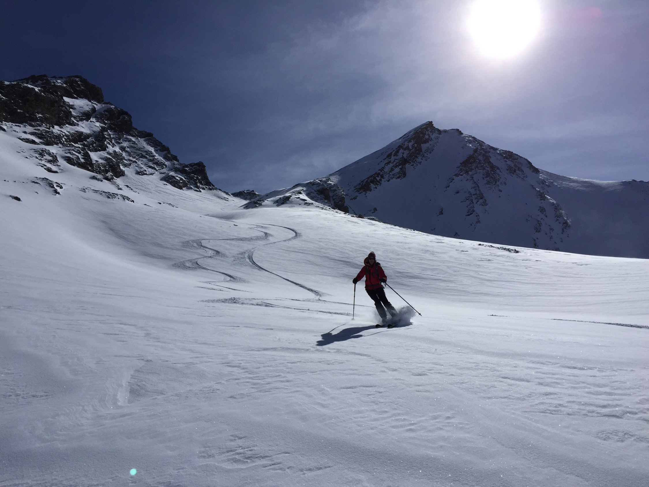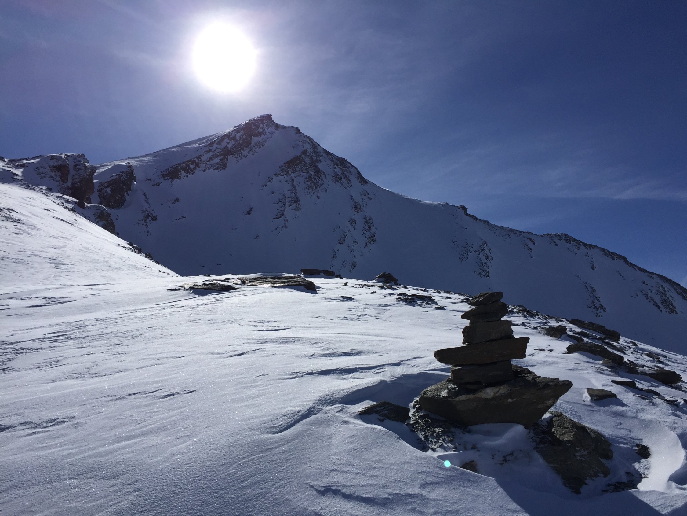 Es liegt sehr wenig Schnee im Avers Tal. Dank der guten Ausrichtung und Neigung der Abfahrtshänge (wie Aufstieg) waren die Verhältnisse jedoch sehr gut (Pulver!), trotz der warmen Temperaturen der letzten Tage. Auf 3006m umgekehrt da starker Wind auf dem Gipfel und der Hang voll abgeblasen. Die Abfahrt durch das N-Couloir wäre wohl bei den aktuellen Verhältnissen jedoch gut möglich gewesen.