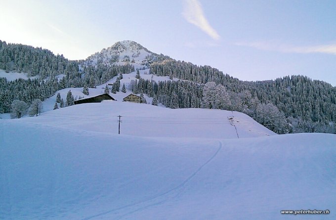 Es hat zirka 15 cm schönen Pulverschnee gegeben. Unten stellenweise keine Unterlage, ab 1300 m gute Unterlage. Skiaufstieg durch die Schlüsselstelle gut machbar, Aufstieg bis auf den Gipfel möglich.