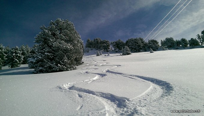 Tolle Abfahrt in dem luftigen Pulverschnee. Unten hat's wenige Gras-/Steinkontakte gegeben - wer die vermeiden will, kann auch unten über die Piste abfahren.