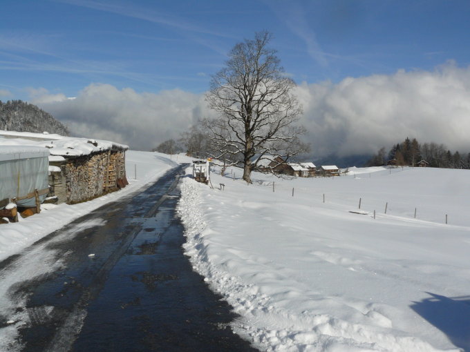 Traumverhältnisse vom Gipfel oder vom Gratrücken bis hinunter zur Chratzegg. Auf dem Weg zurück in die Hüttenberge bereits um die Mittagszeit eine ganz kurze apere Stelle. Fahrsträsschen zu den Hüttenbergen aper, morgens leicht vereist.