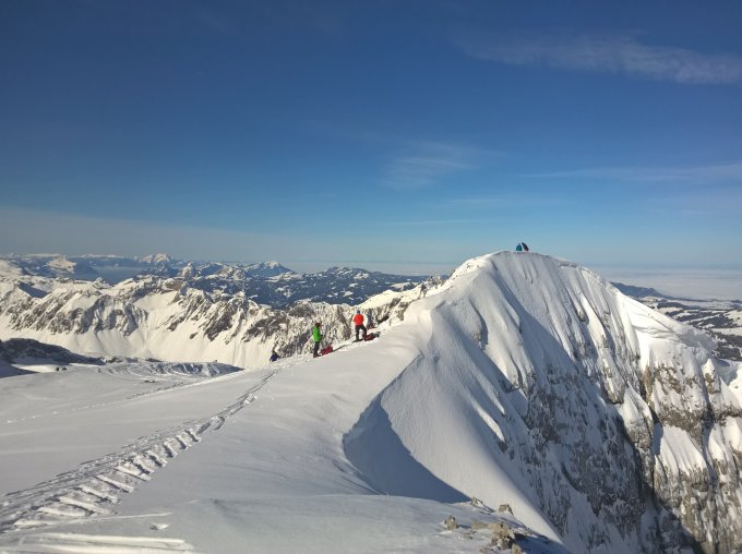 Eigentlich sehr gute Verhältnisse für diesen Winter, teils knappe Unterlage. Steine an den üblichen Stellen (Vor allem Gipfelbereich). Etwa 20 cm Neuschnee (Pulver bis etwa Rinderweid, dann schwerer). Aufstieg via Brücke P. 998/Rinderweid. Abfahrt gut bis zur Strasse.