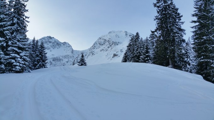 Schnee von allem ein bisschen: Im Kessel "Im Ofe" hoch zum Ochsen körniger und verblasener Neuschnee, SW-Flanke des Ochsen windgedeckelt und mit glasiger Spur (gerade noch ohne Harscheisen zu gehen), SO-Hänge von Riprächtpochte und S-Hänge unter Morgetepass schwerer Neuschnee, N-Flanke der Bürgle mit rund 25cm schon leicht gebundem Neuschnee und W-Hänge des Birehubel mit überraschend gut fahrbarer, körniger, ca. 10cm dicker Neuschneeschicht auf harter Unterlage.
