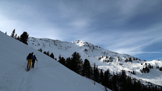 Wind und offensichtlich auch Regen haben gründliche Arbeit geleistet. Aufstiegspur auf gutem harten Untergrund bis kurz vor die Schneegrubenscharte gut begehbar, danach zunehmend verblasen. Abfahrt über Nordseite direkt zur Schneegrubenalm, bis auf etwa 1800m teilweise recht rustikale Bedingungen, hartgfrorener Untergrund mit teilweise sehr störenden Schneebrocken, kurz vor der Alm dann bessere Bedingungen, jedoch teilweise Triebschnee in manchen Hangbereichen.