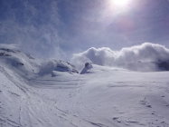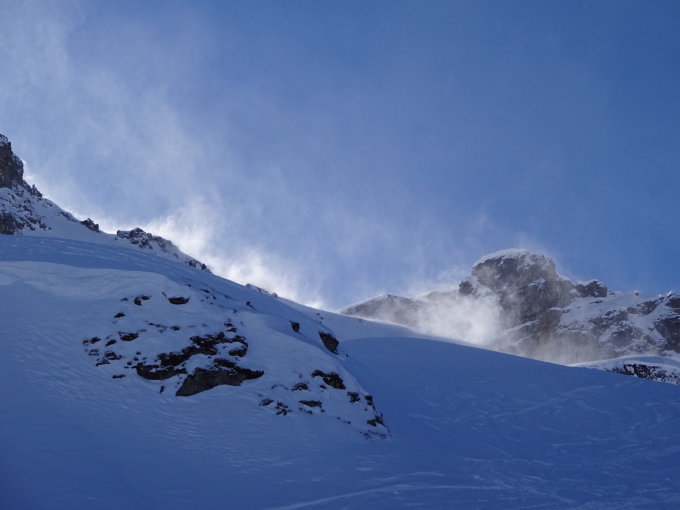Von unten bis oben ein gutes Fuder Schnee und dieses erst noch in erstaunlicher Qualität! Ab 2300m machte sich der Föhn mit starken Böen und Schneeverfrachtungen bemerkbar. Wir spurten daher nur auf den Vorgipfel P.2437.