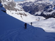 Abfahrt über die Aufstiegsroute bis ober Stafel in gutem Pulver. Sind dann ins Tälchen rechts (östlich)runter, dort eher schwer drehender Schnee aber immer noch ganz OK bis zur Brücke bei ca. 1320m. Das Strässchen dann in Pistenmanier flott runter zum Tröli.