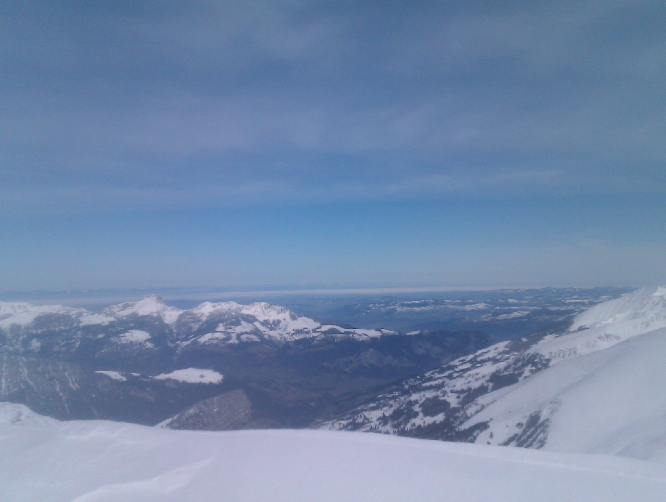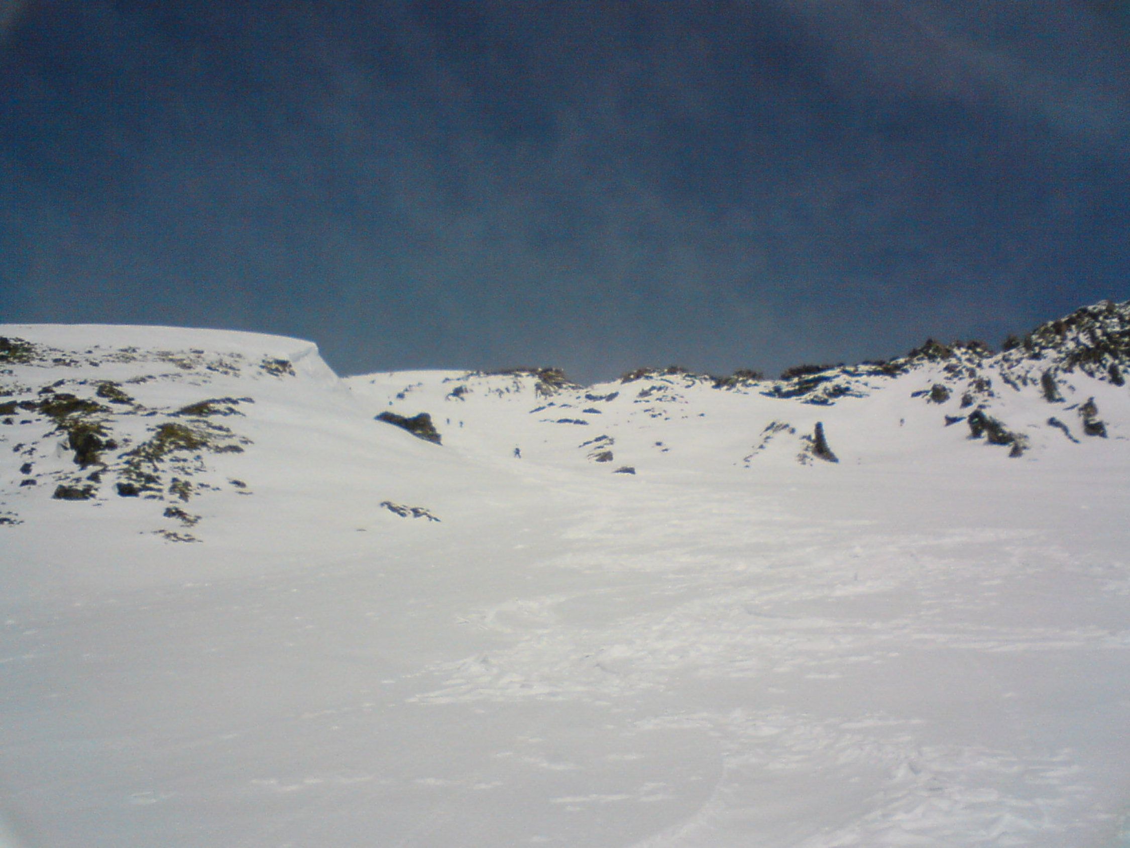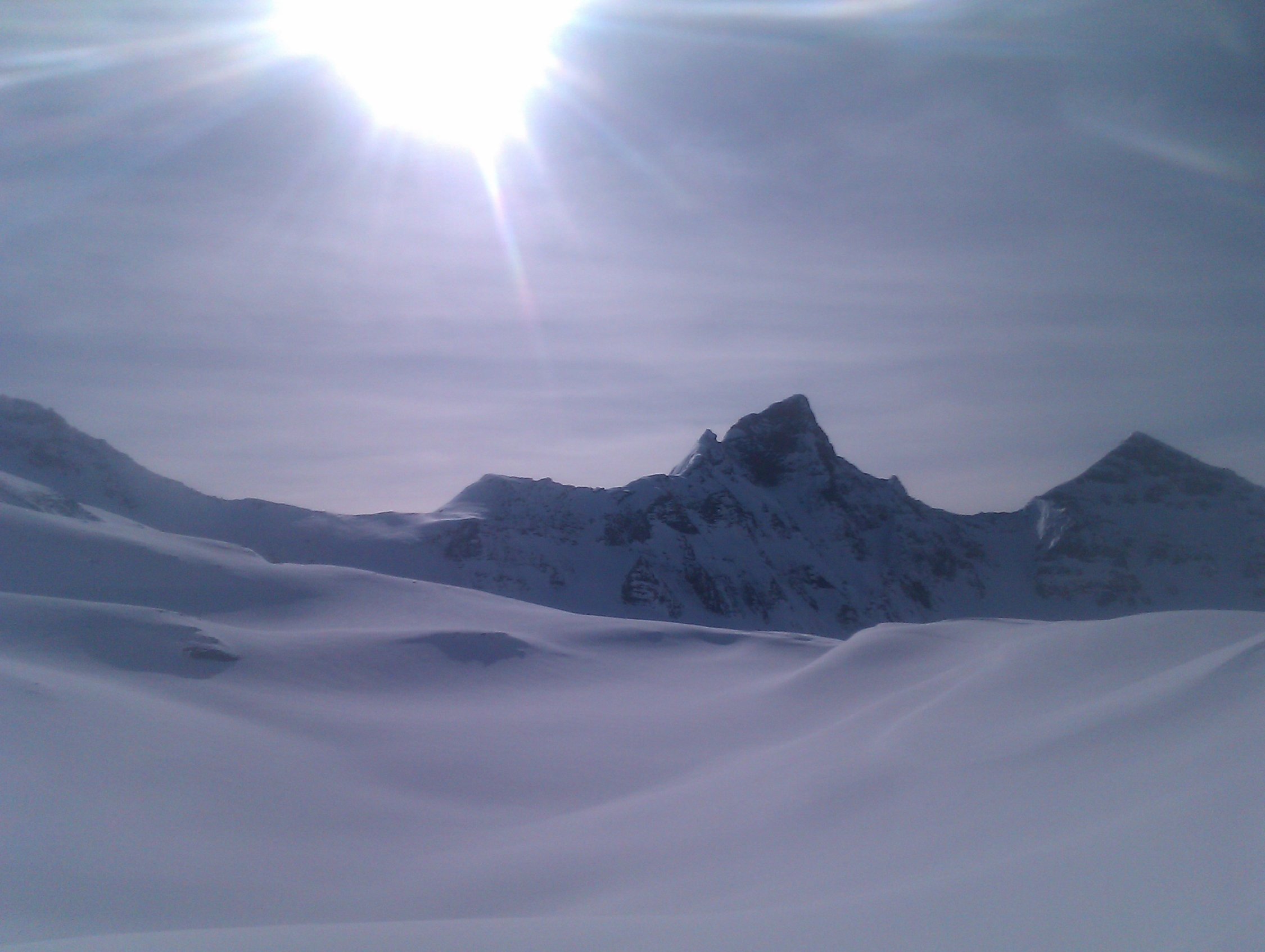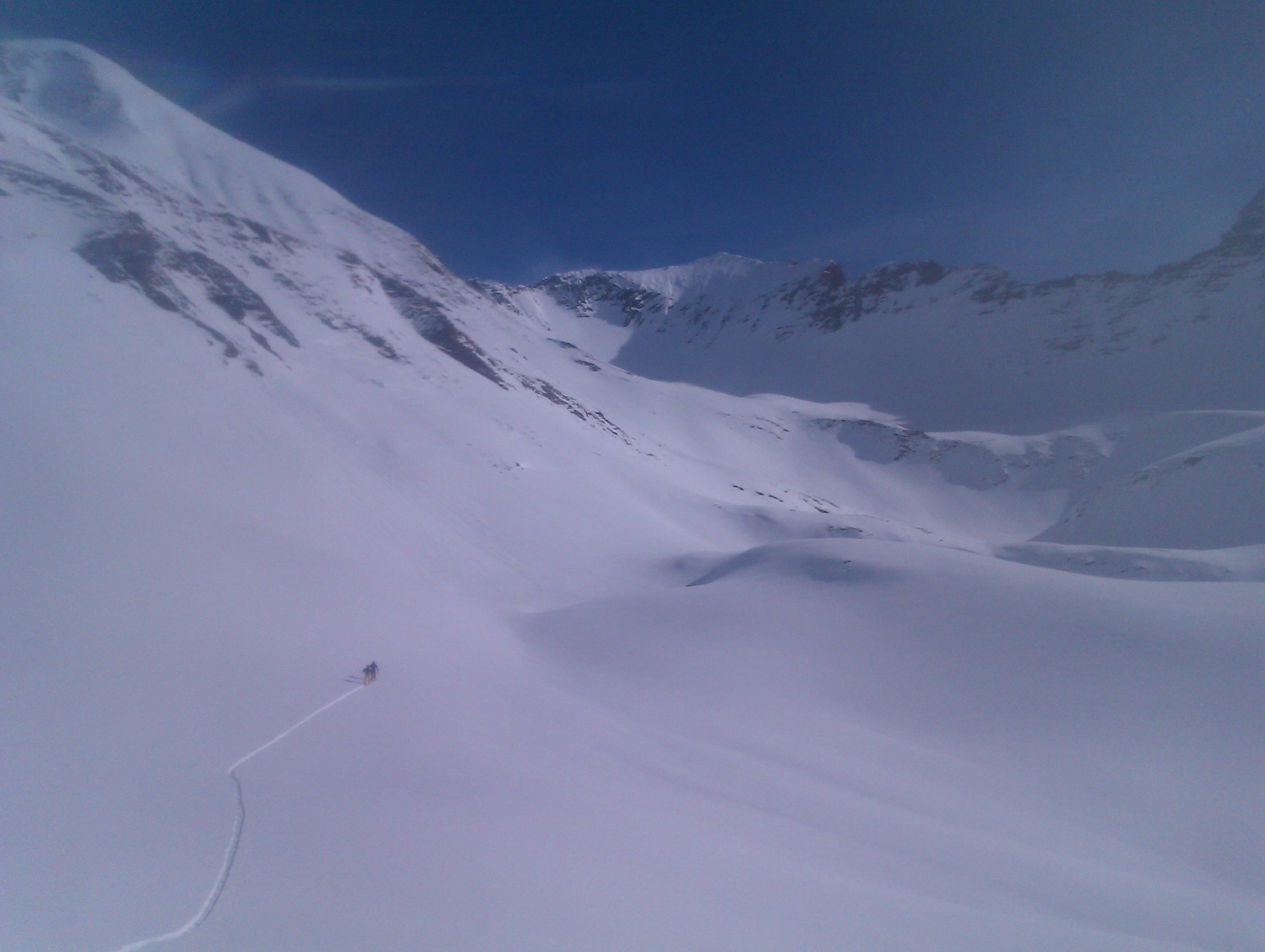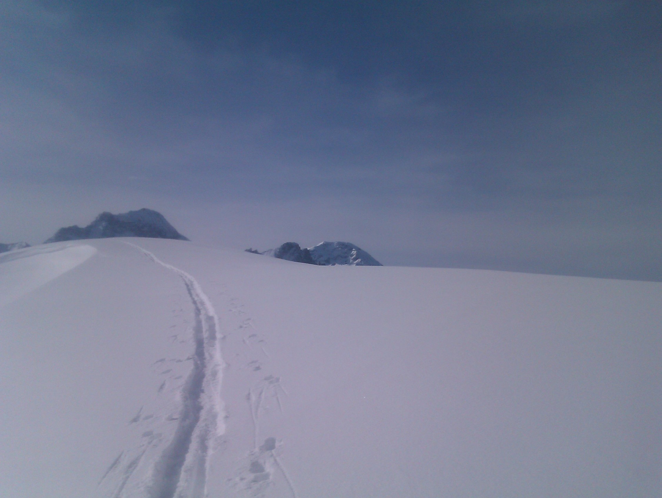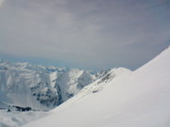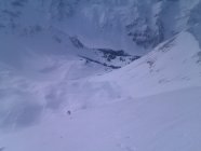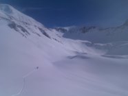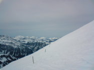 Fast überall leichter Schmelzharschdeckel. Trotzdem überall immer noch nett zu fahren (Ausnahme siehe unten). Wir sind anschliessend noch bis zum Zaun der Galmschiebe. Die Abfahrt direkt nach vom Punkt 2034 direkt nach Fildrich im Scheerizug ist nur für Leute, die sich vom Nassschneerutsch-Eisbrockenslalom nicht schrecken lassen. Oben fängt es ja ganz nett an mit etwas schwerem Neuschnee. Gegen unten lässt es sich fast nicht vermeiden, dass man einmal ein solches Nasschneeeblock-Slalom-Tor verpasst. Jedenfalls auf meinem skifahrerischen Niveau.