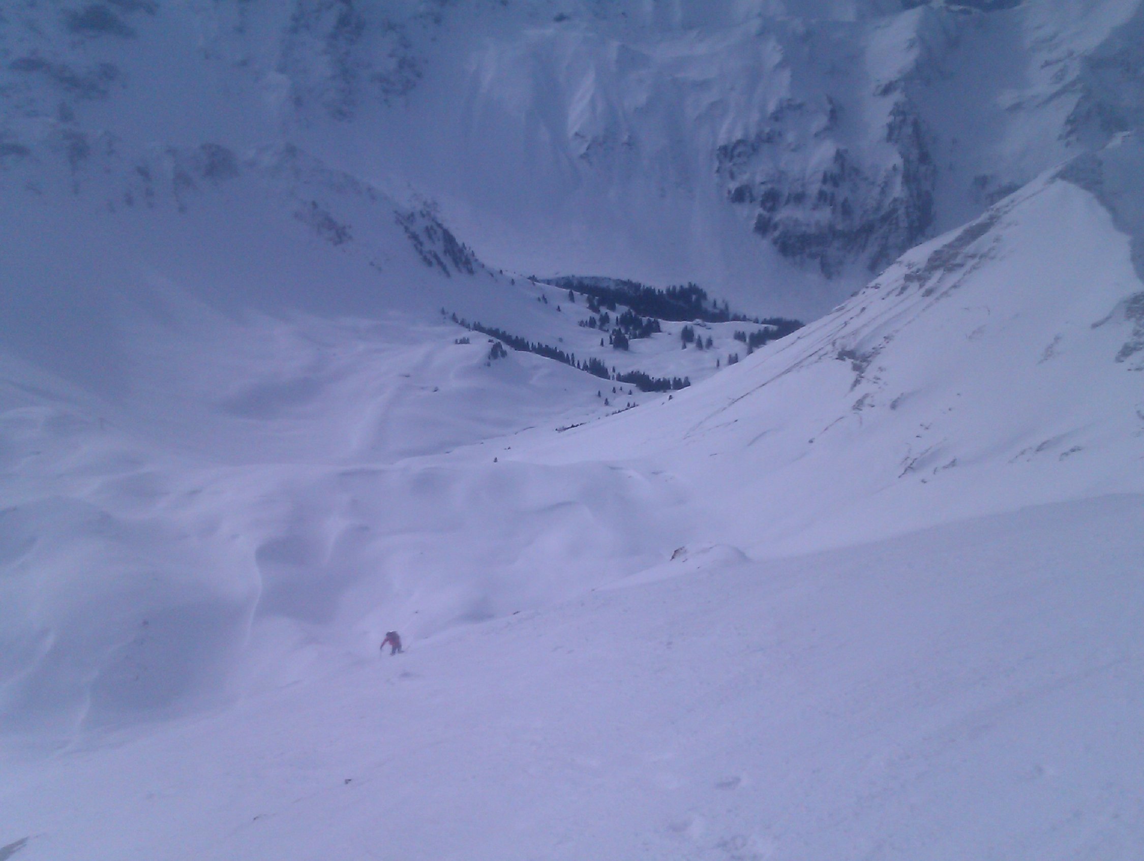 Aus den Nordcouloirs des Drümännlers hats Spontanrutsche, die noch keine 24 Sunden alt sind. Wir sind deshalb auf der Aufstiegsroute abgefahren und nicht in die Nordhänge gefahren. Am Abend hatte es dann aber eine Abfahrsspur von einem der Couloirs ohne Auslösung eines Schneebrettes.Die Lawine, die im Bericht Galmschiebe von heute im Scheerizug berichtet wird, muss mehrere Tage alt sein. Es sind alles überchneitte gefrohrene Nasschneeeisblöcke.