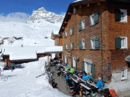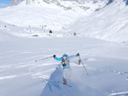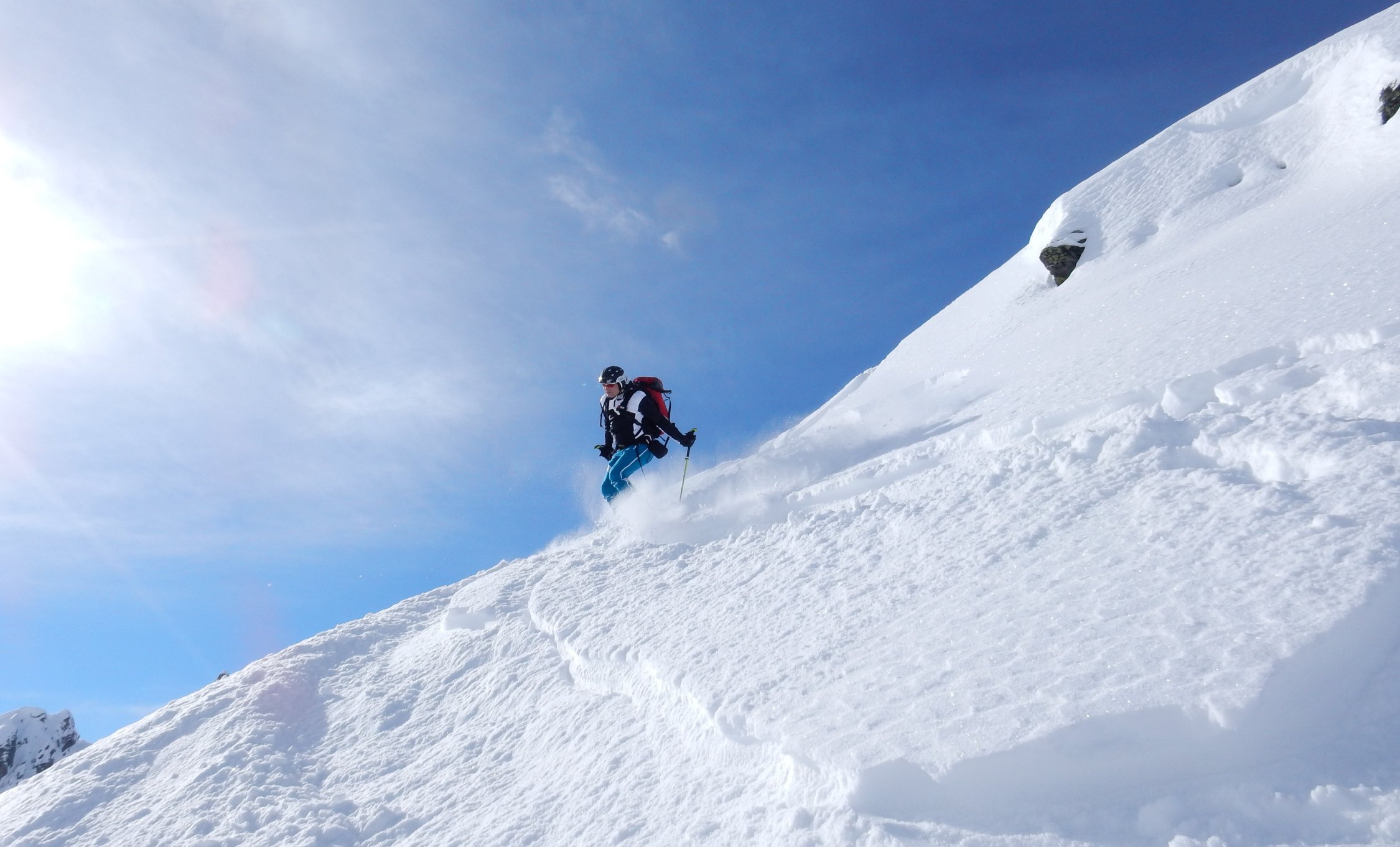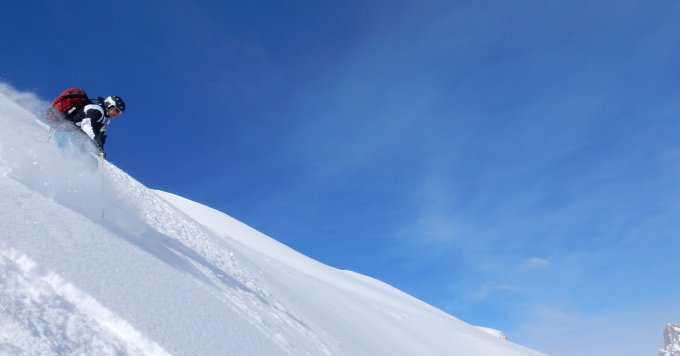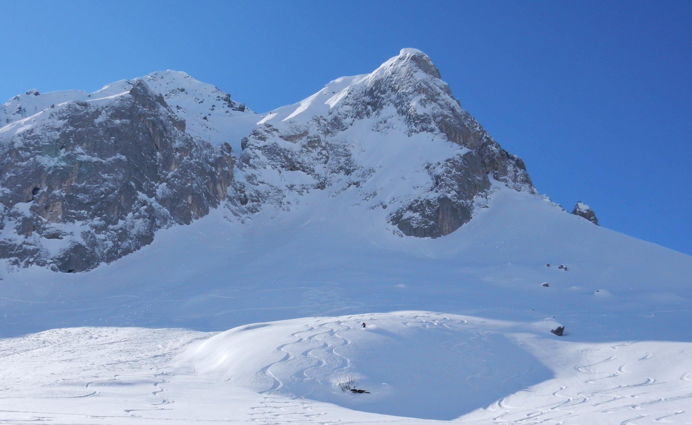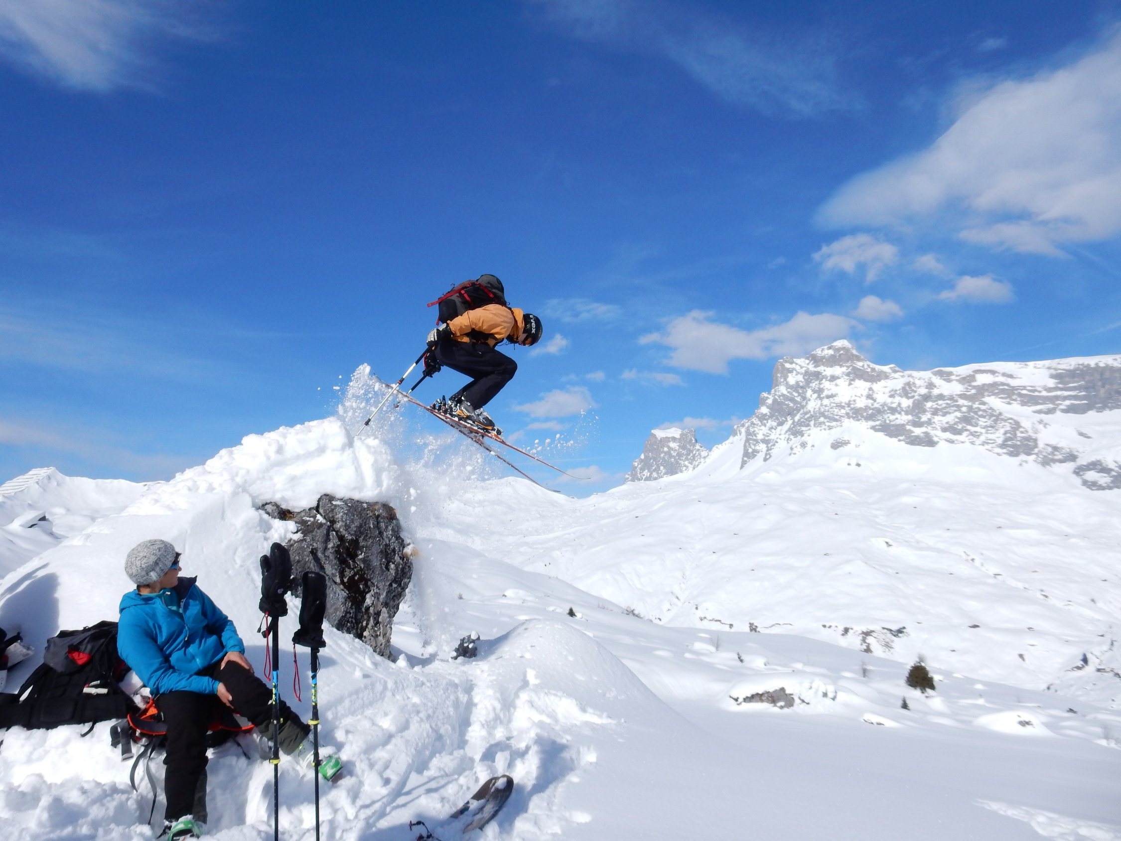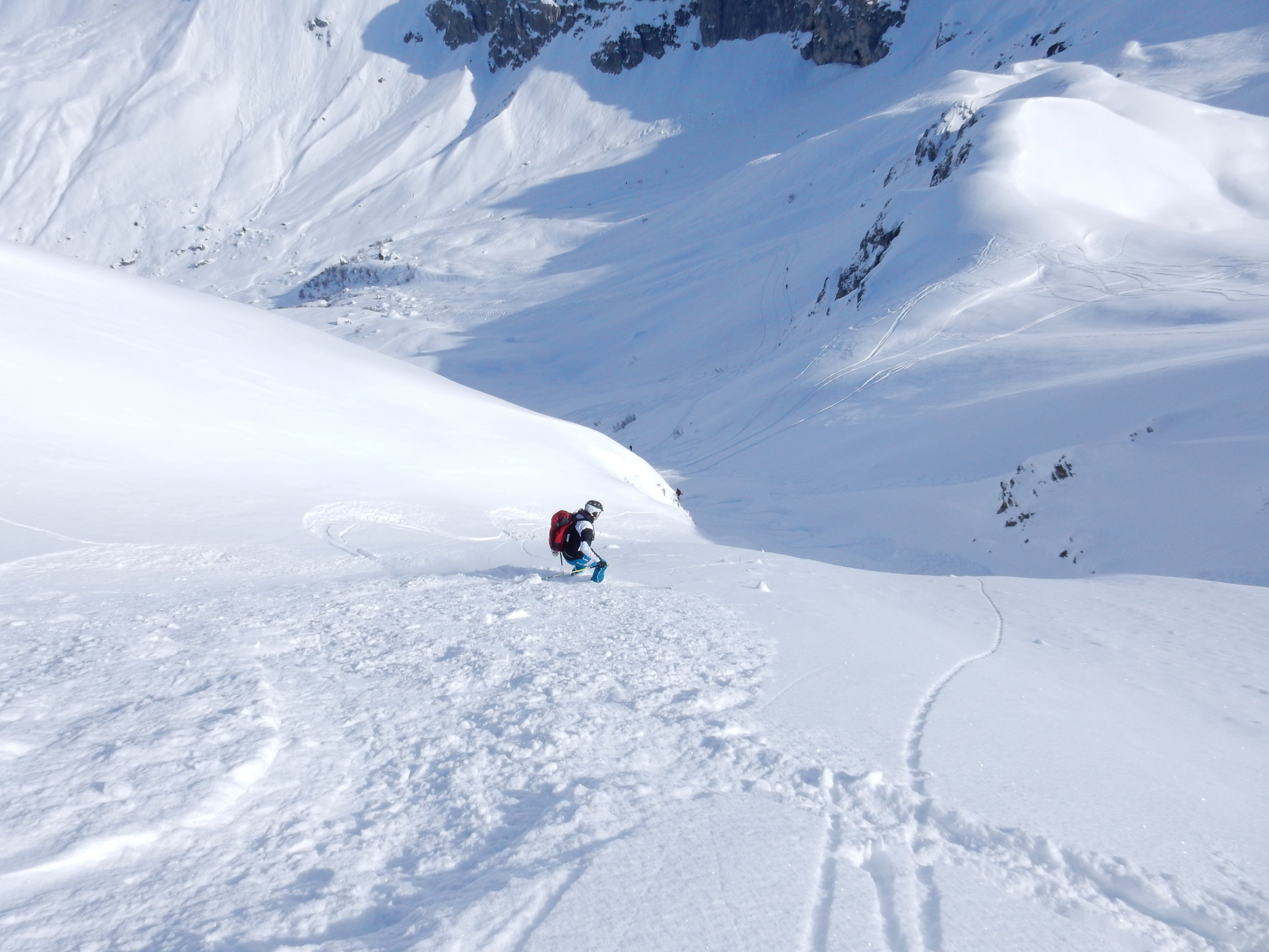 Gut eingeschneit, bis 20 cm Pulver auf harter Unterlage. Vom Vortag schon einige Spuren "Genügend Kicker für die Jungen"