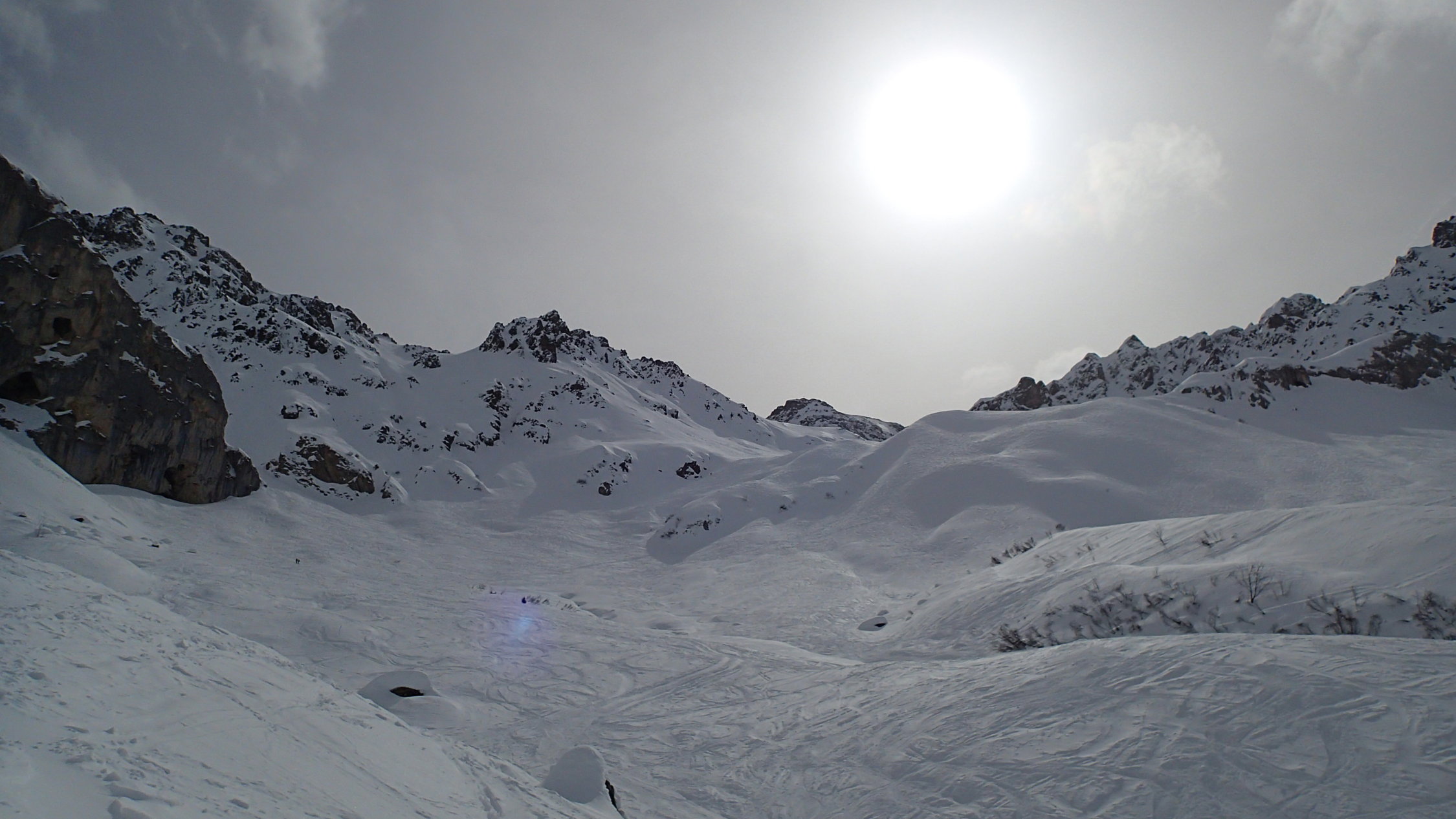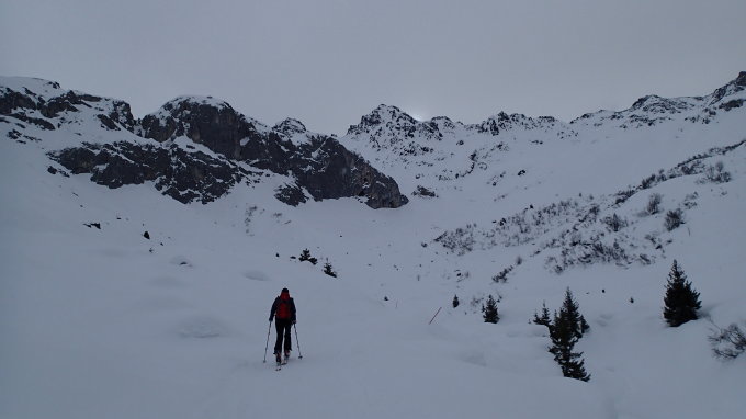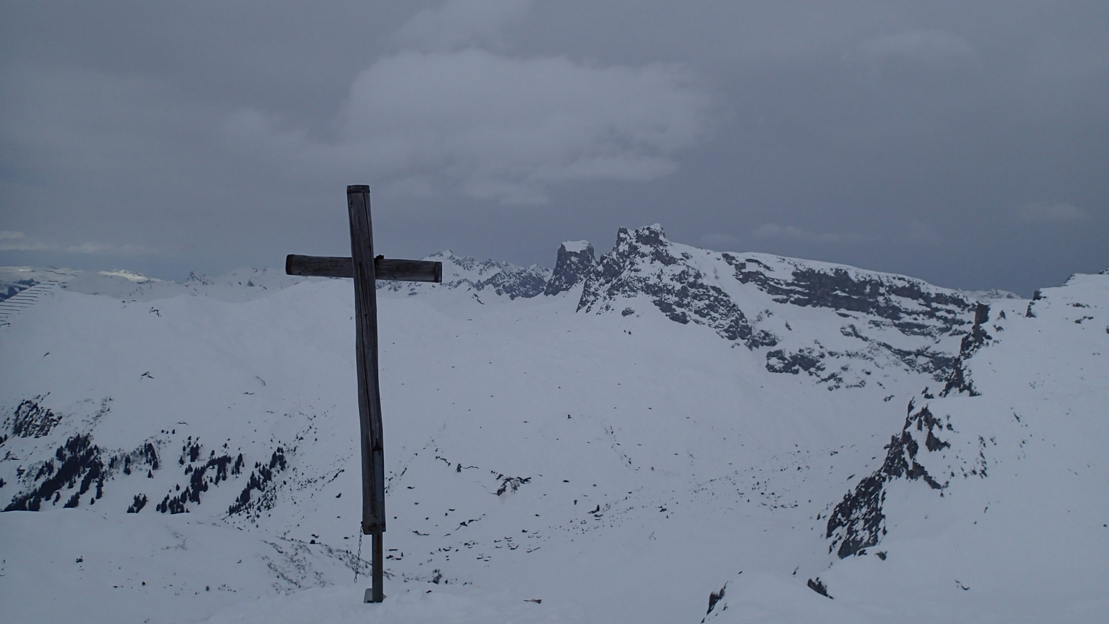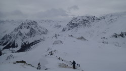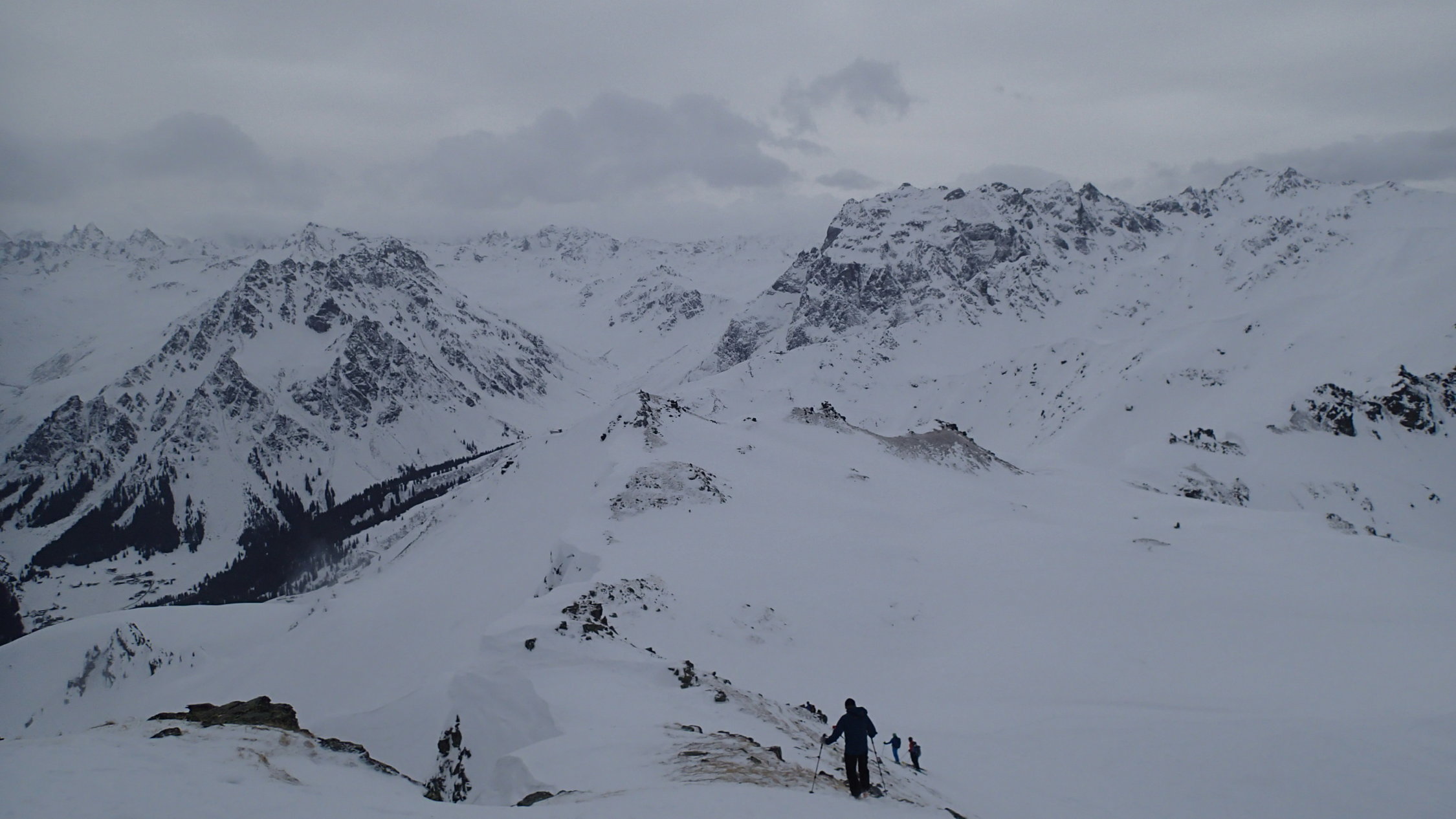 St. Antönien ist recht gut eingeschneit. Das Gebiet wird auch bei bescheidenen Verhältnissen wie heute viel begangen. Es hatte eine gute Spur bis fast auf den Gipfel. Die Abfahrt ging so. Auf einer sehr unruhigen Unterlage mit etwas Neuschnee konnte man ein paar Bögen zeichnen, und die Sicht wurde gegen Mittag wieder etwas besser. Mit den angekündigten Schneefällen werden sich die im Führer beschriebenen besten Pulverschneeverhältnisse sicher wieder einstellen...