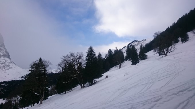 Gegen 8:15 Uhr bei ca 7°C und einigen Föhnböen ab Schwarzwaldalp gestartet. Der Schnee war unten durchfeuchtet und in Waldnähe mit allem möglichen Grünzeug überdeckt. Vorallem in den Aufstieg und Abfahrtsspuren.