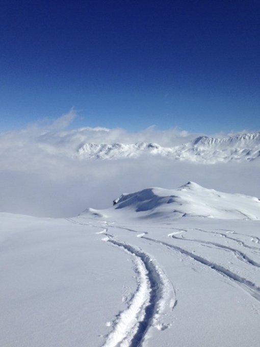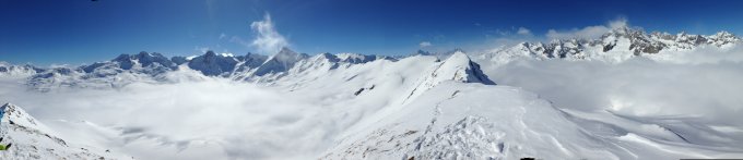 Ab PP aufstieg mit Ski möglich.Unten ca 10cm Neuschnee um so höher um so mehr.Bis ca 2300Hm waren die Abfahrtspuren von gestern? noch ein bischen erkennbar nachher waren sie komplett zugeschneit und sicher 20-30 cm neuschnee und mehr.Bedeckt bis ca 2500Hm nachher mehr oder weniger Stahlblau.Es waren ca 20-30 Leute unterwegs es hat also noch Platz für Spuren.Für so einen Tag wahr recht wenig los.Fast Windstill sogar auf dem Gipfel.Pulver GUT!