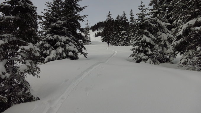 Vom "Gitziloch" weg 10 cm Pulverschnee der mit der Höhe nach oben zunahm. Durch die lichten Wälder wie im Hochwinter zur Silvesterzeit empor geschwebt. In den oberen Bereichen kam der Föhn ist Spiel, der störte aber nicht wirklich. die Sicht war ja länger je mehr etwas eingetrübt. Schöne Schwünge begleiteten uns wieder zum Ausgangspunkt. Im unteren Bereich ab 1400 M. wurde der Schnee schnell pappig. erneut angefellt und über den Sattelpass auf den Bärenturm (1798m). In unverspurten Hängen lässt es sich wunderbar kurven.