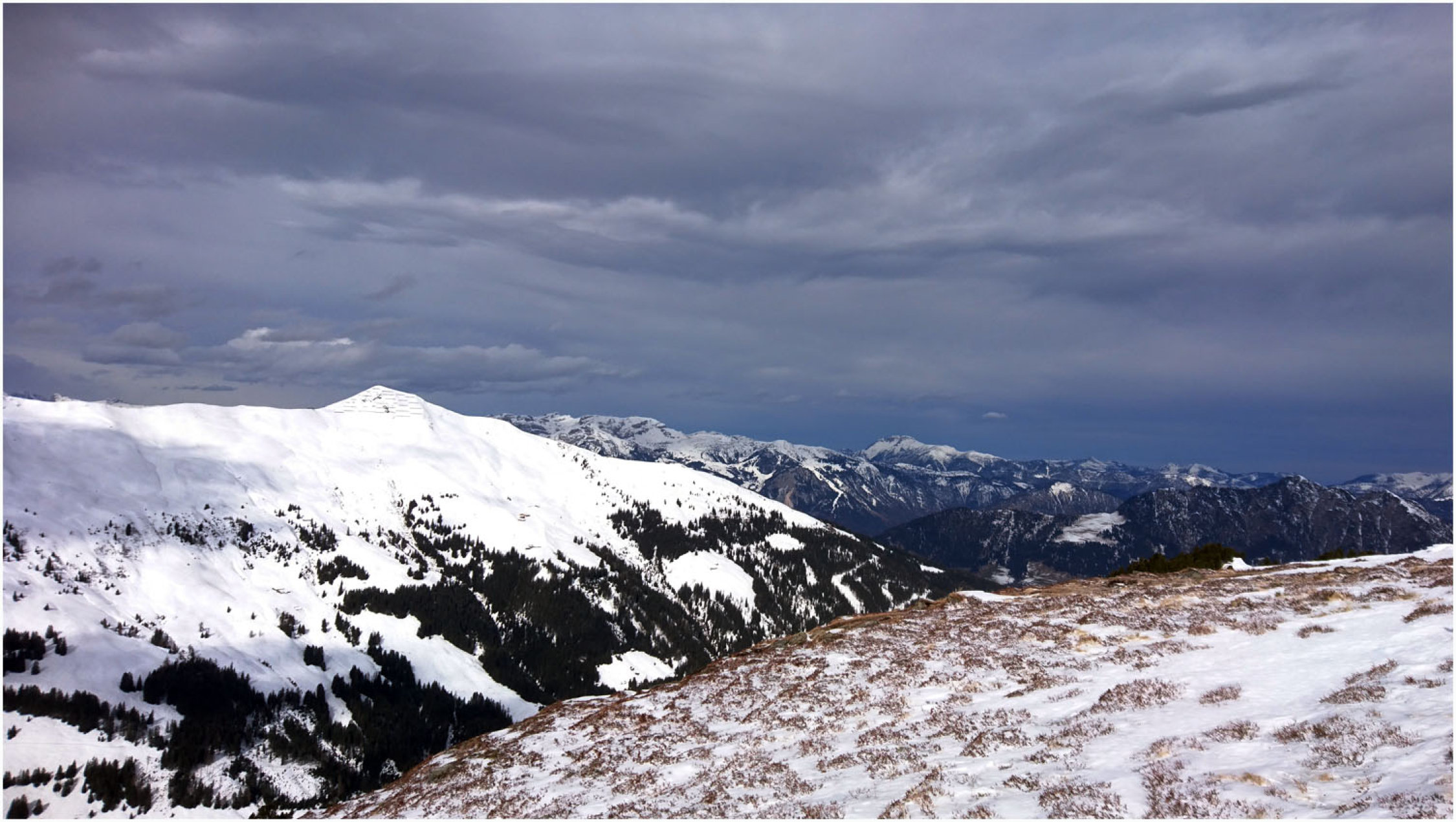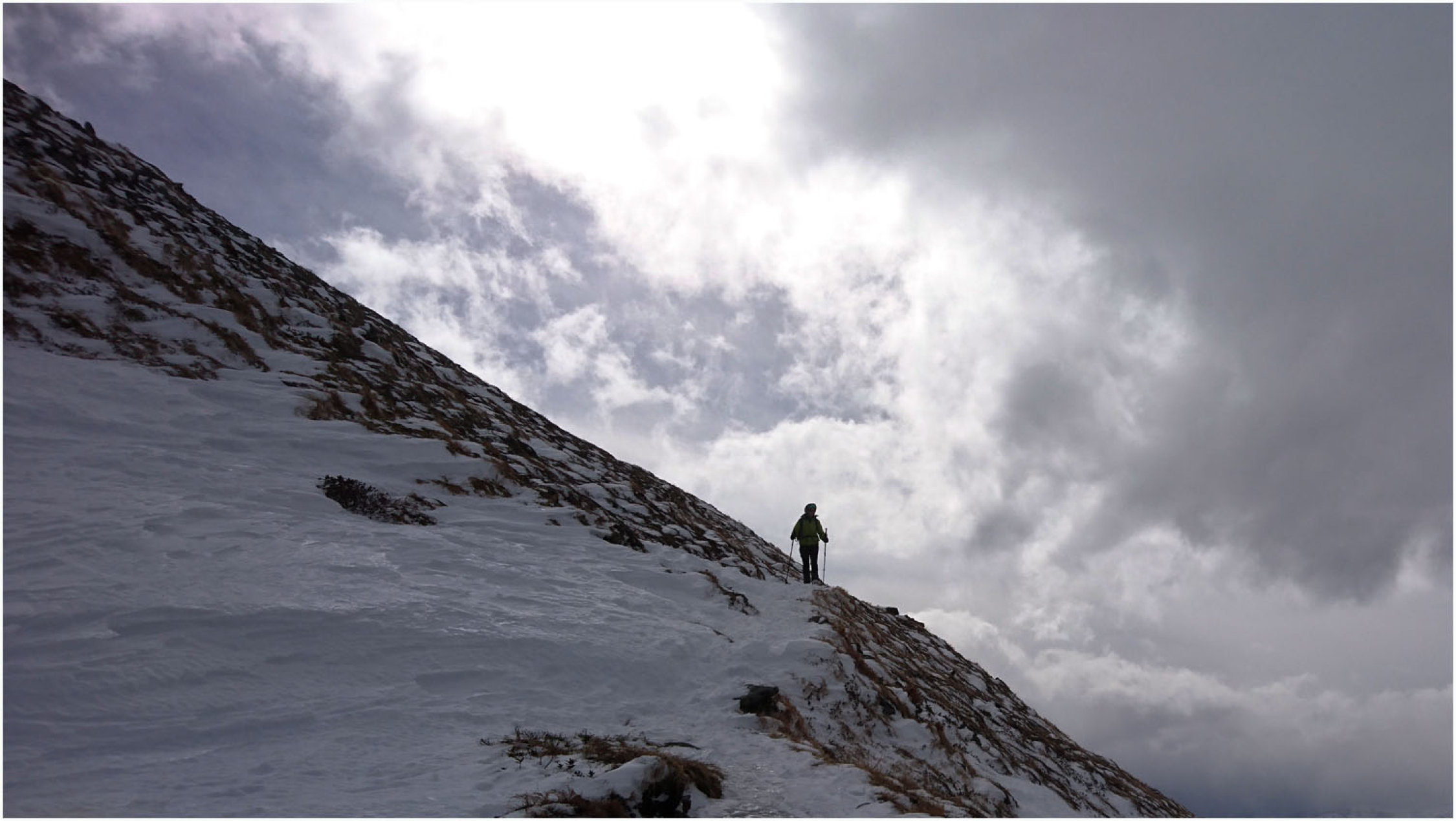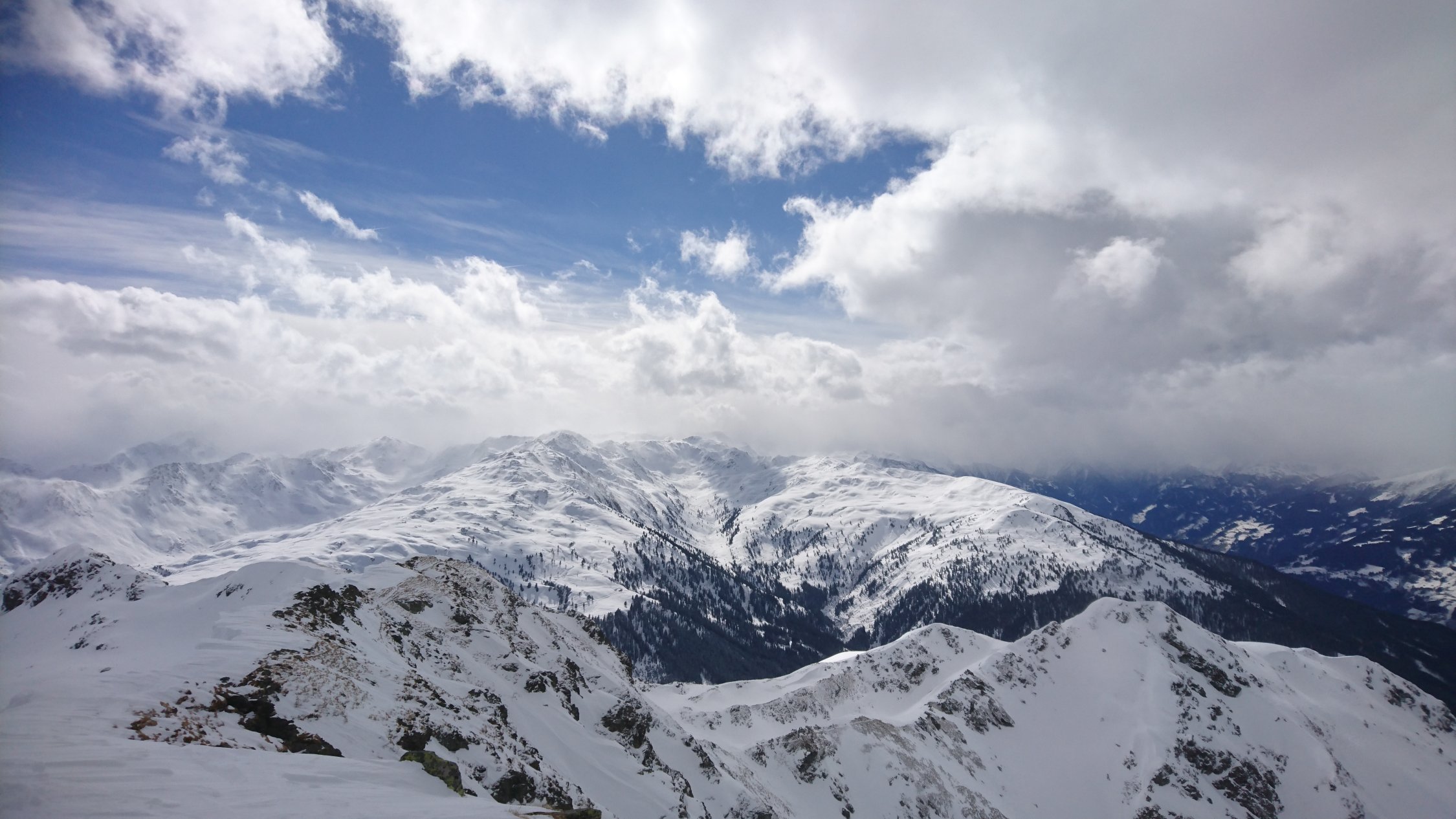 Auf der ganzen Tour insgesamt recht rustikale Verhältnisse. Bis Greitalm festgefahrene, wenn auch dünne Schneedecke. Ab dann neue Spur angelegt, bereits bis Farmkehram stark wechselnde Bedingungen, zwischen einem halben Meter Triebschnee und Harsch war alles dabei. Ab Farmkehralm mehrheitllich verblasen, teilweise stark eingewehte Mulden, dann wieder Harsch und/oder kein Schnee. Ab Grat ausser ein paar aufgewehten Stellen alles abgeweht, Sommerweg bis etwa 100Hm unter dem Gipfel gut begehbar, stellenweise eisig. Letztes Stück dann Schneestapferei, auch hier teilweise grundlos, dann wieder Harsch.